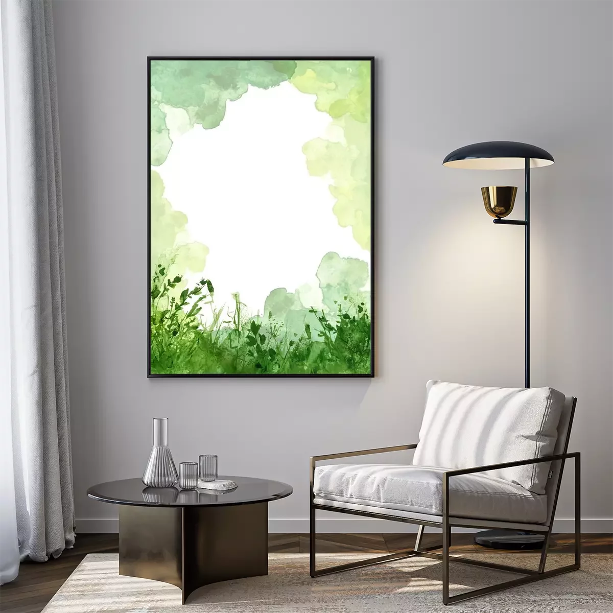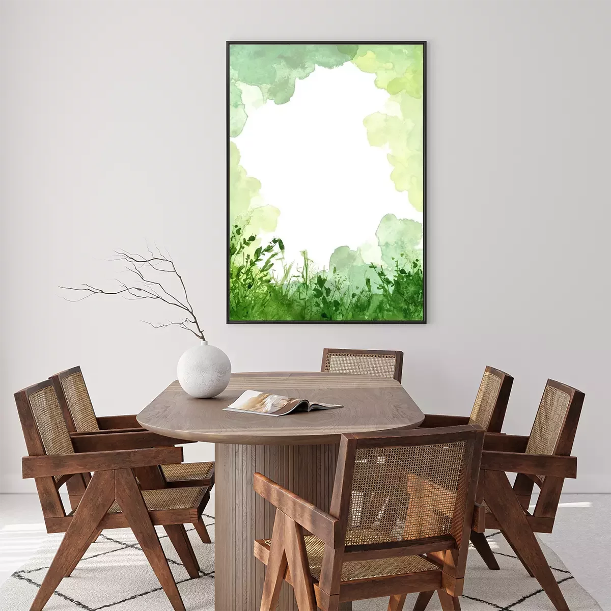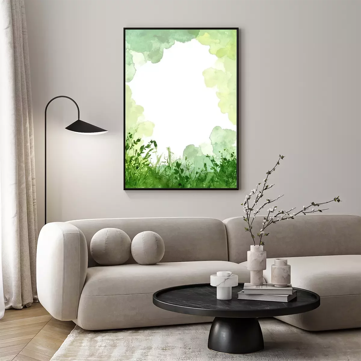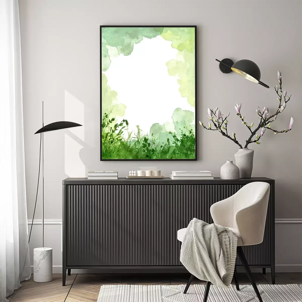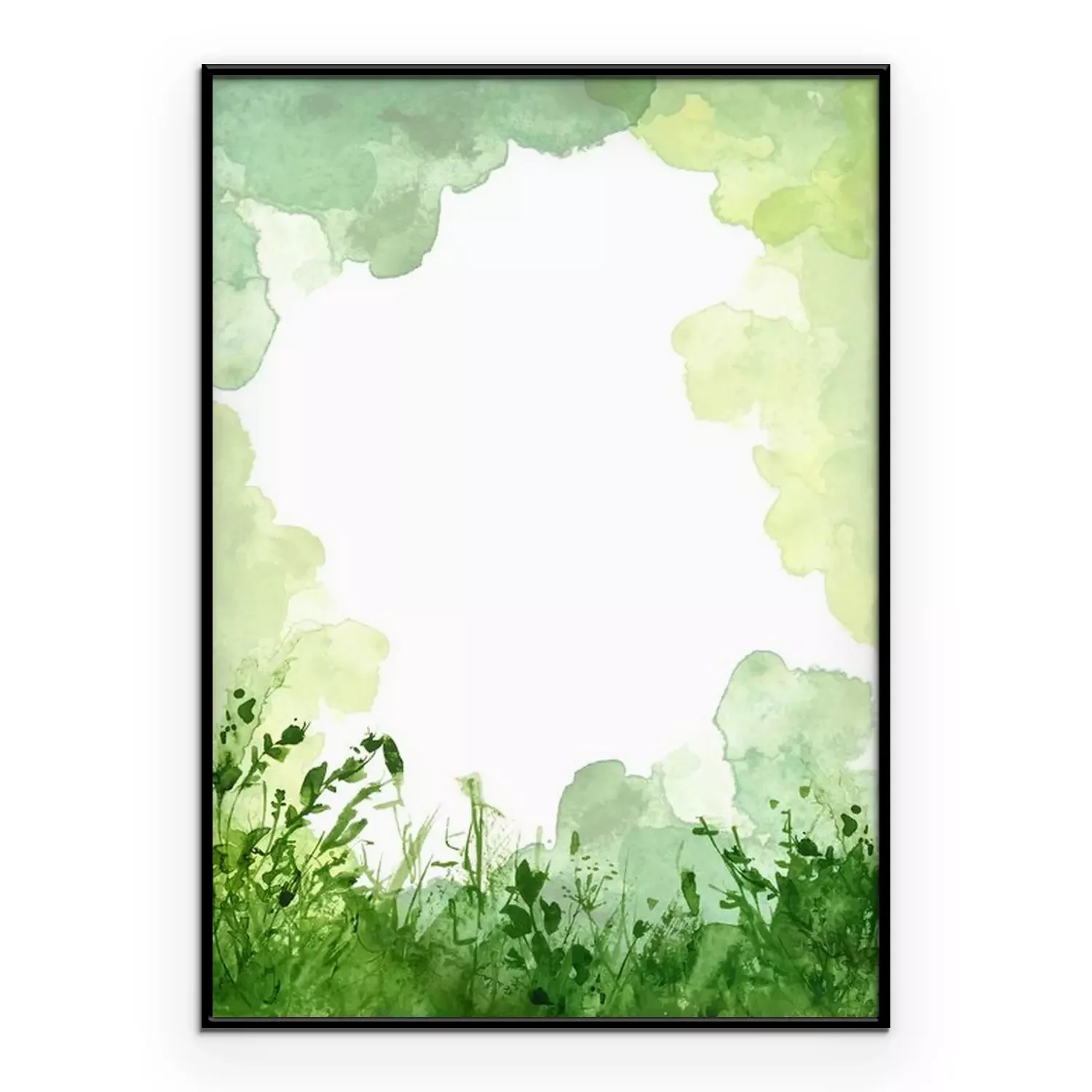 Poster Watercolor illustration. background with  floral pattern - grass, wild plants of green color. Watercolor card, frame, postcard, invitation. green natural, organic, bio, eco label.