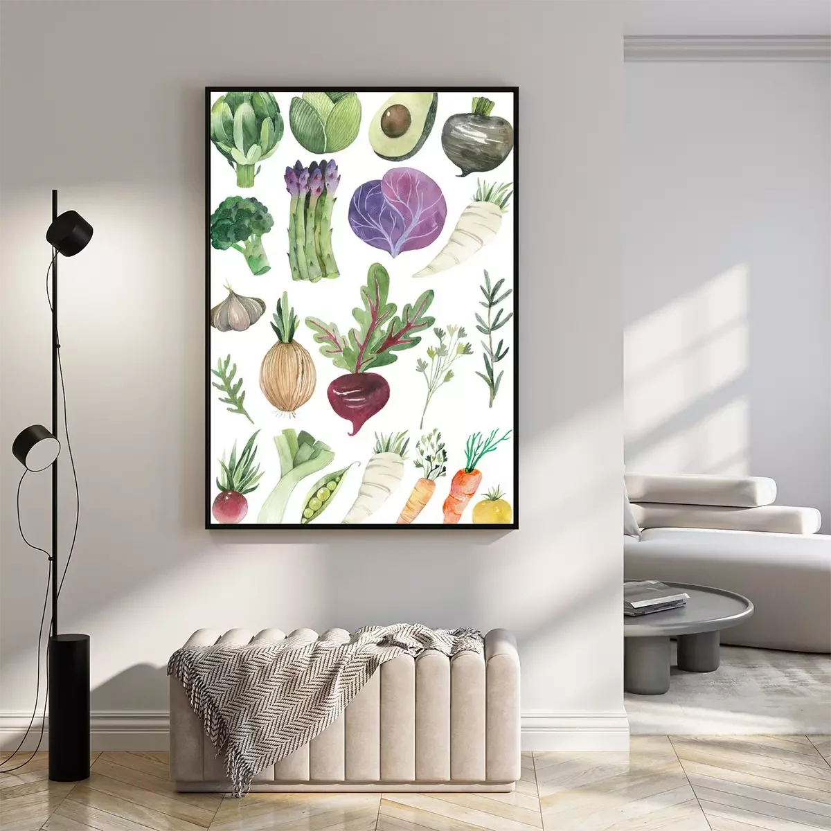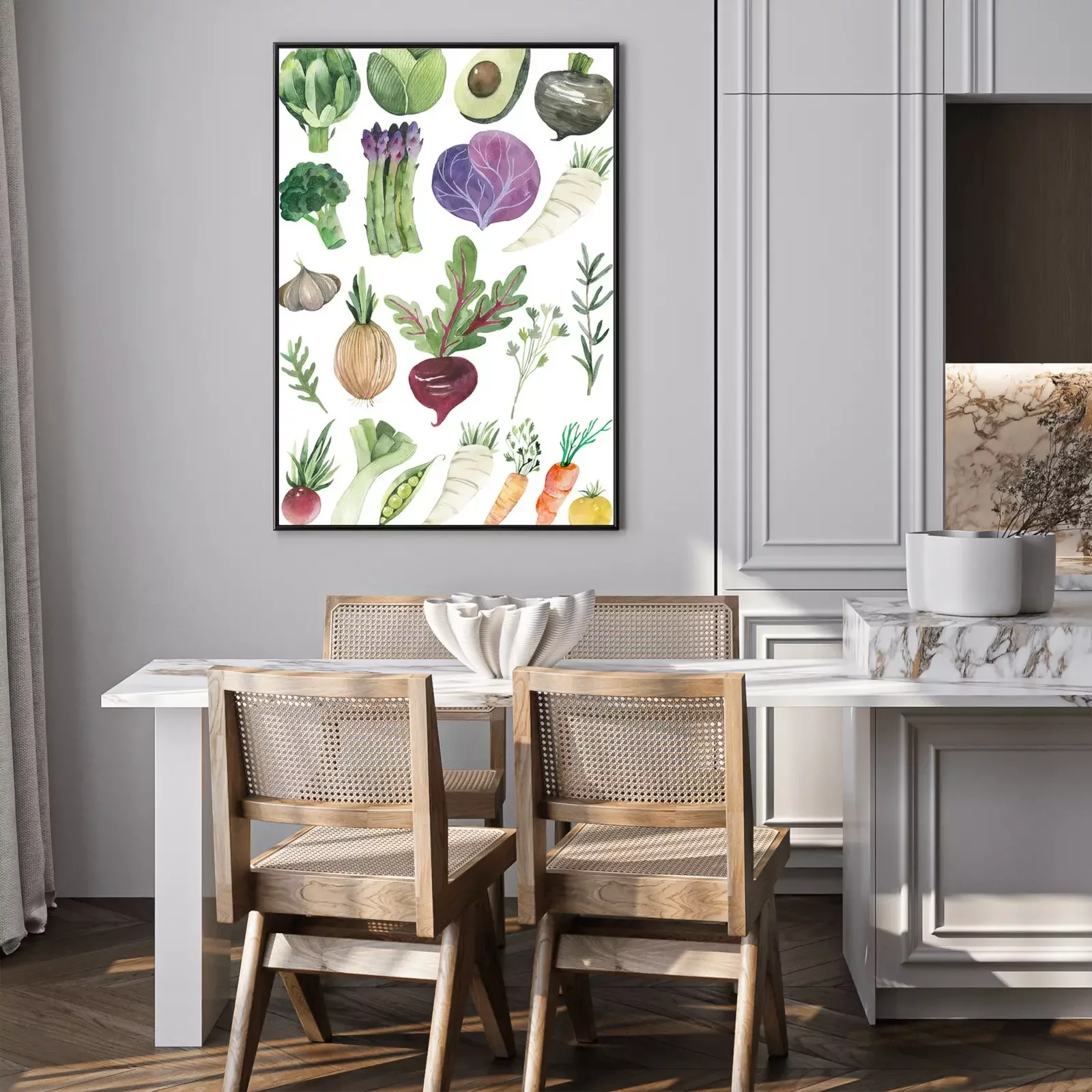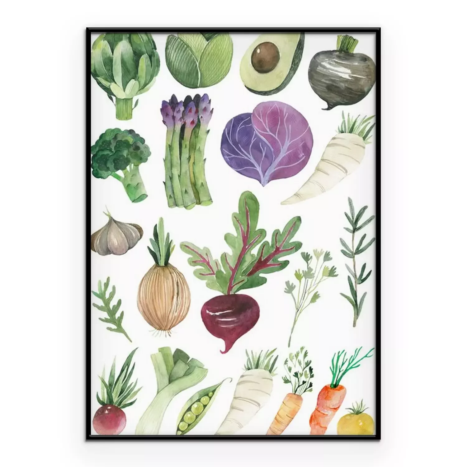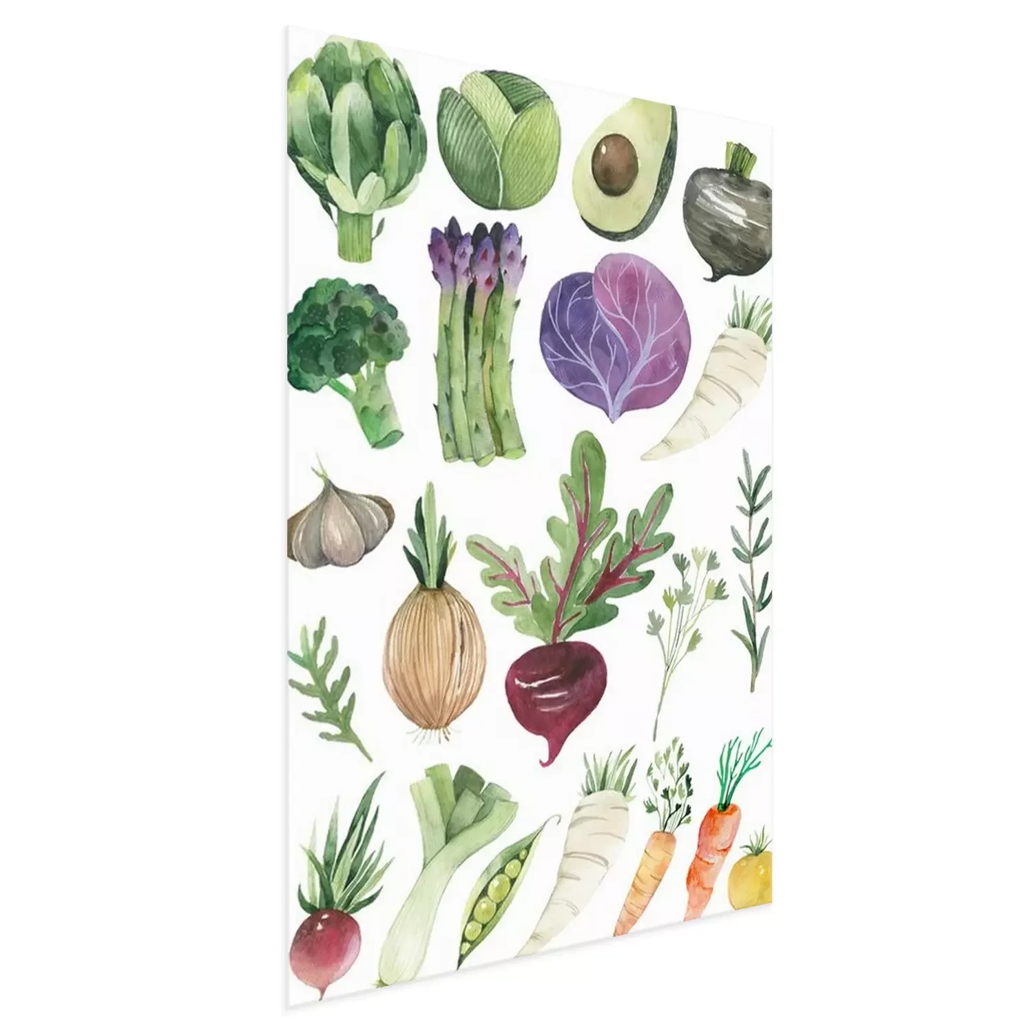 Poster: Watercolor painted collection of vegetables. Hand drawn fresh food design elements isolated on white background.