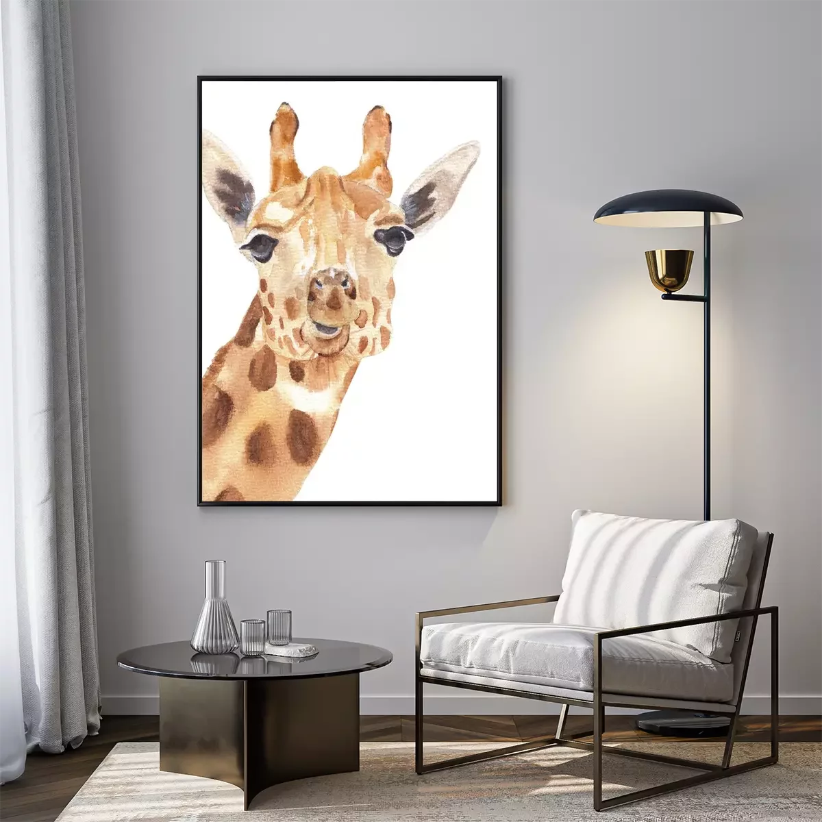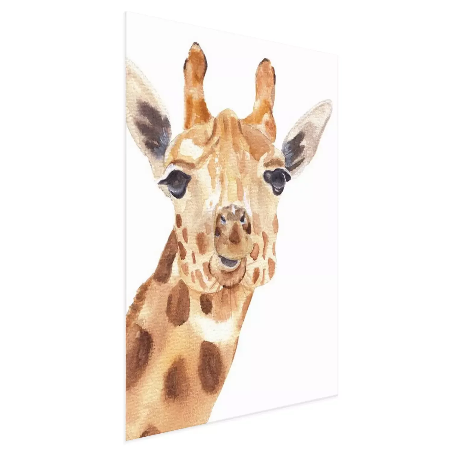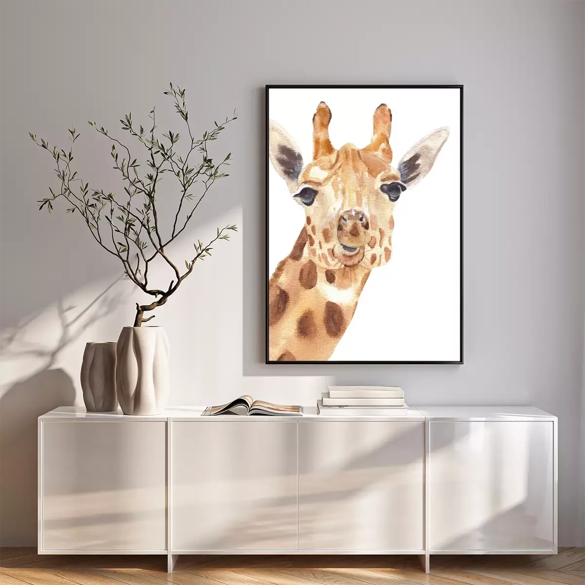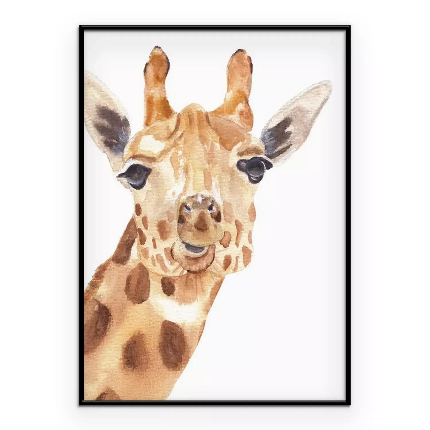 Poster: Watercolor safari animals portraits close ups: giraffe. Hand drawn hand painted posters great for wall design, pattern element, nursery decor, play room design