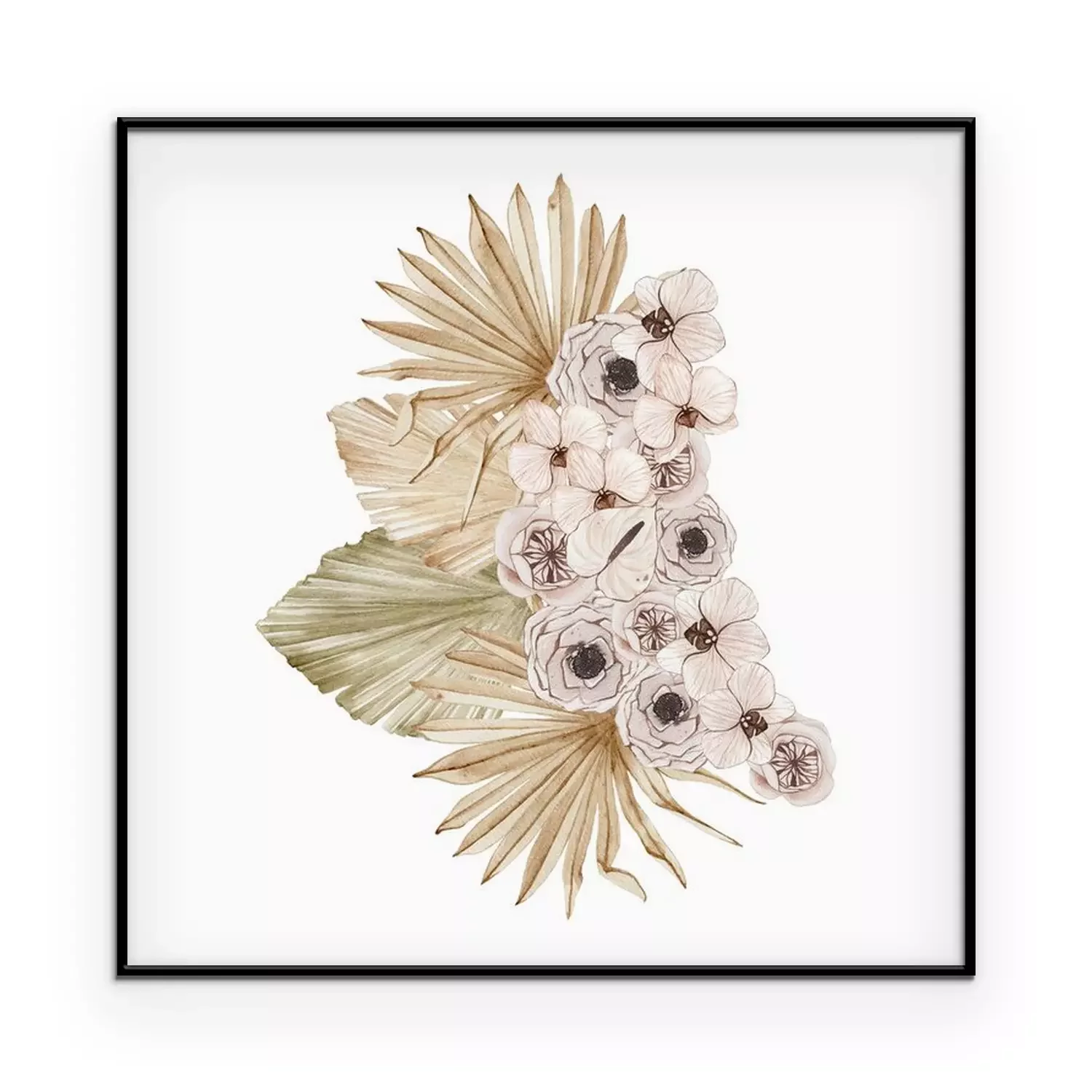 Poster Watercolor summer floral tropical bouquet with orchid rose flowers dried palm leaves isolated. Floral spring arrangement blossom boho wedding invitation save the date card illustration