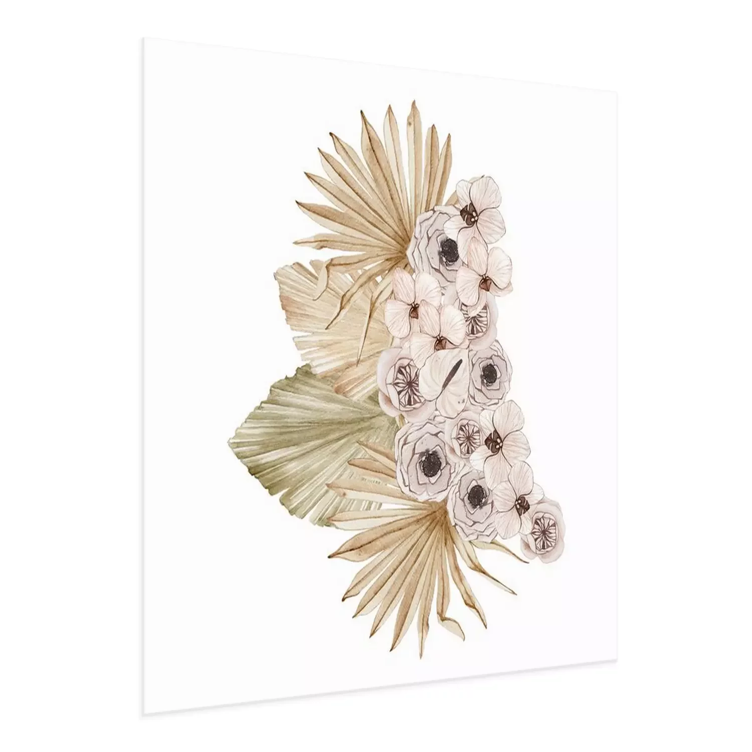 Poster: Watercolor summer floral tropical bouquet with orchid rose flowers dried palm leaves isolated. Floral spring arrangement blossom boho wedding invitation save the date card illustration