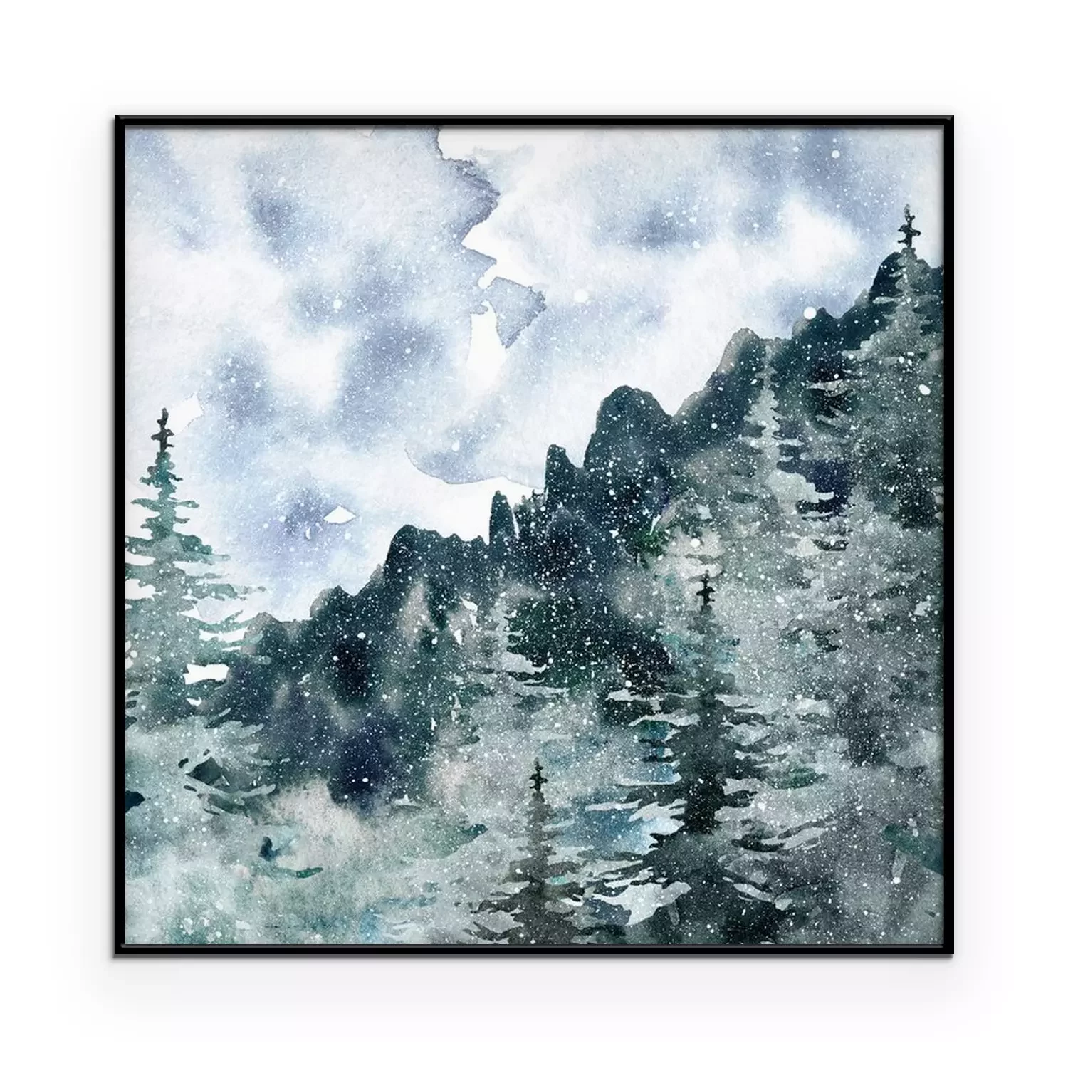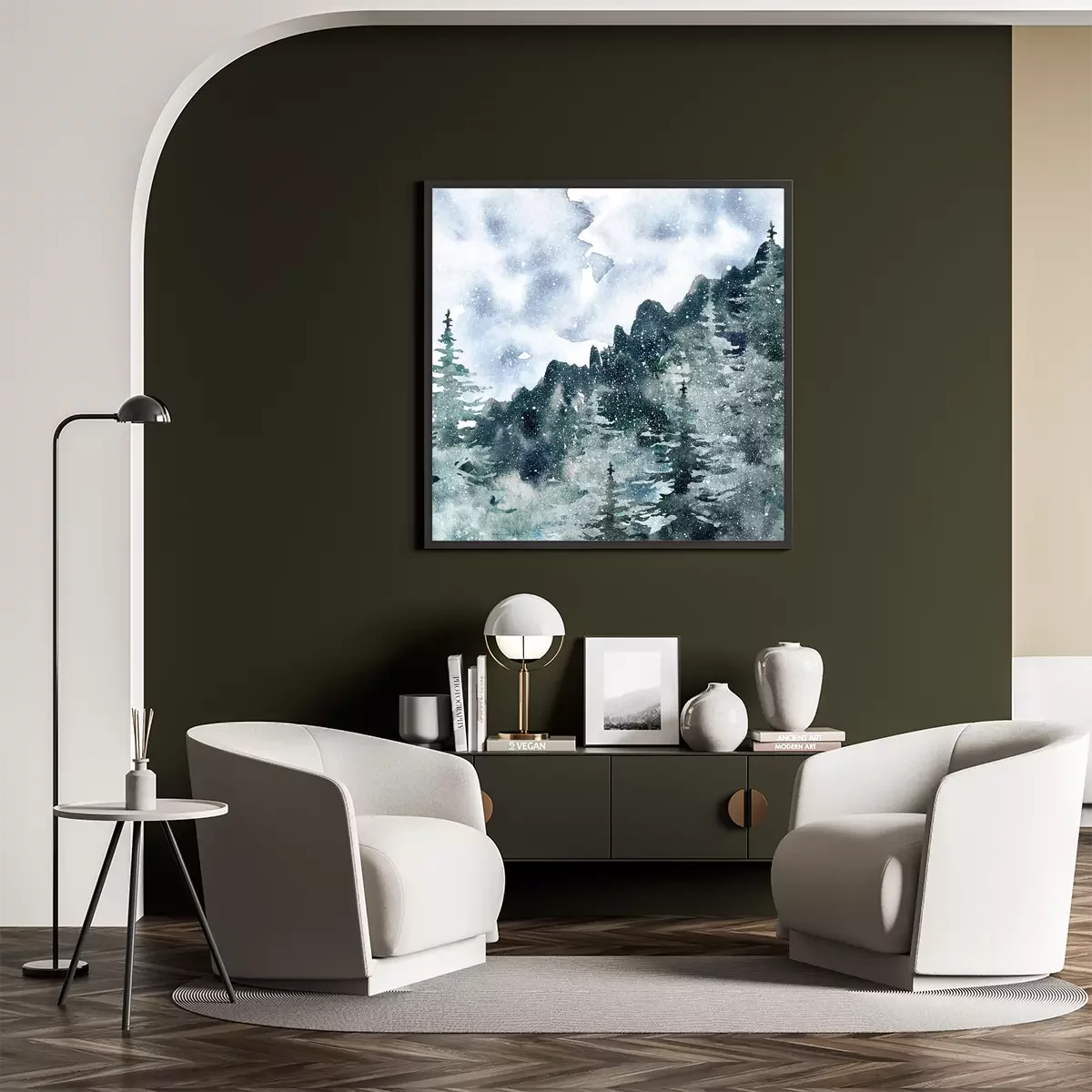 Poster Watercolor winter misty forest background with hand painted pine and spruce trees. Snowy mountain landscape with fog in neutral grey and dark green colors for Christmas and New Year cards design.