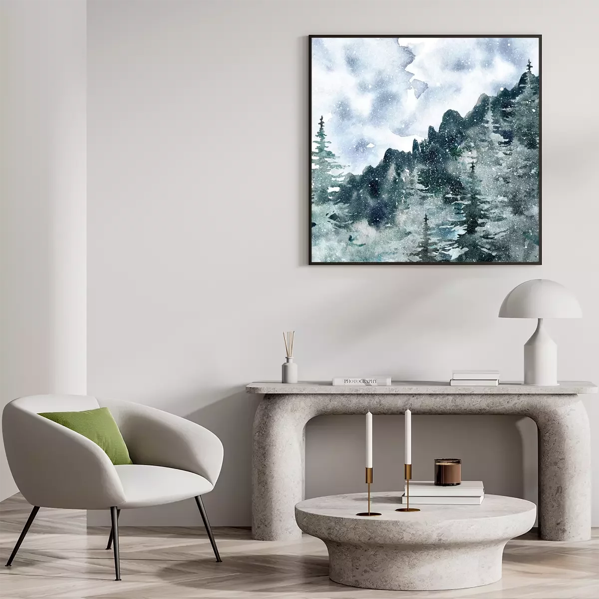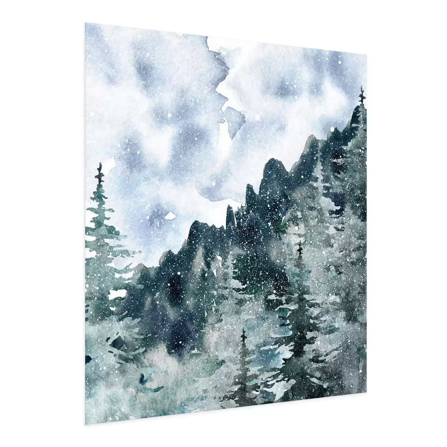 Poster: Watercolor winter misty forest background with hand painted pine and spruce trees. Snowy mountain landscape with fog in neutral grey and dark green colors for Christmas and New Year cards design.