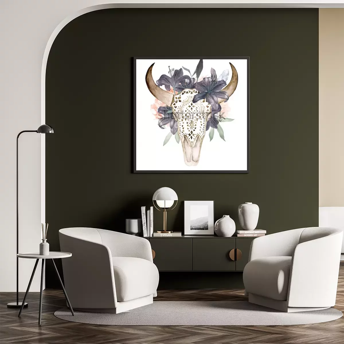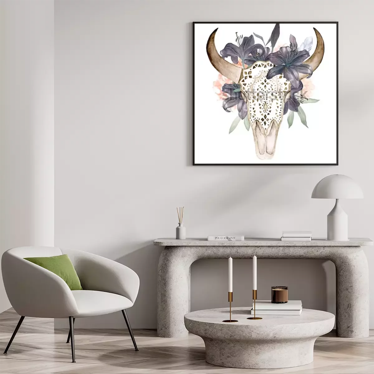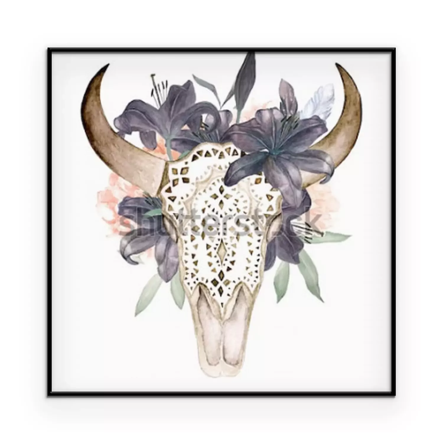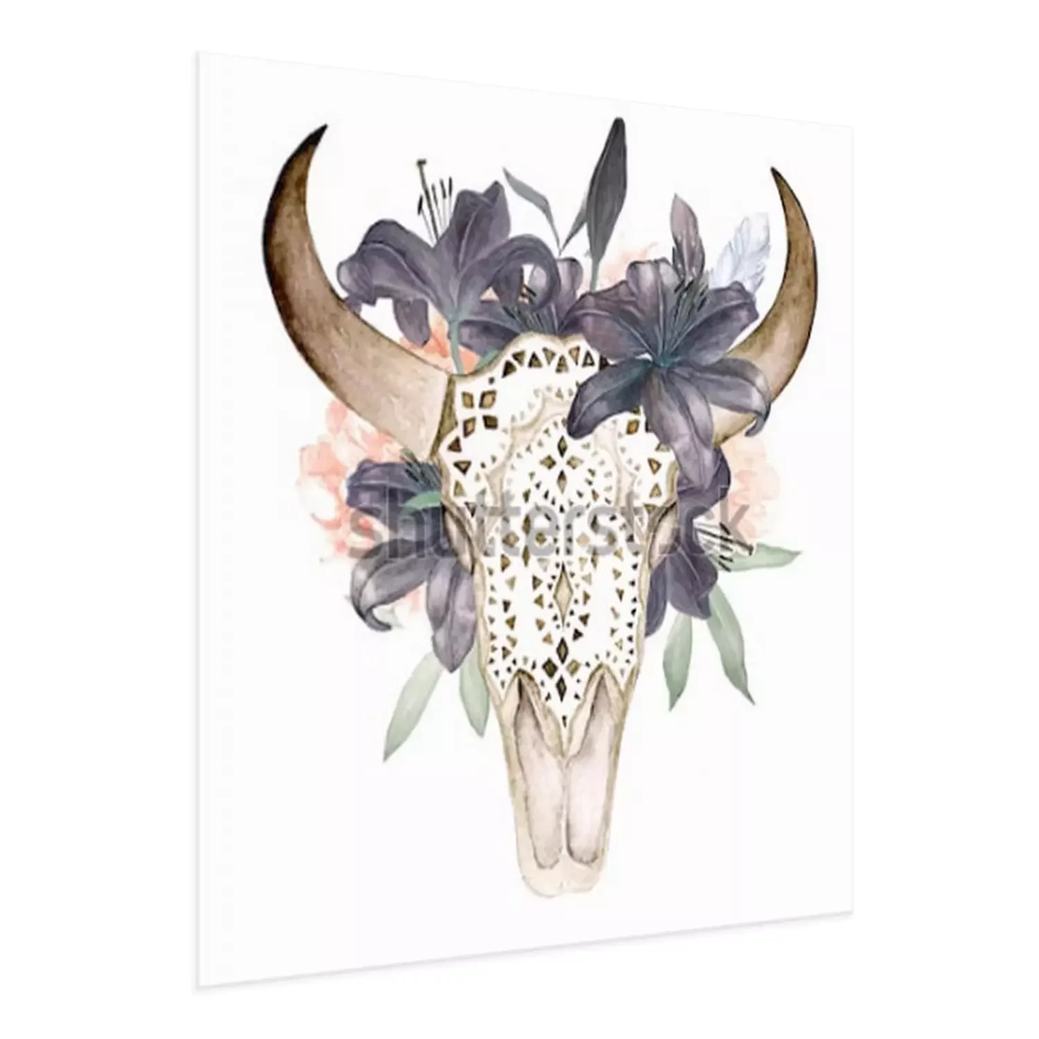 Poster: Waterverf geïsoleerd stierhoofd met bloemen en veren op witte achtergrond. Boho stijl. Sierschedel op zwarte achtergrond voor het verpakken, behang, t-shirts, textiel, posters, kaarten, prenten