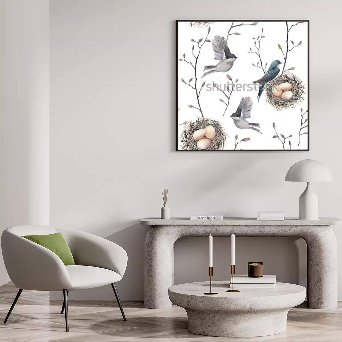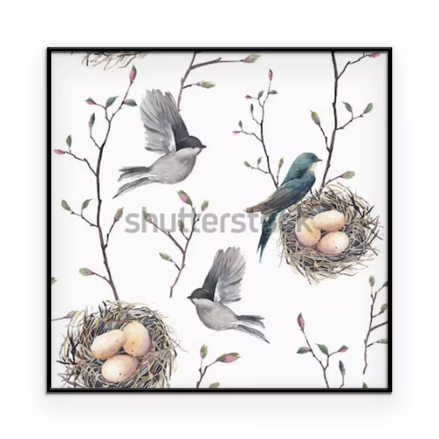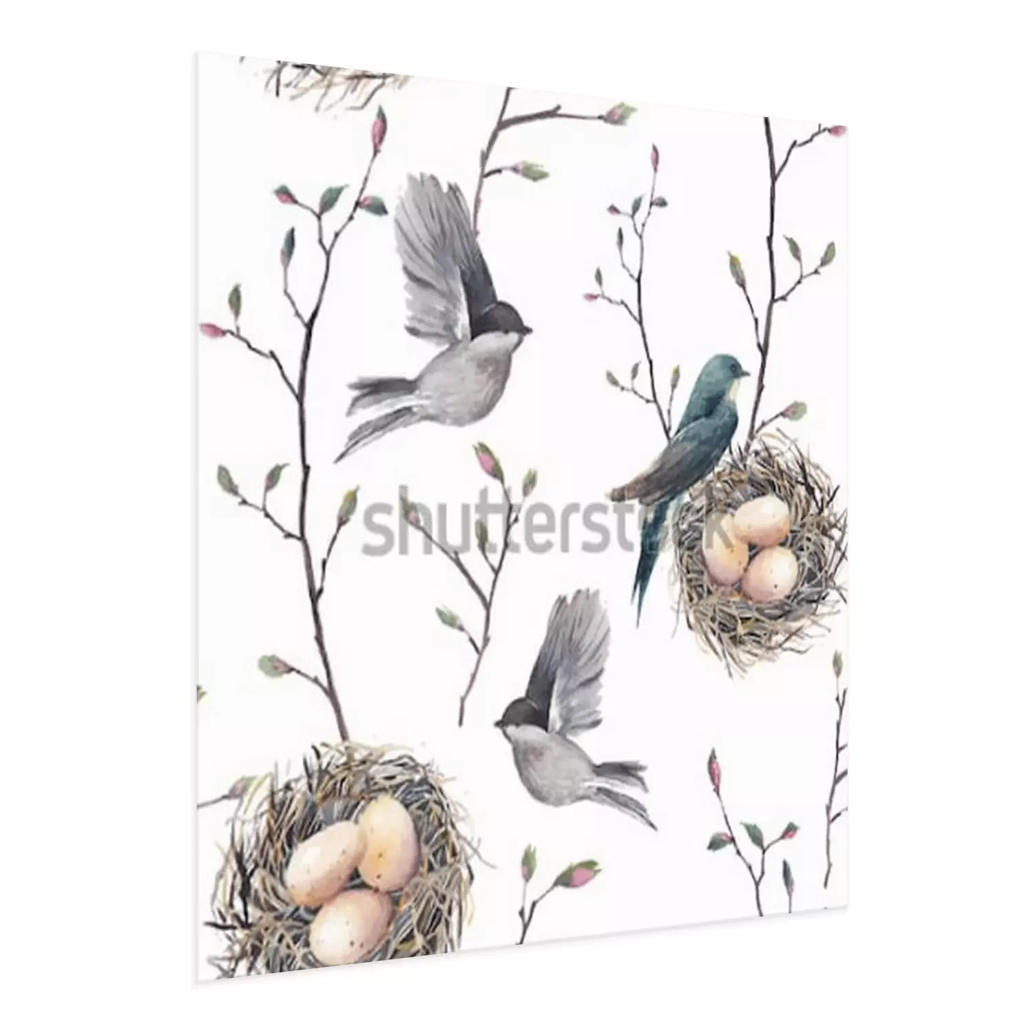 Poster Waterverf naadloos patroon met nest, vogels en boomtwijgen. Vector hand getrokken lente achtergrond. Vintage behang met zwaluw en eieren