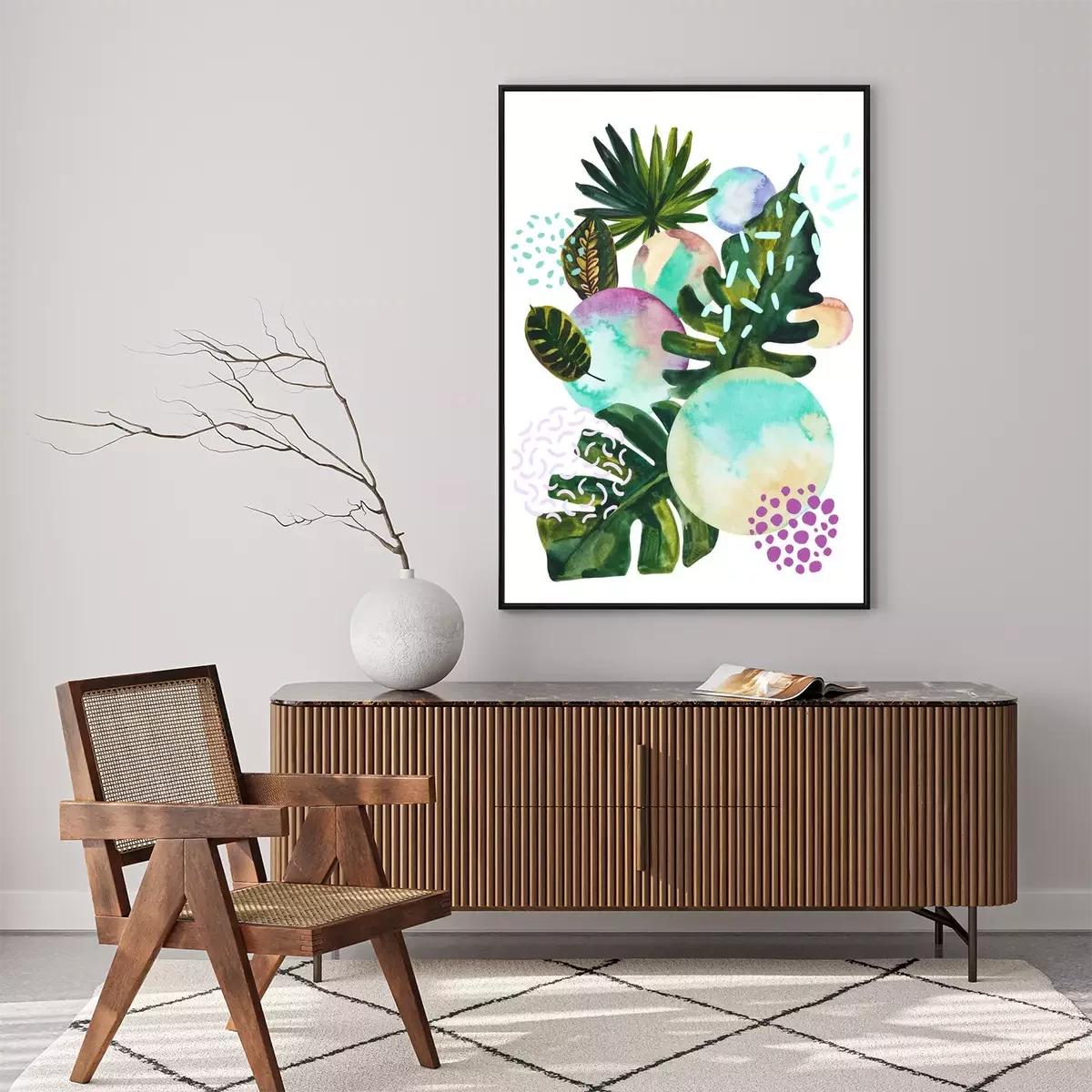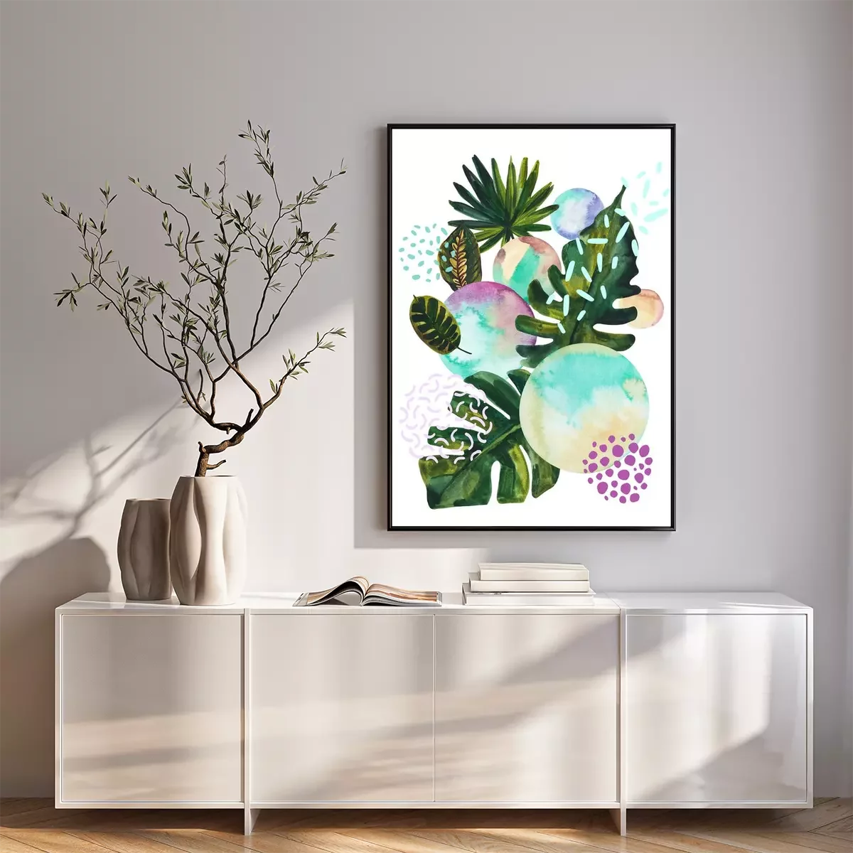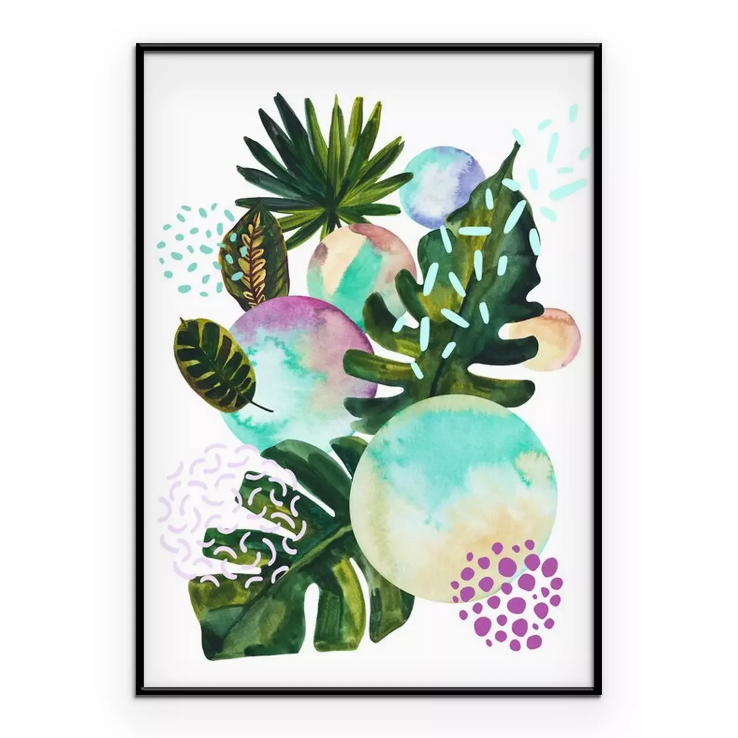 Poster: Waterverf tropische bladeren op geometrische achtergrond met waterkleur, krabbeltexturen.