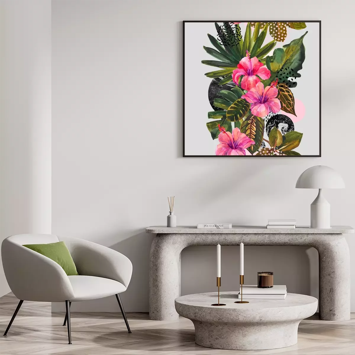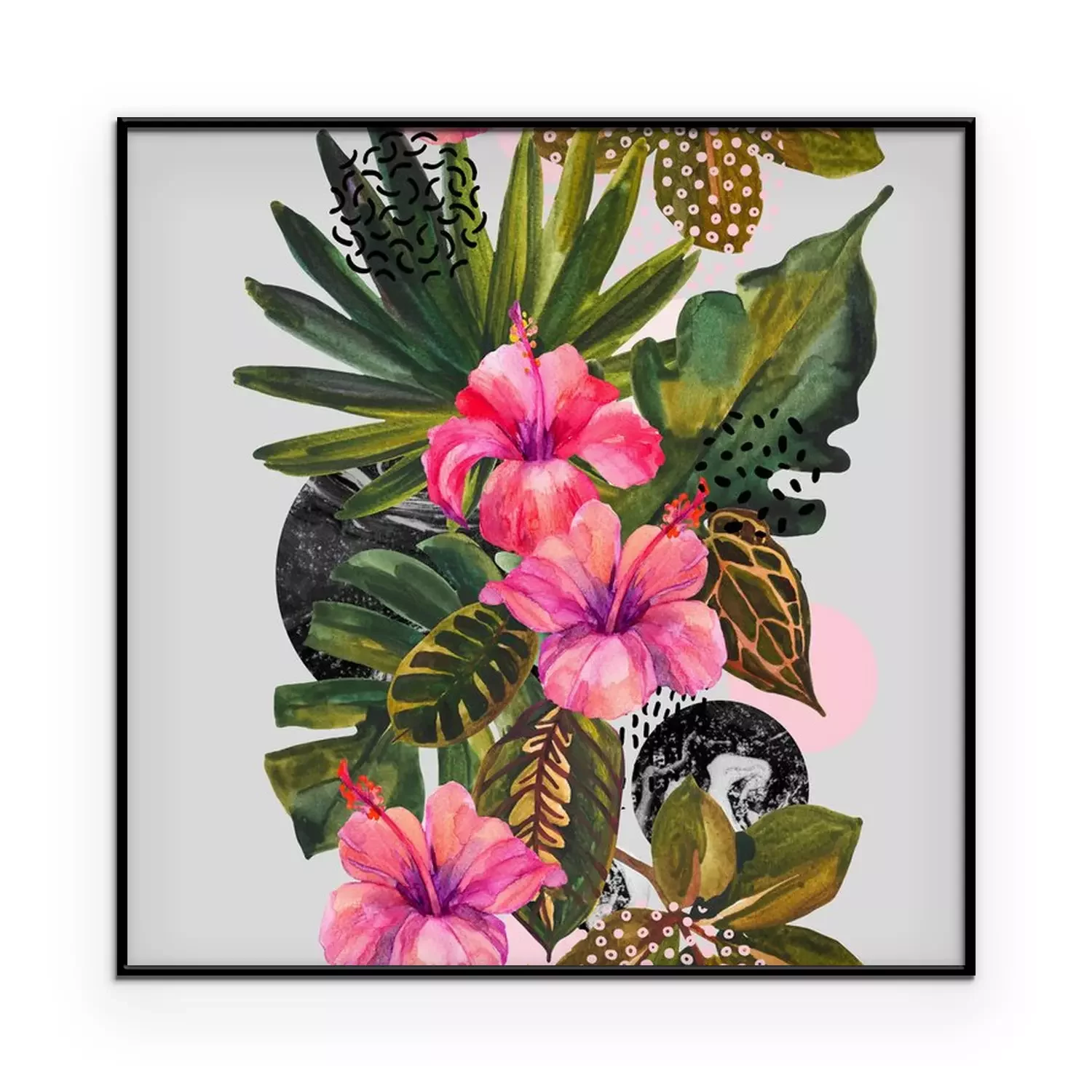 Poster: Waterverf tropische bloemen op geometrische achtergrond.