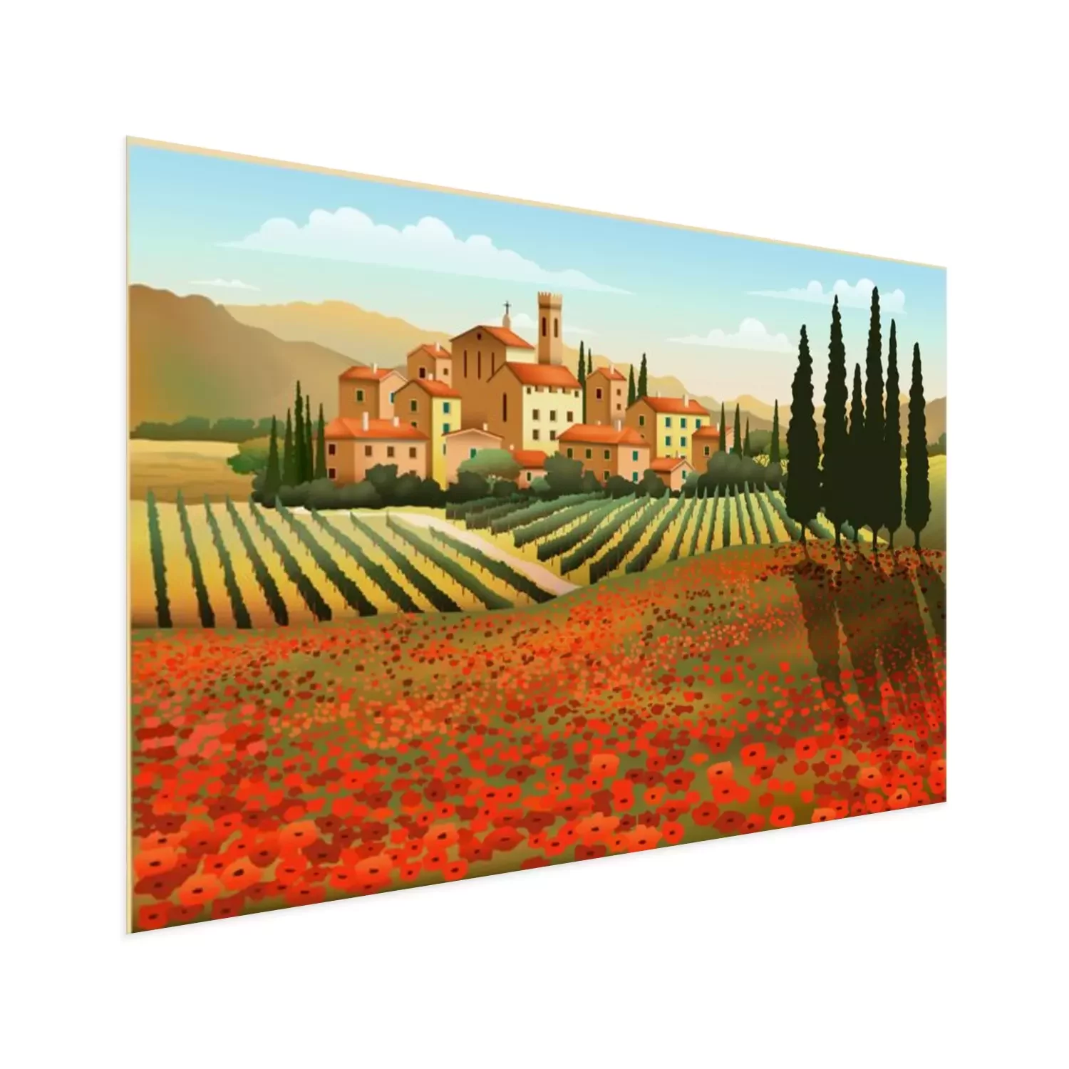 Kleurenillustratie met uitzicht op Toscane