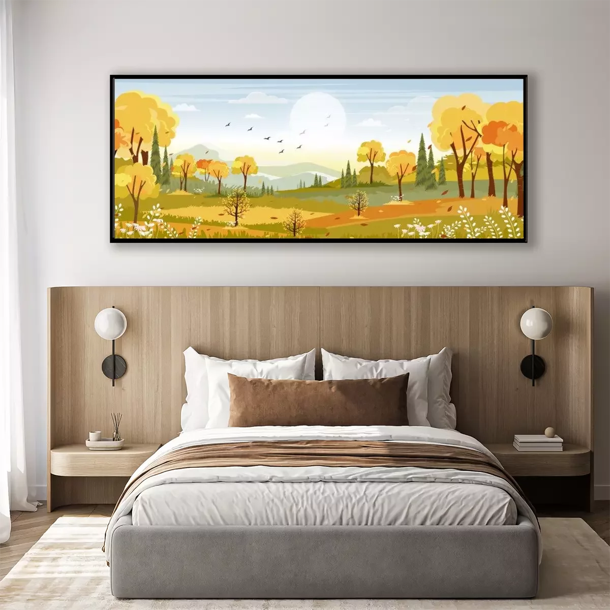 Fantasy panorama landscapes of Countryside in spring farm field, Panoramic of summer with blue sky, farm house, mountains, wild flowers  in green foliage. Natural background for banner