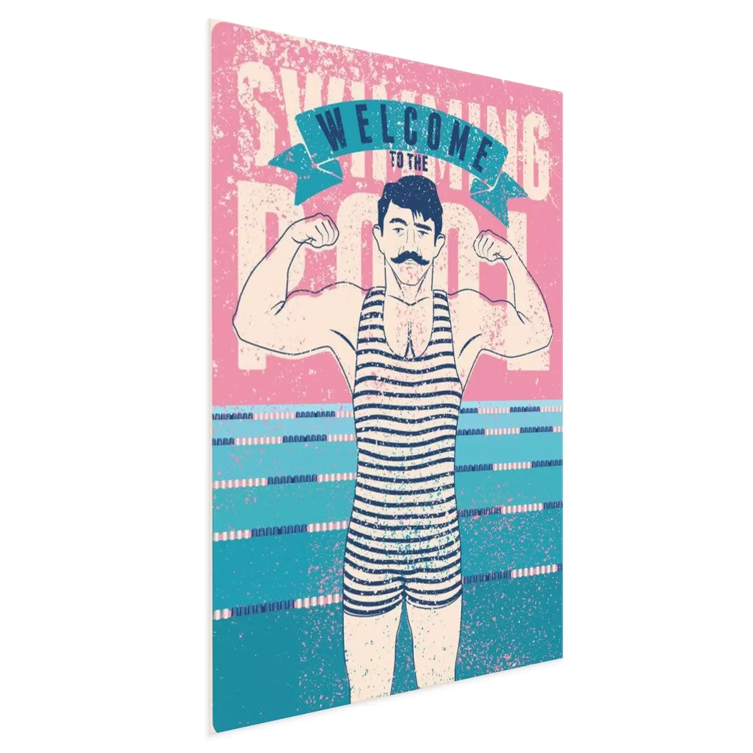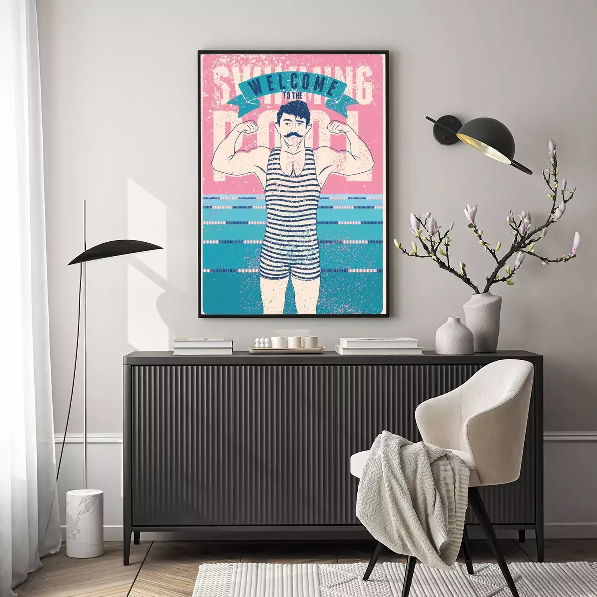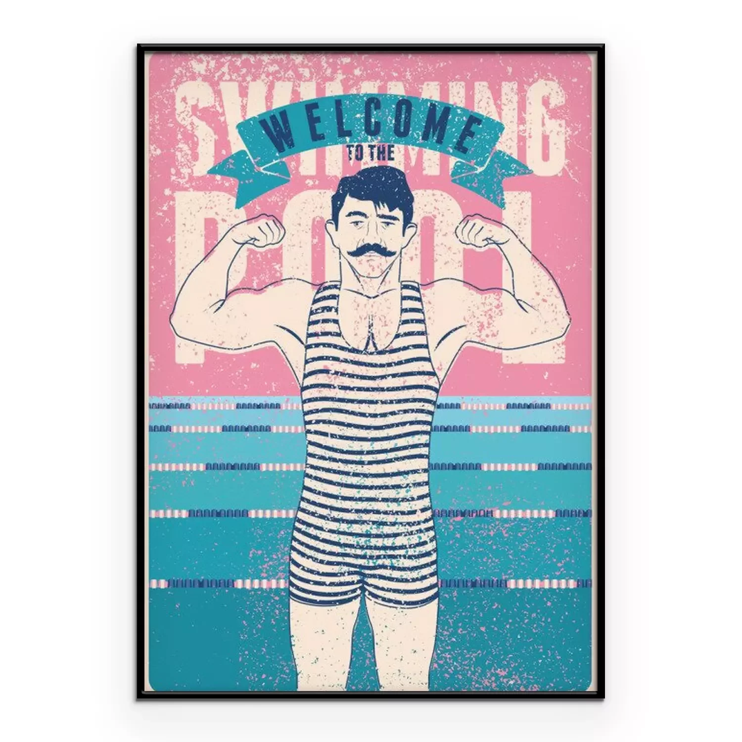 Poster Welcome to the swimming pool. Swimming Pool typographical vintage grunge style poster with retro swimmer. Vector illustration.