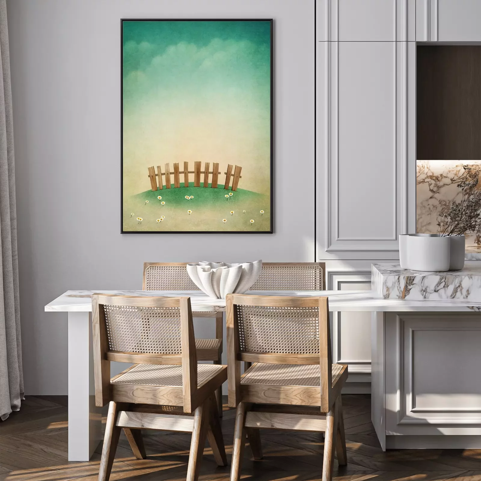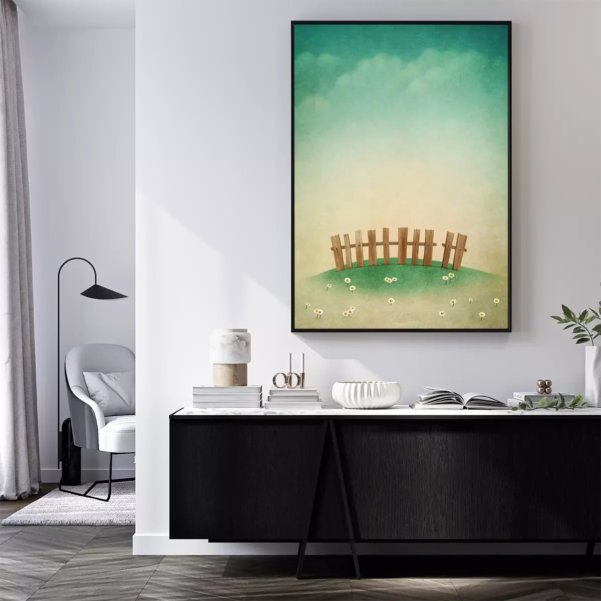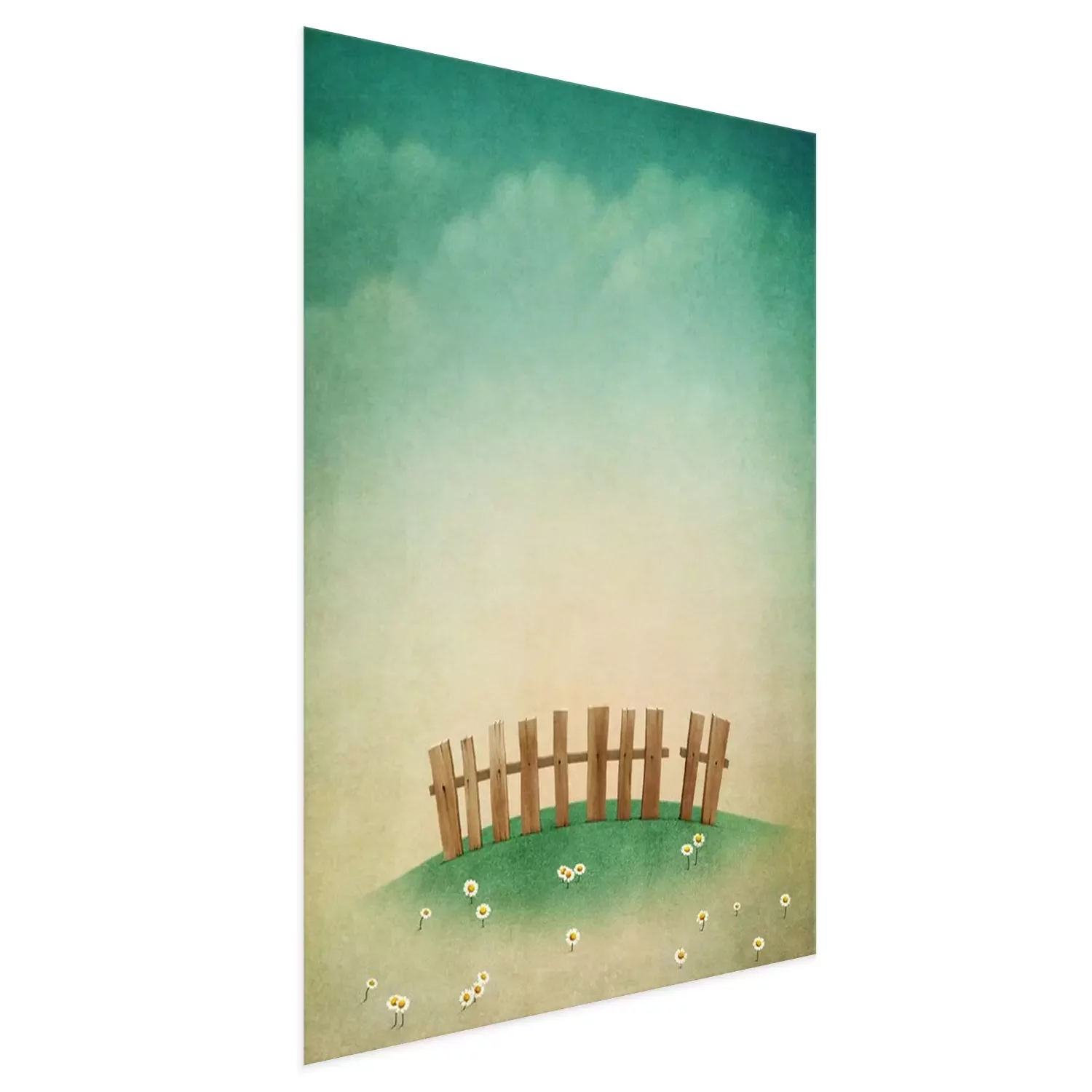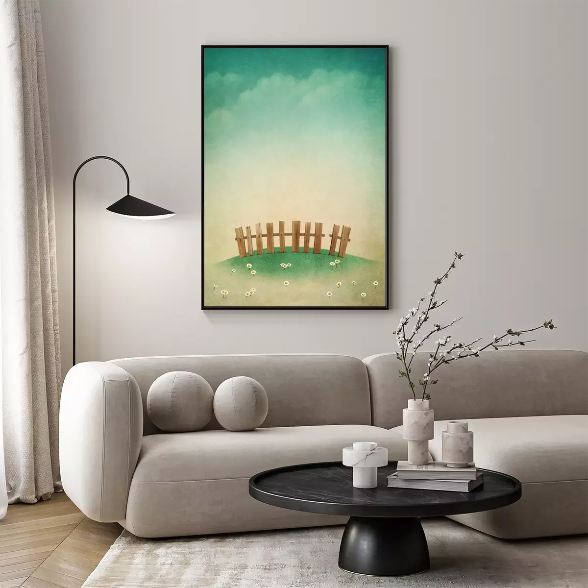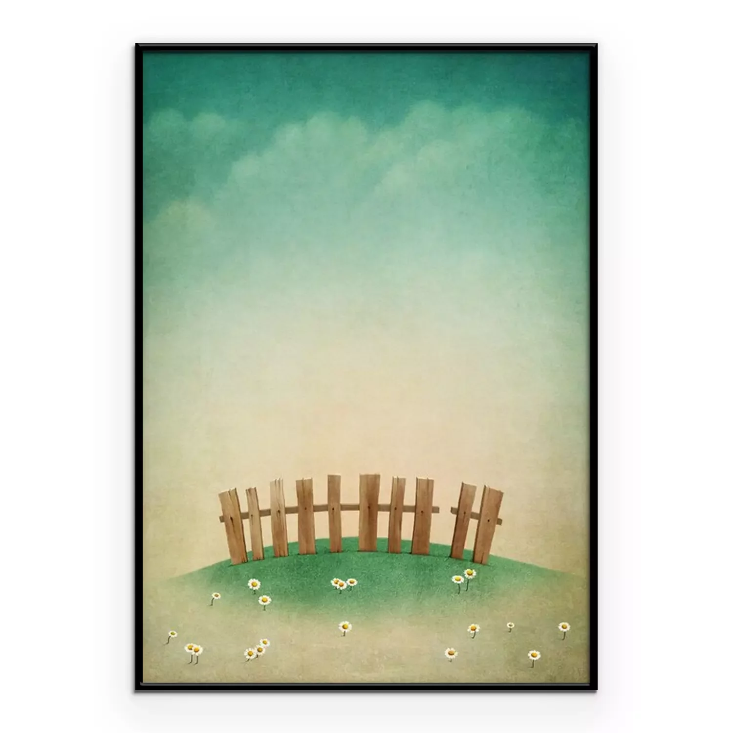 Poster: Wenskaart of illustratie van de mooie herfst gazon met hek