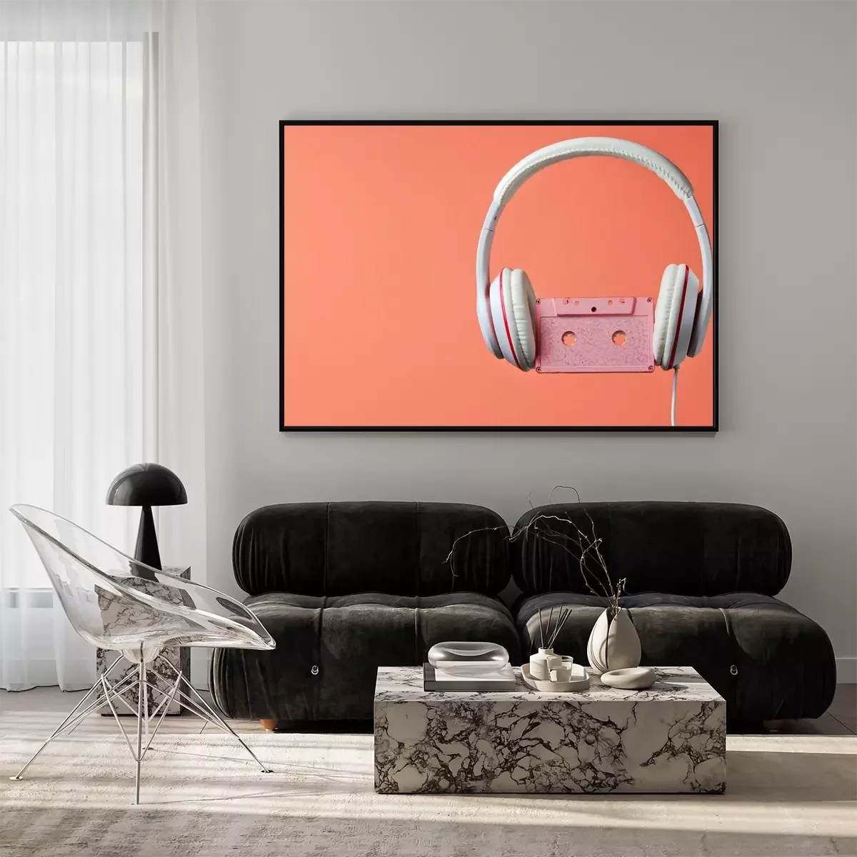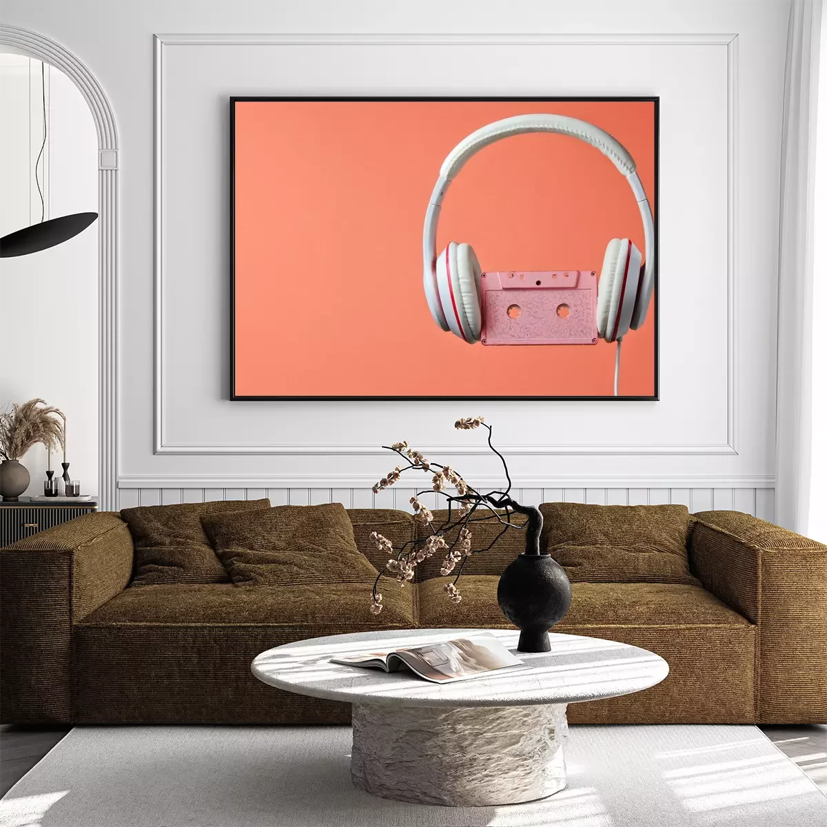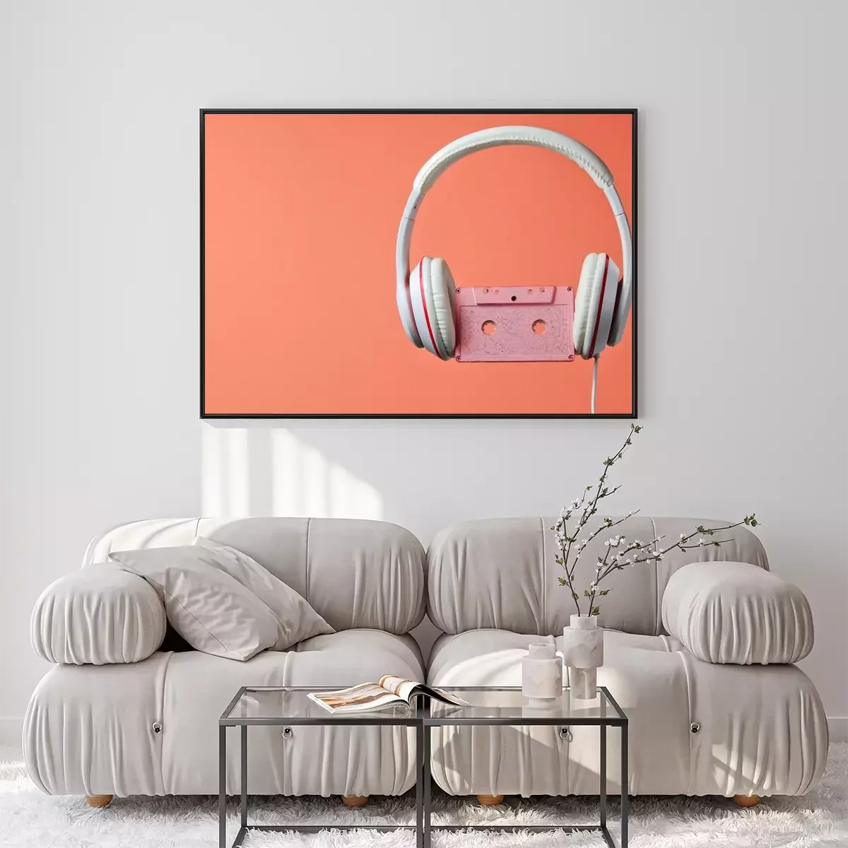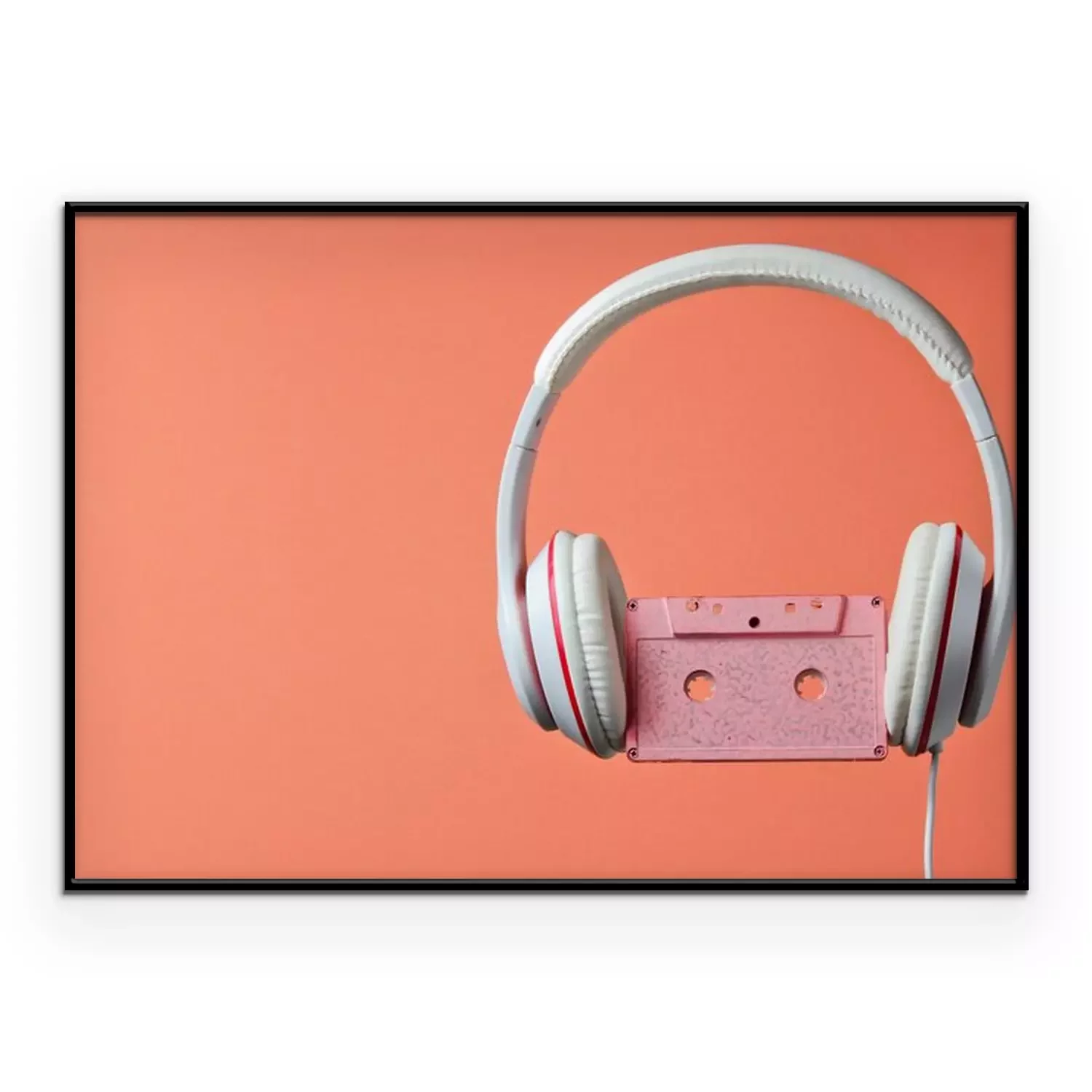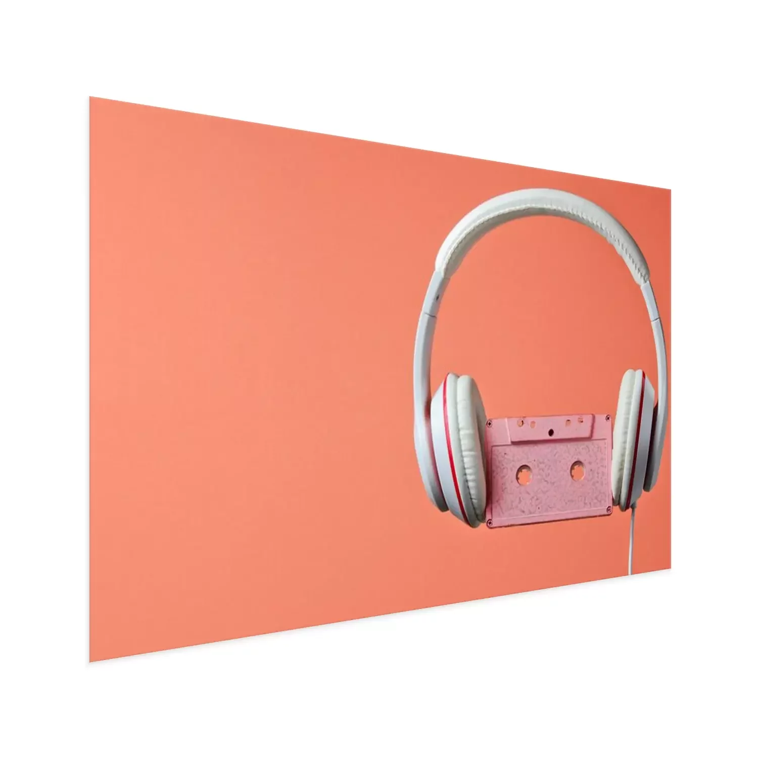 Poster: White classic wired headphones with audio cassette isolated on coral color background. Retro style. 80s. Minimalistic music concept.