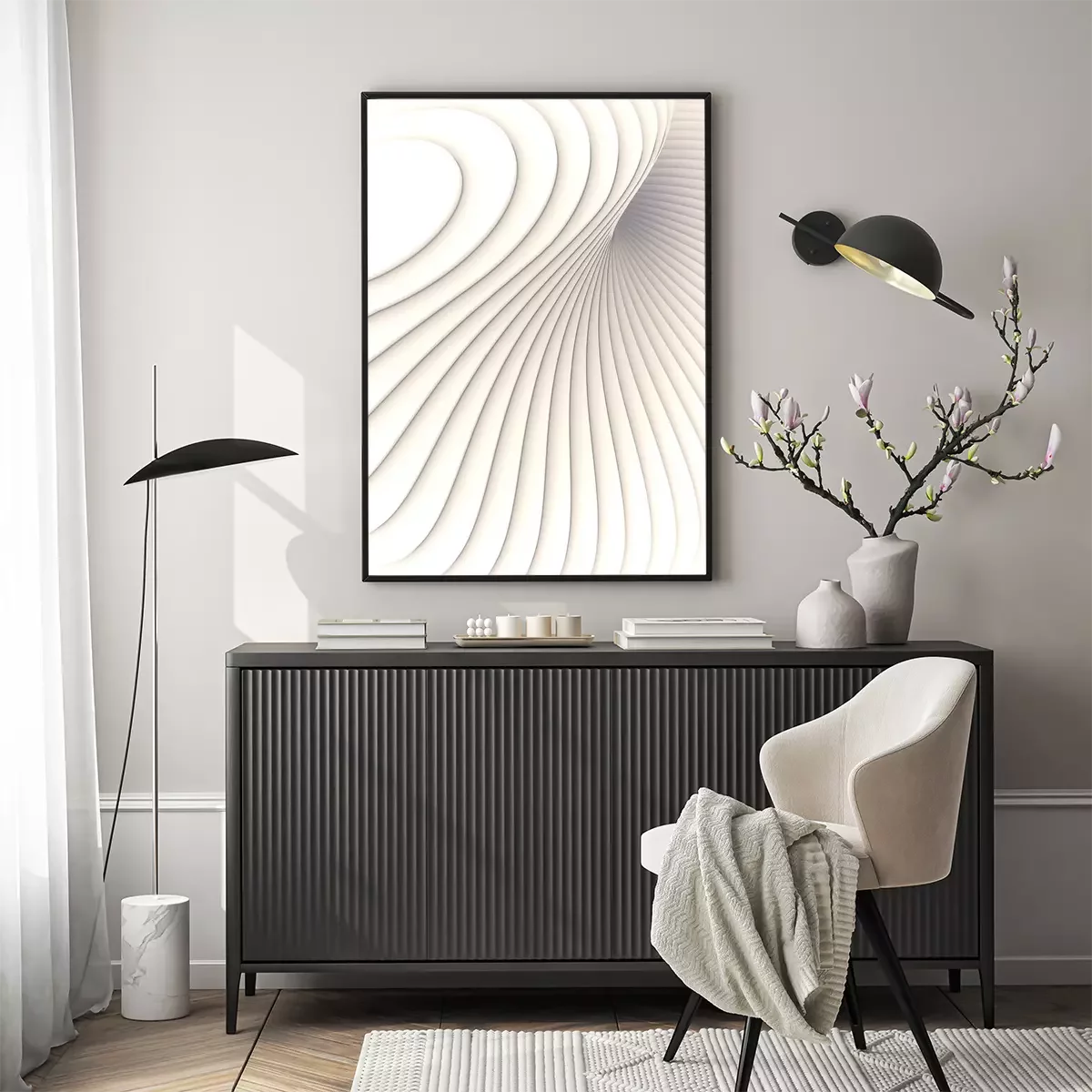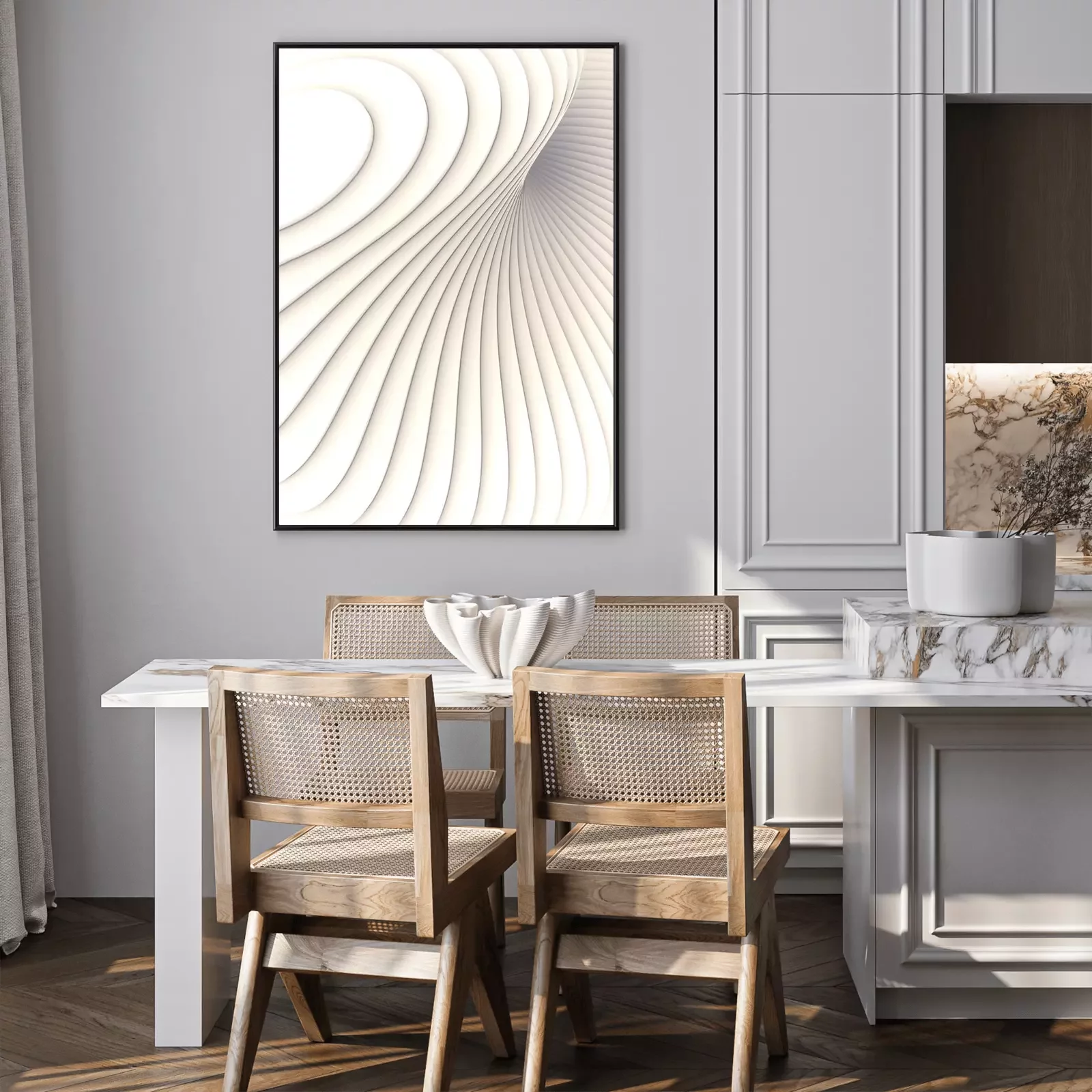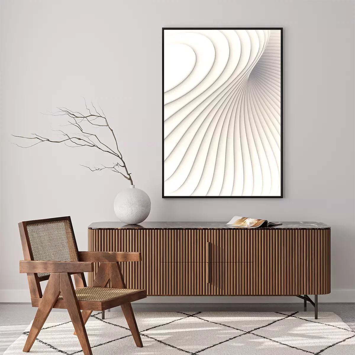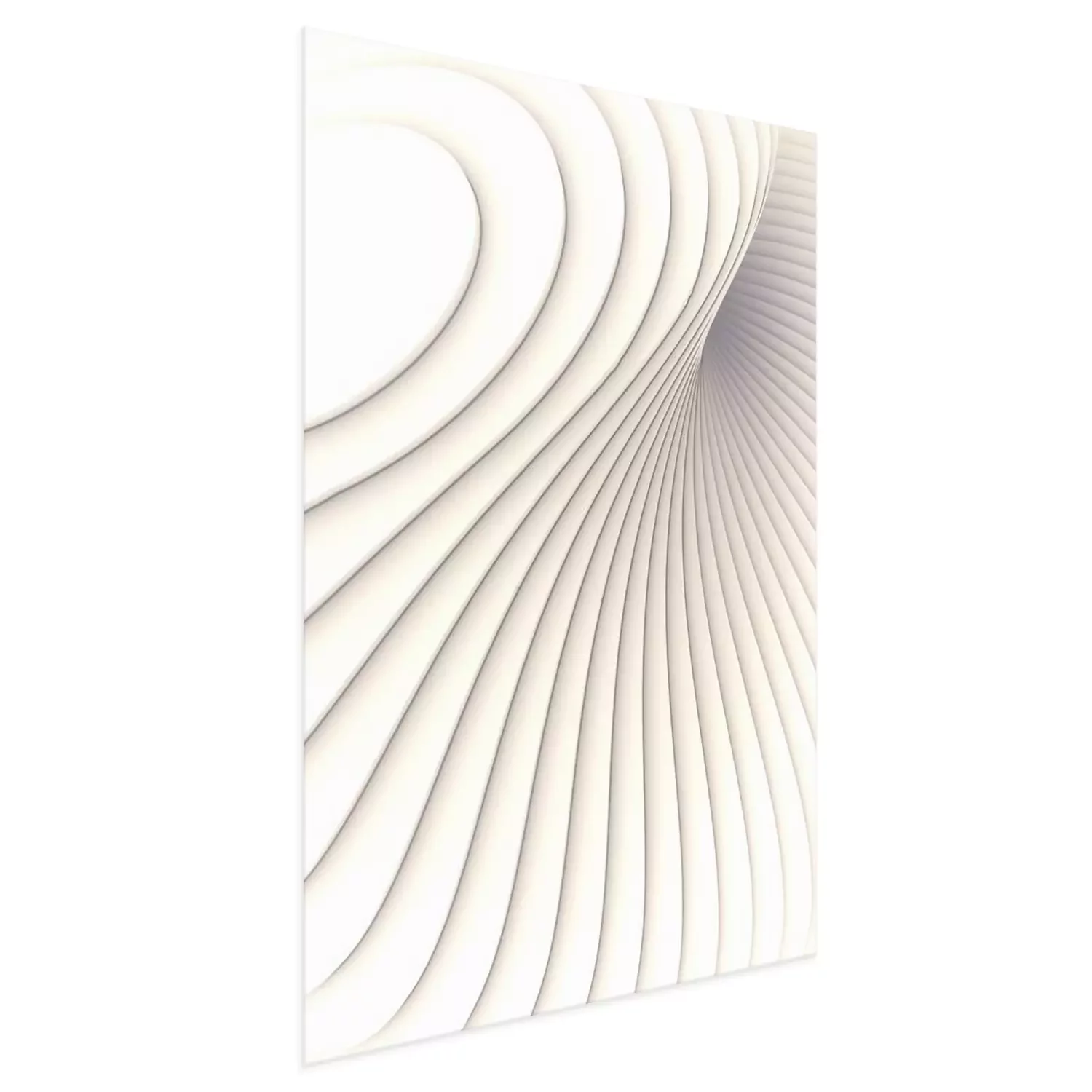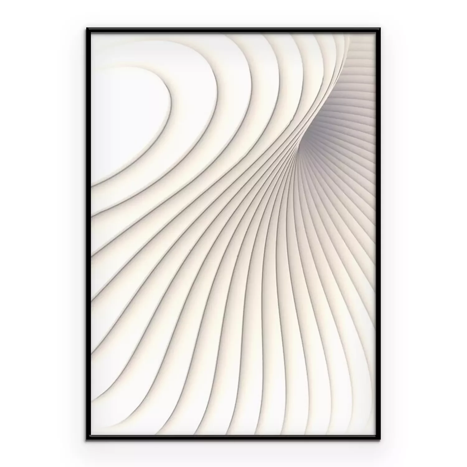 Poster: White striped futuristic pattern surrounded by light mist. Computer generated geometric shape. 3d render illustration