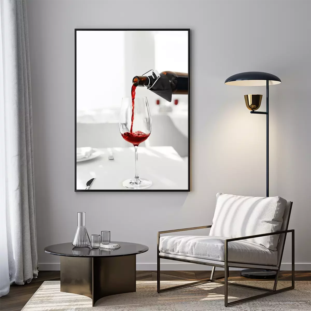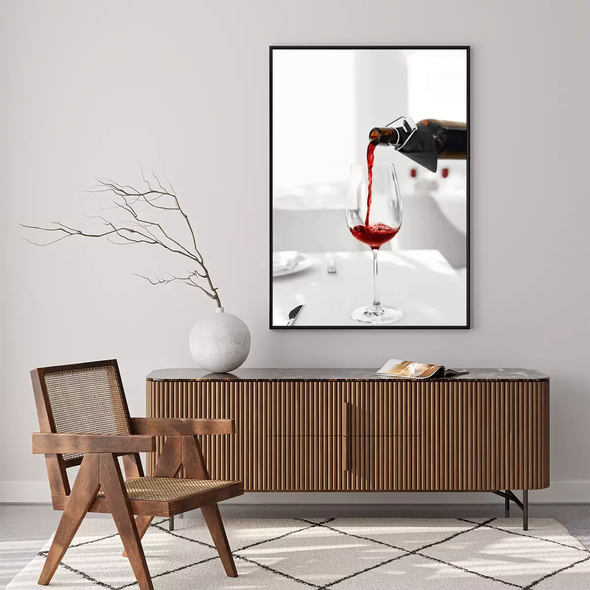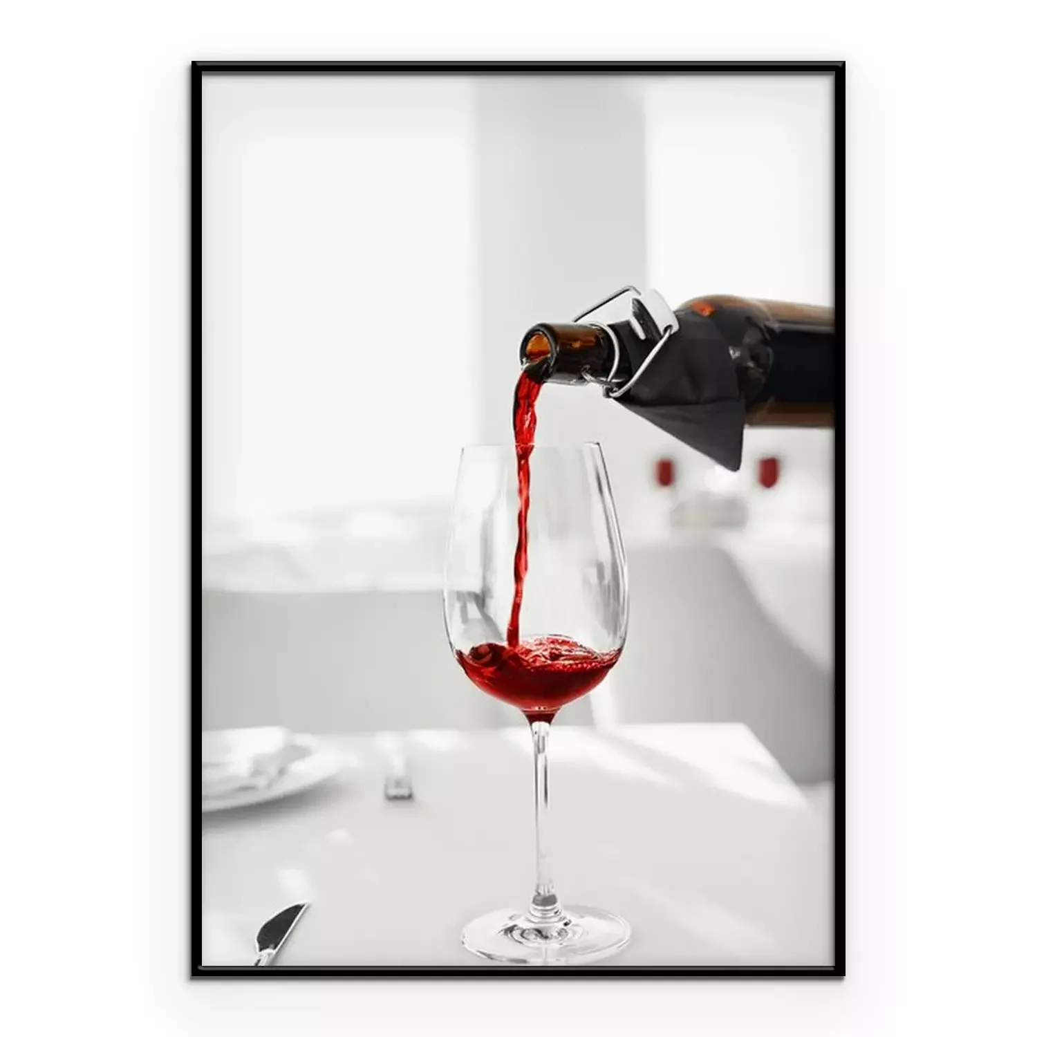 Poster Wijn. Close-up van het gieten van rode wijn uit de fles in glas wijn in een restaurant. Alcoholische dranken. Celebration en levensstijl.