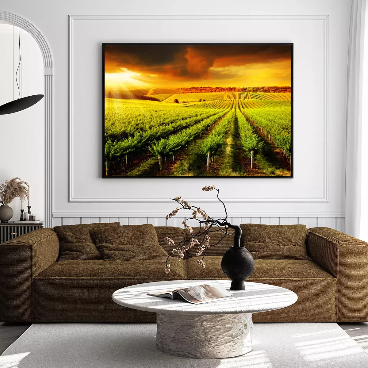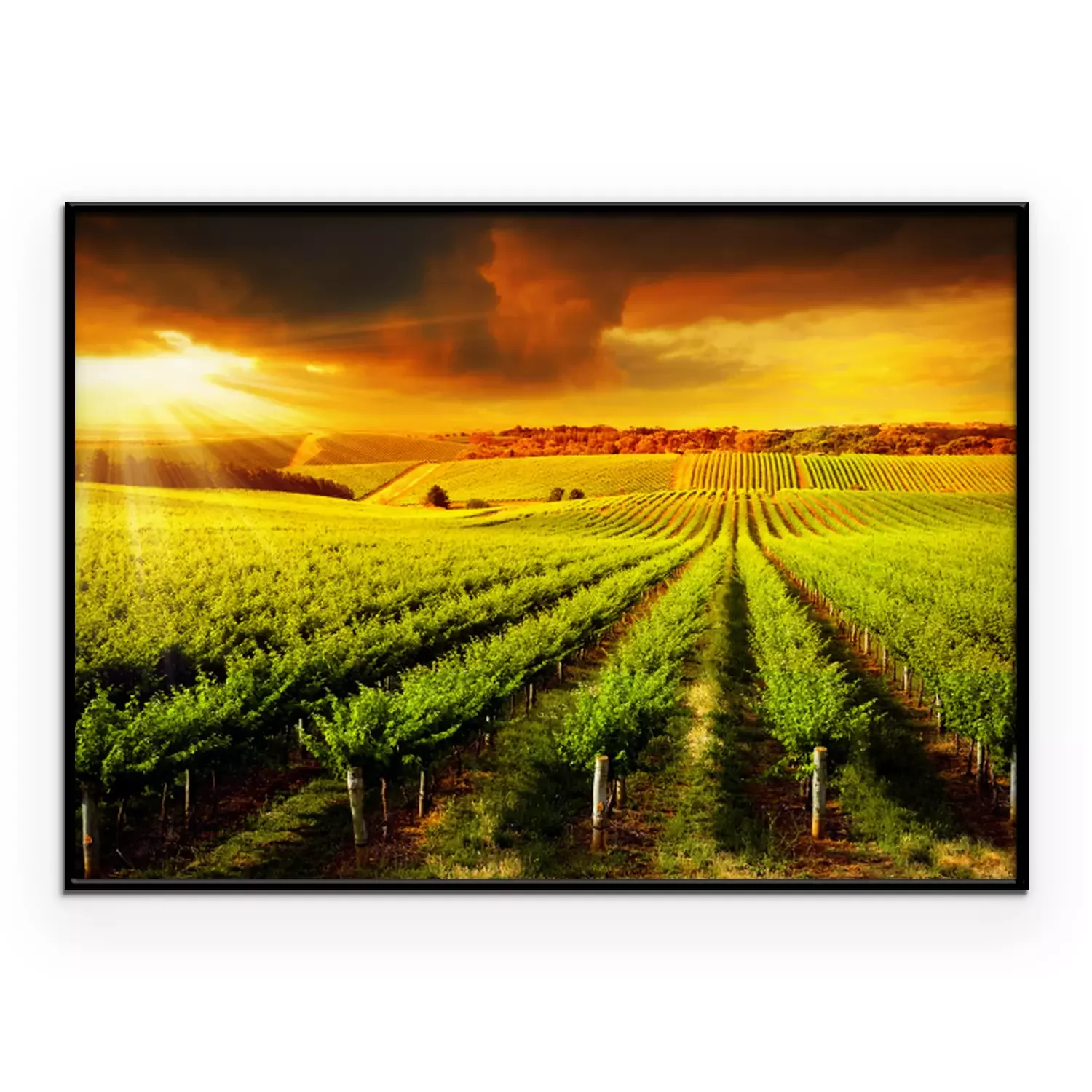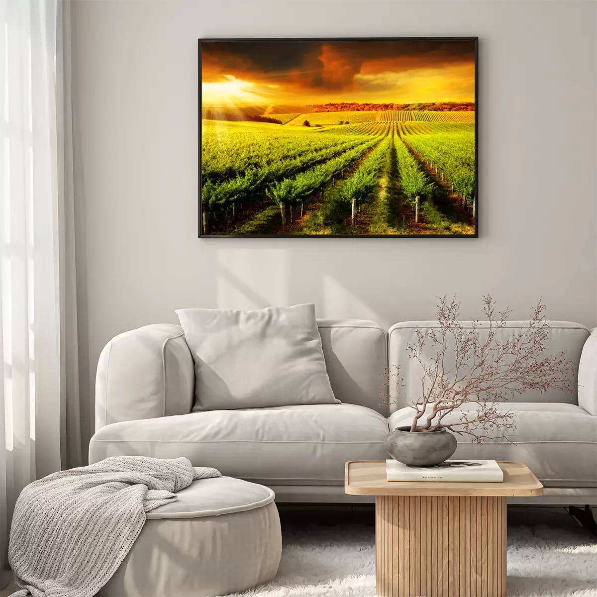 Poster: Wijngaard in de zonnestralen die door de wolken breken