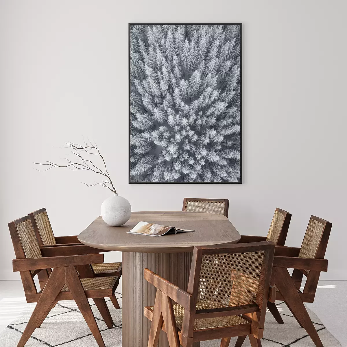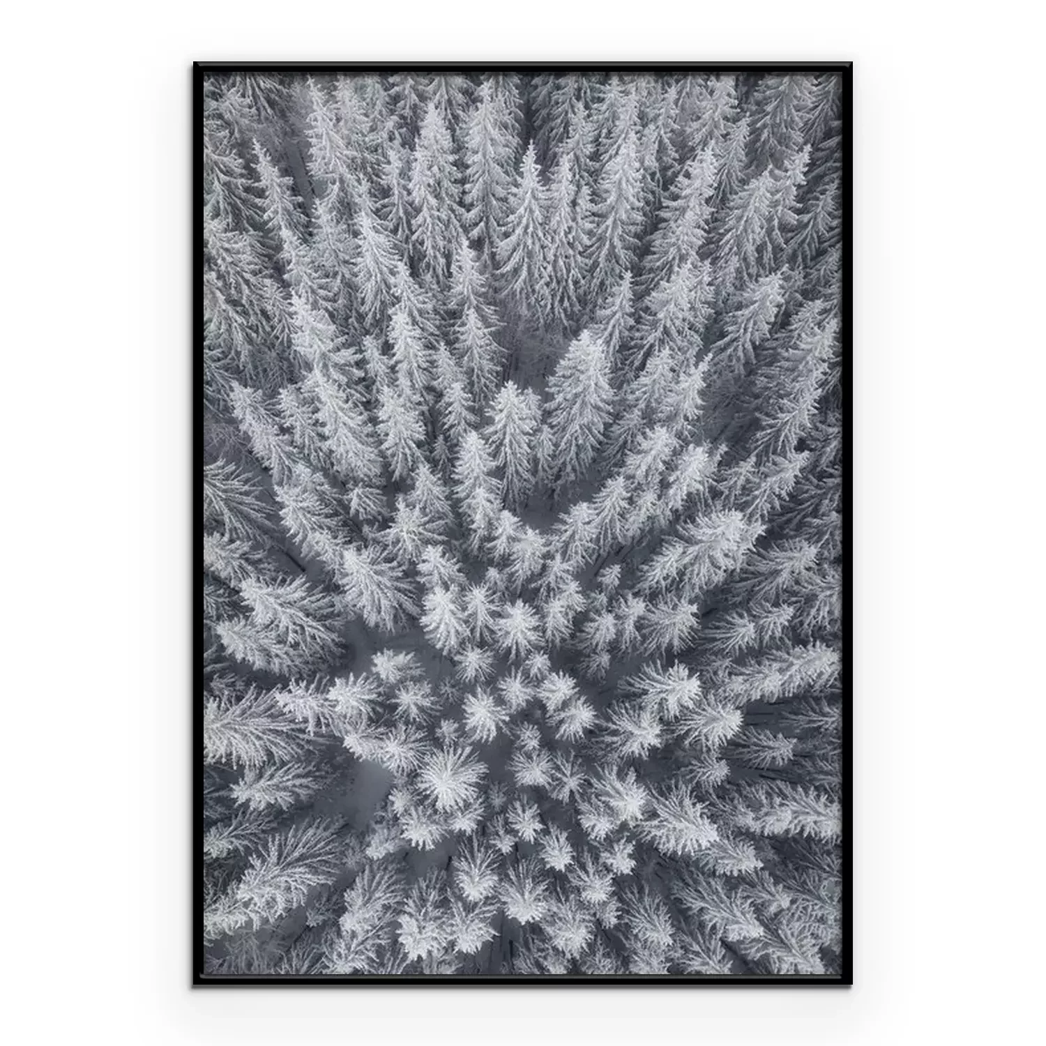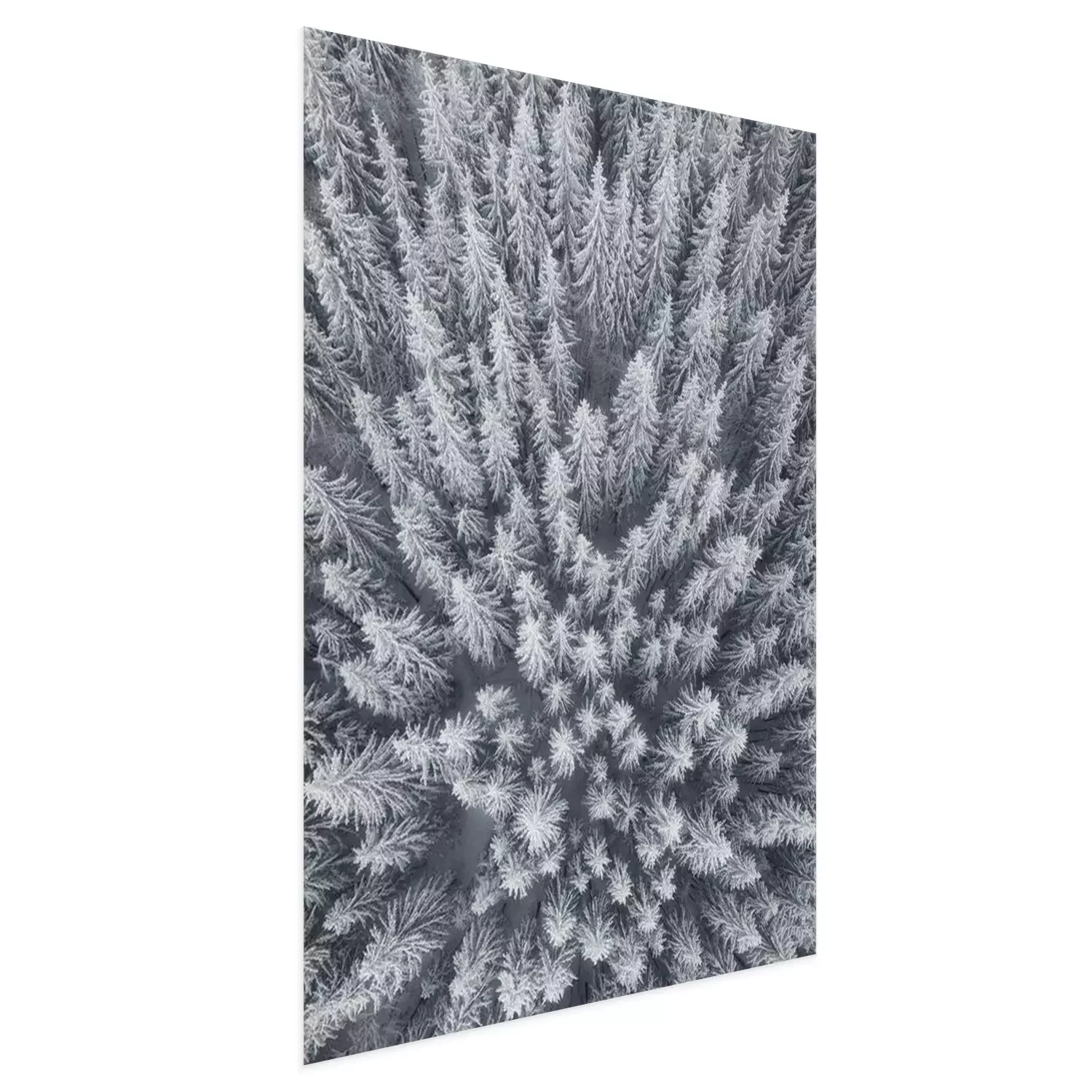 Poster: Winterlandschap vanuit de lucht. Bos als achtergrond