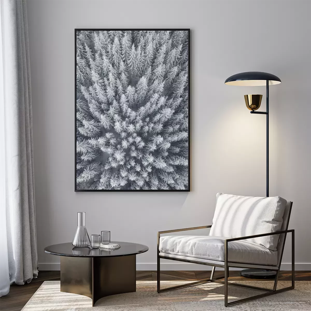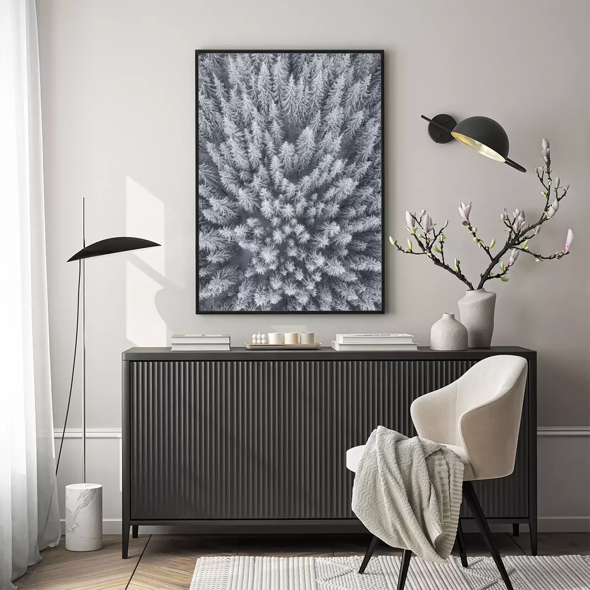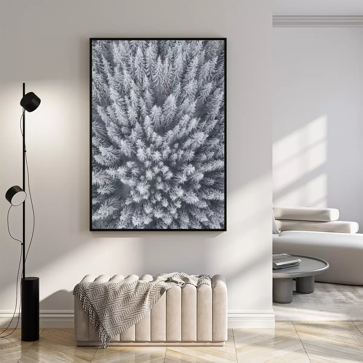 Poster: Winterlandschap vanuit de lucht. Bos als achtergrond