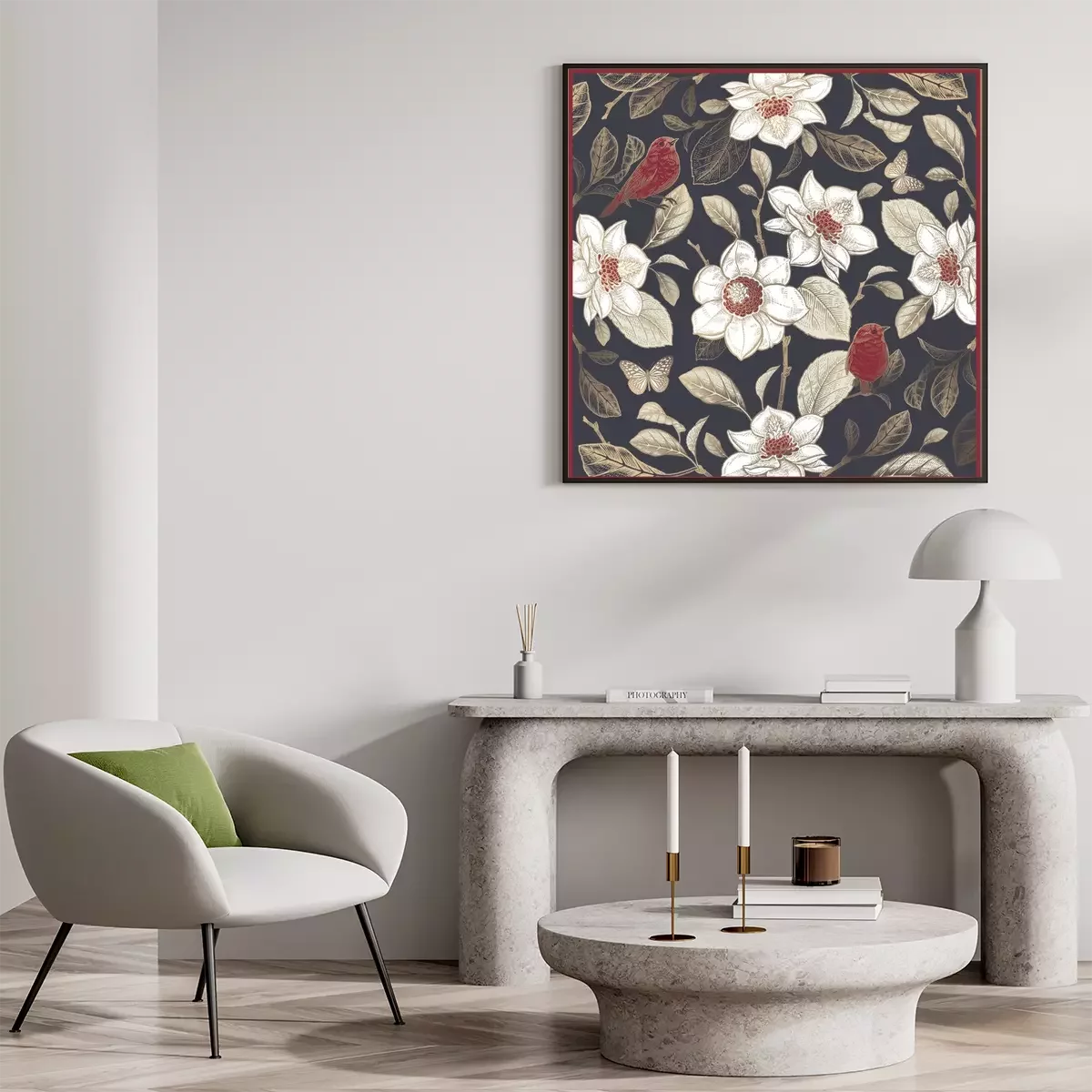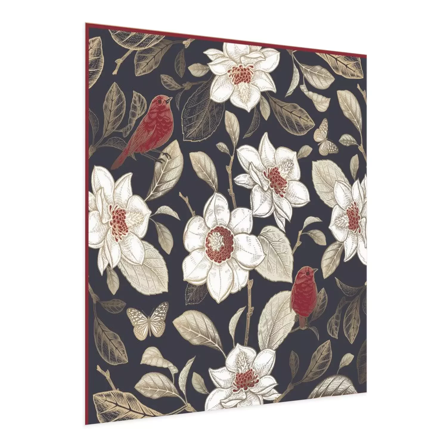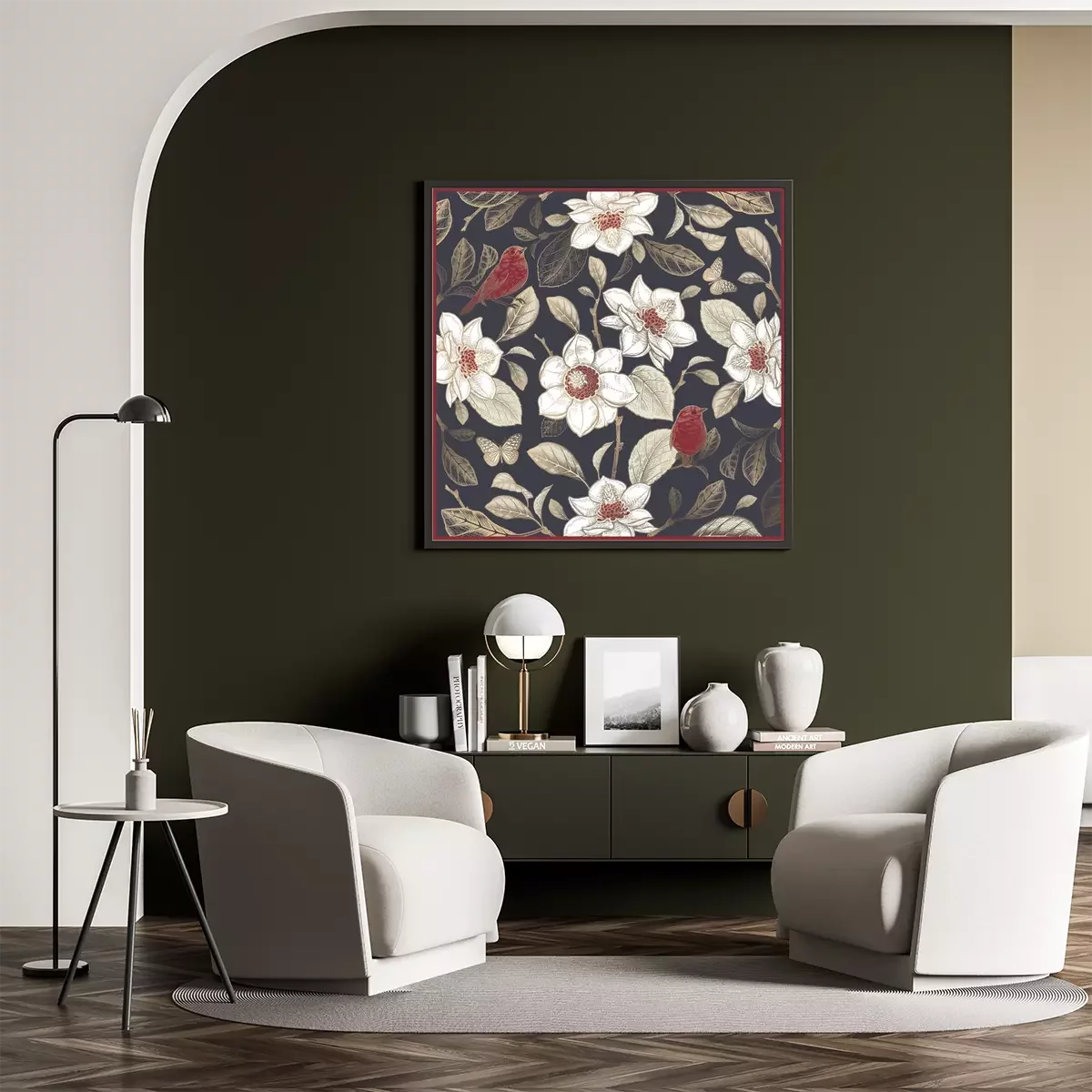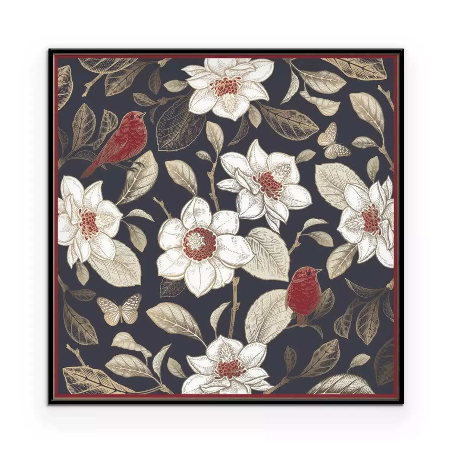 Luxury seamless pattern. Blooming magnolia tree and little cute birds.
