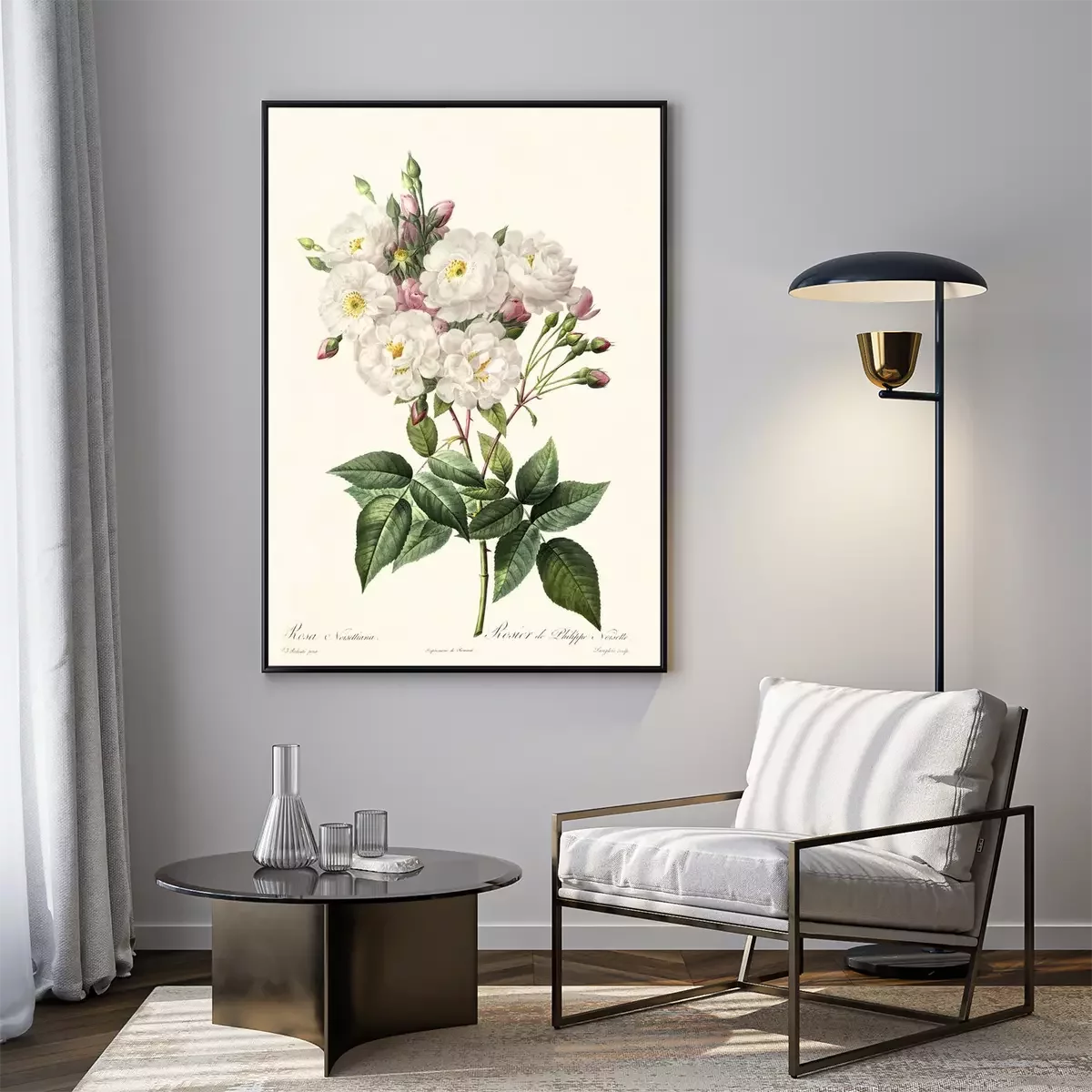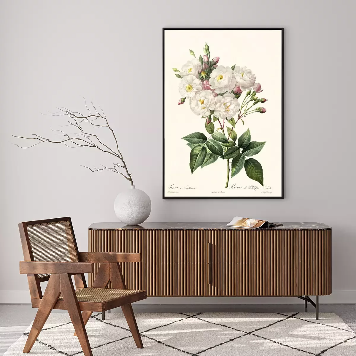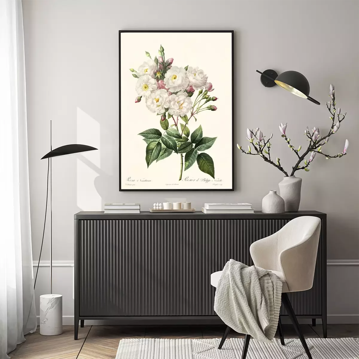 Botanische grafiek van een witte roos met onderschriften