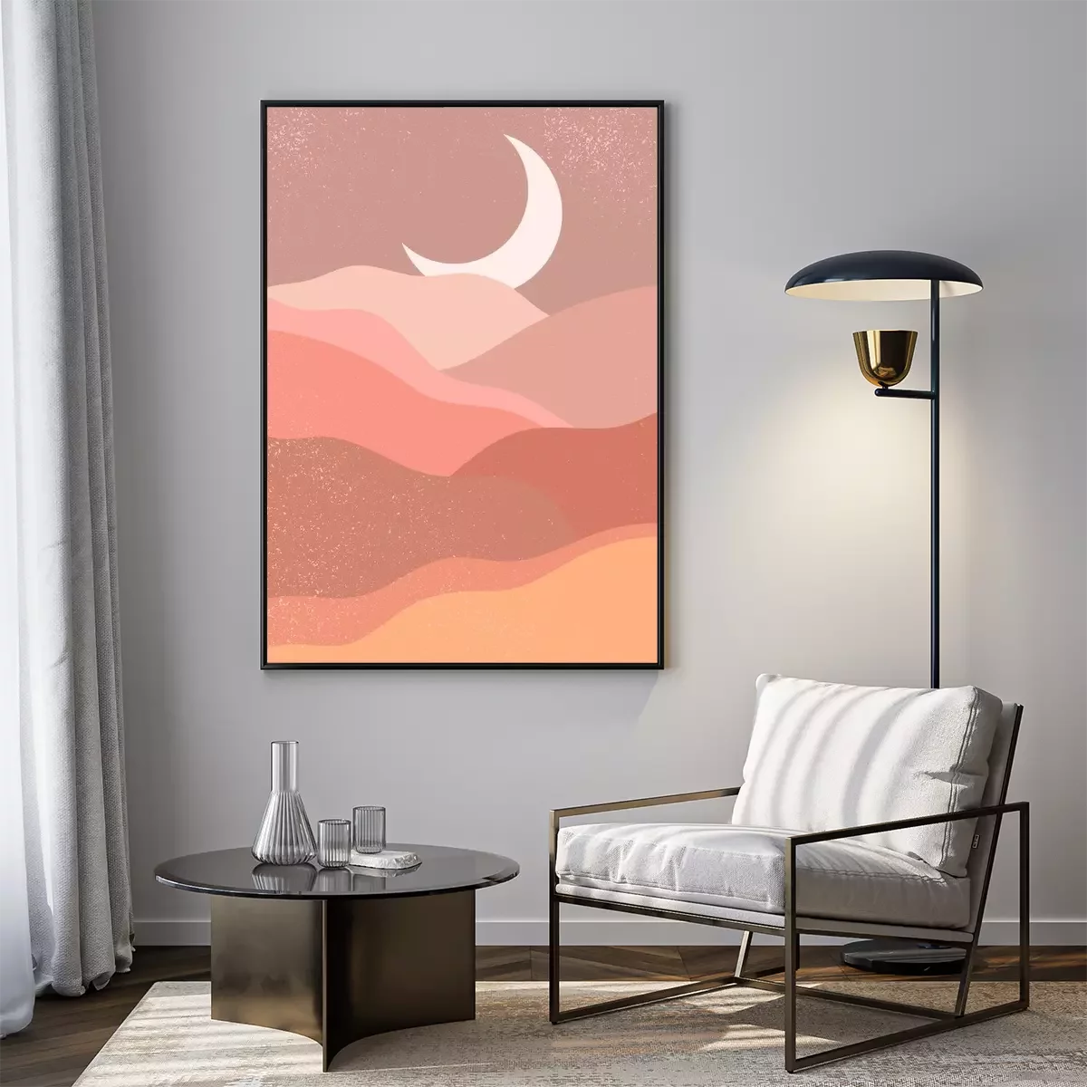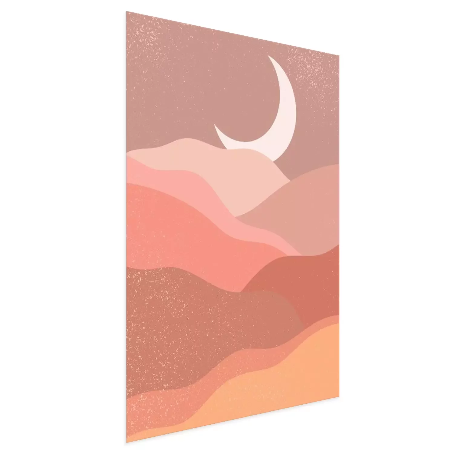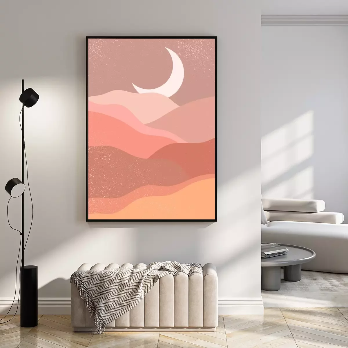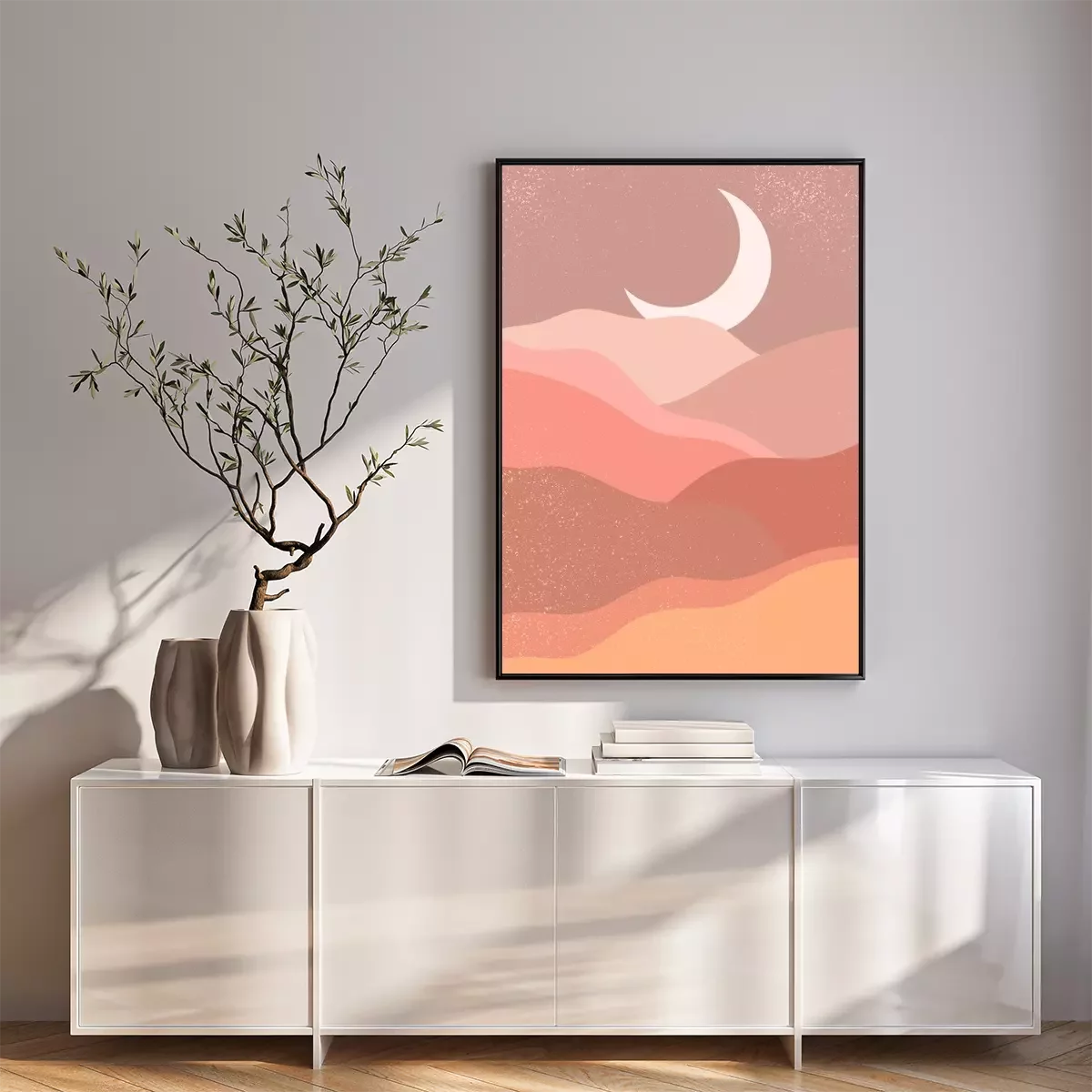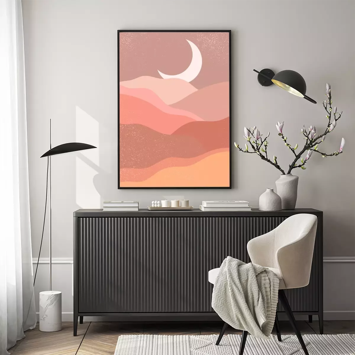 Abstract contemporary aesthetic background with night landscape, stairs, palm, vases, Moon. Earth tones, muted, terracotta colors. Boho wall decor. Mid century modern minimalist art print.