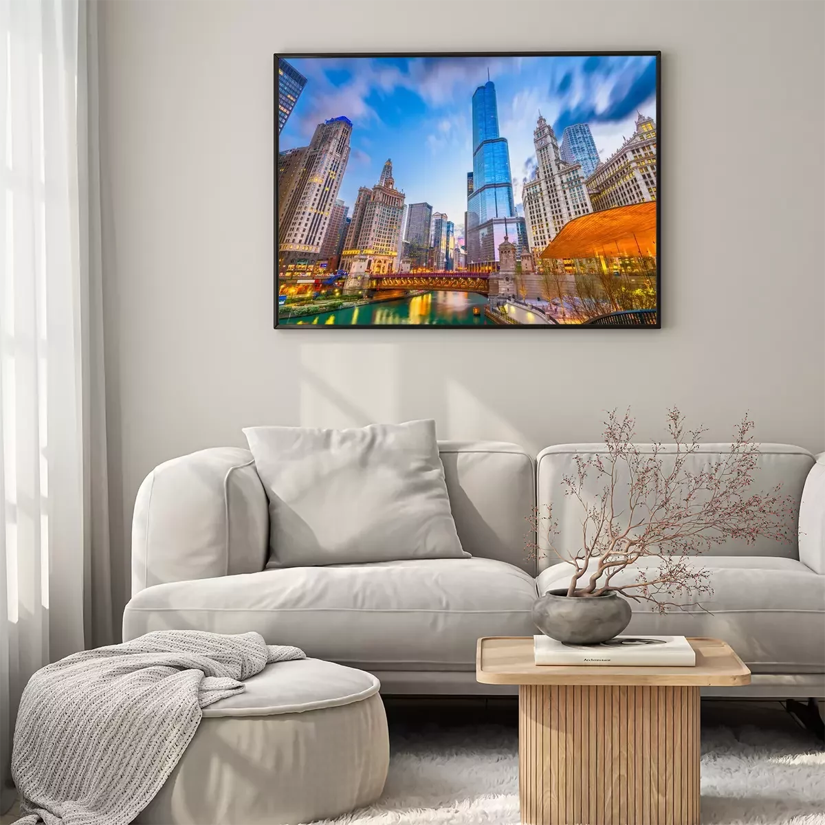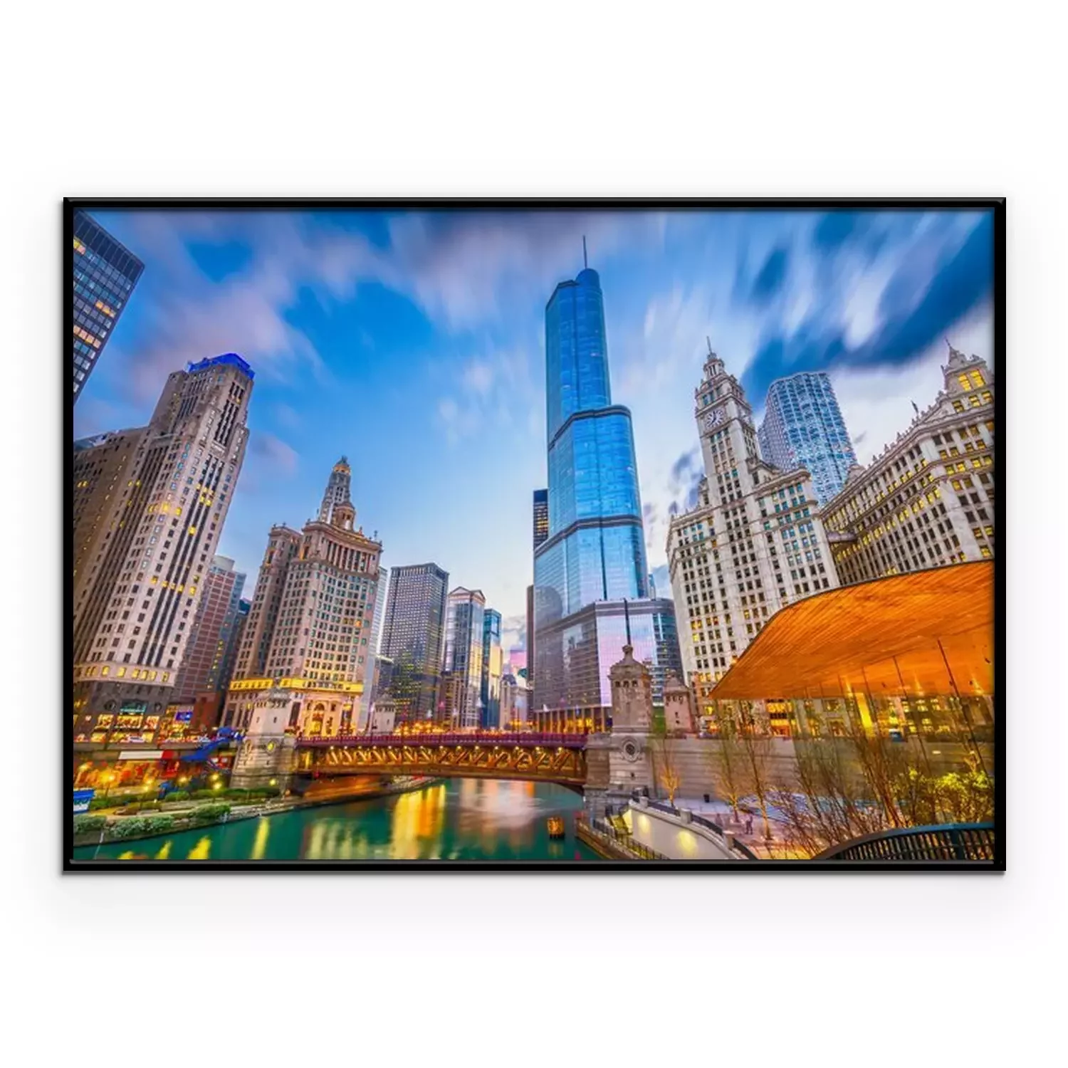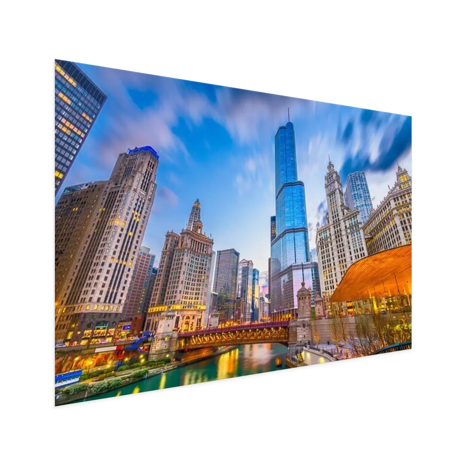 Poster: Wolkenkrabbers en brug bij zonsondergang