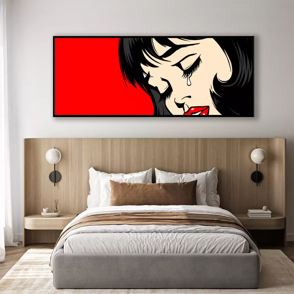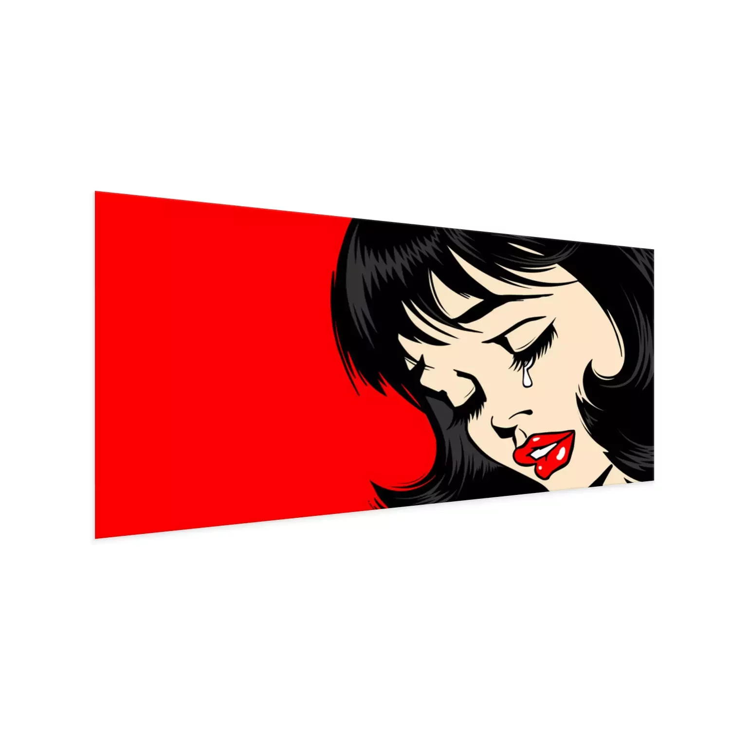 Poster: Pop Art Woman сlose-up. beautiful girl in pop art style crying. tear on the lady's face. The lush red lips of a sexy brunette. Vector. Illustration on red background. Women Health. Menstruation.