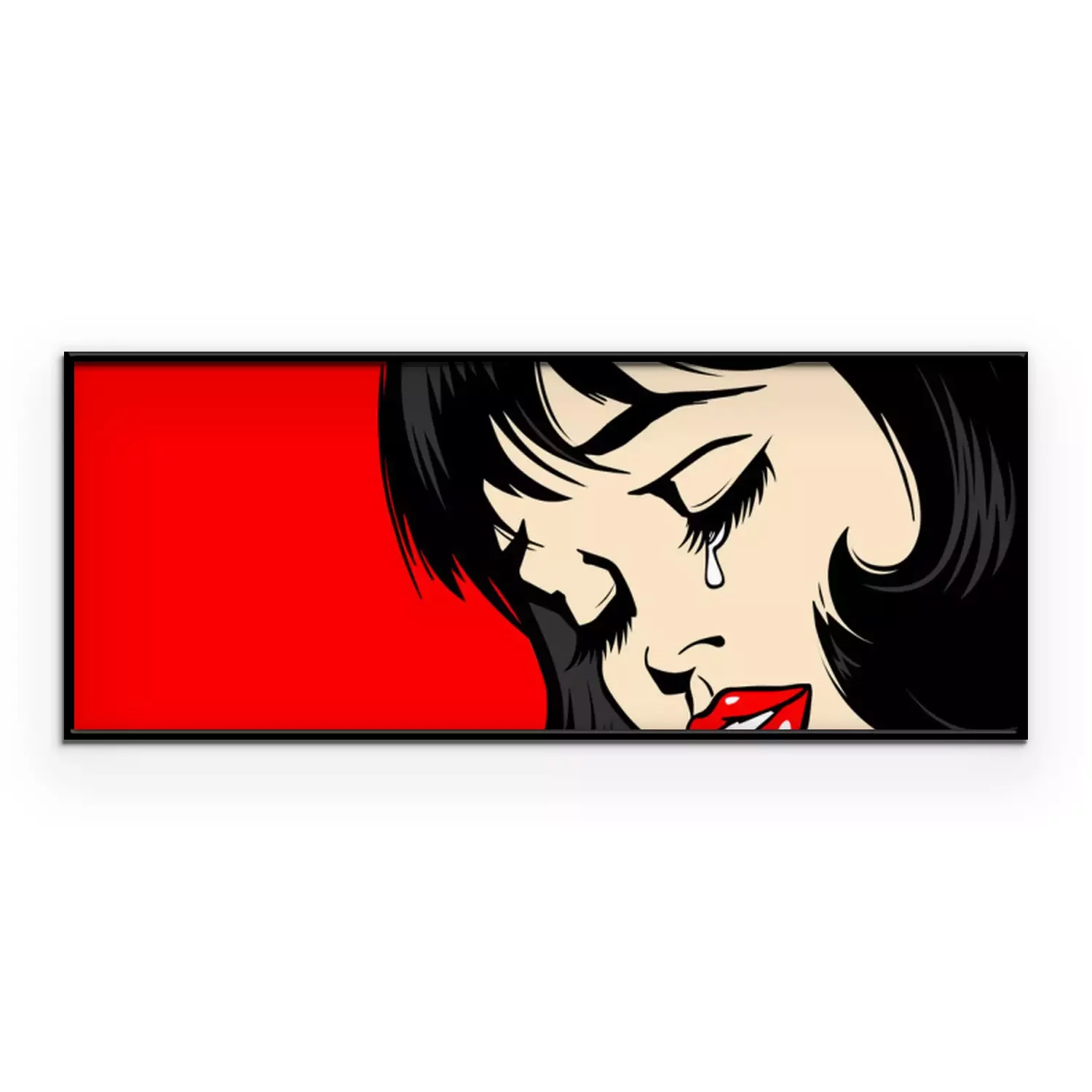 Poster Pop Art Woman сlose-up. beautiful girl in pop art style crying. tear on the lady's face. The lush red lips of a sexy brunette. Vector. Illustration on red background. Women Health. Menstruation.
