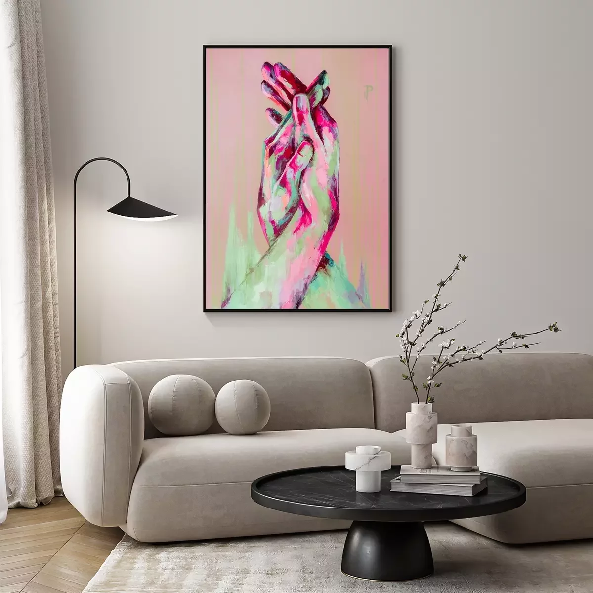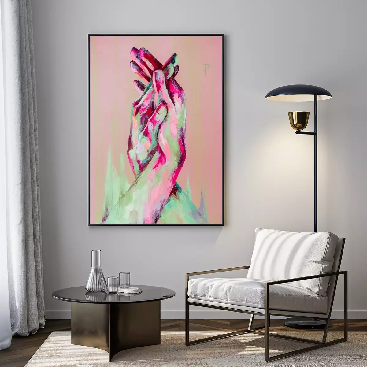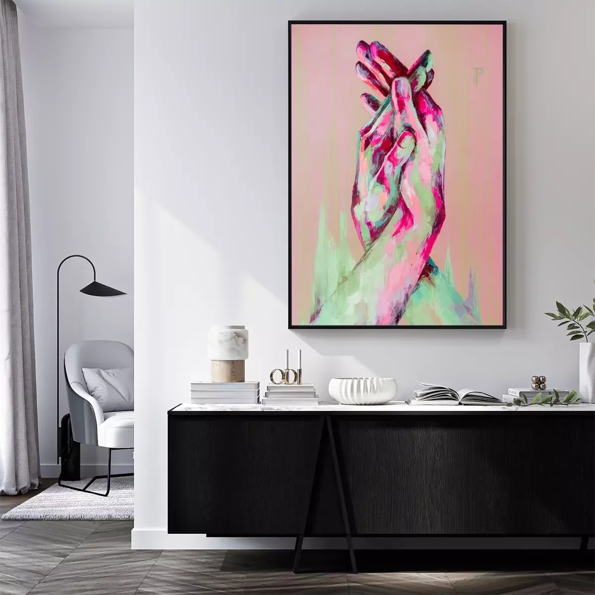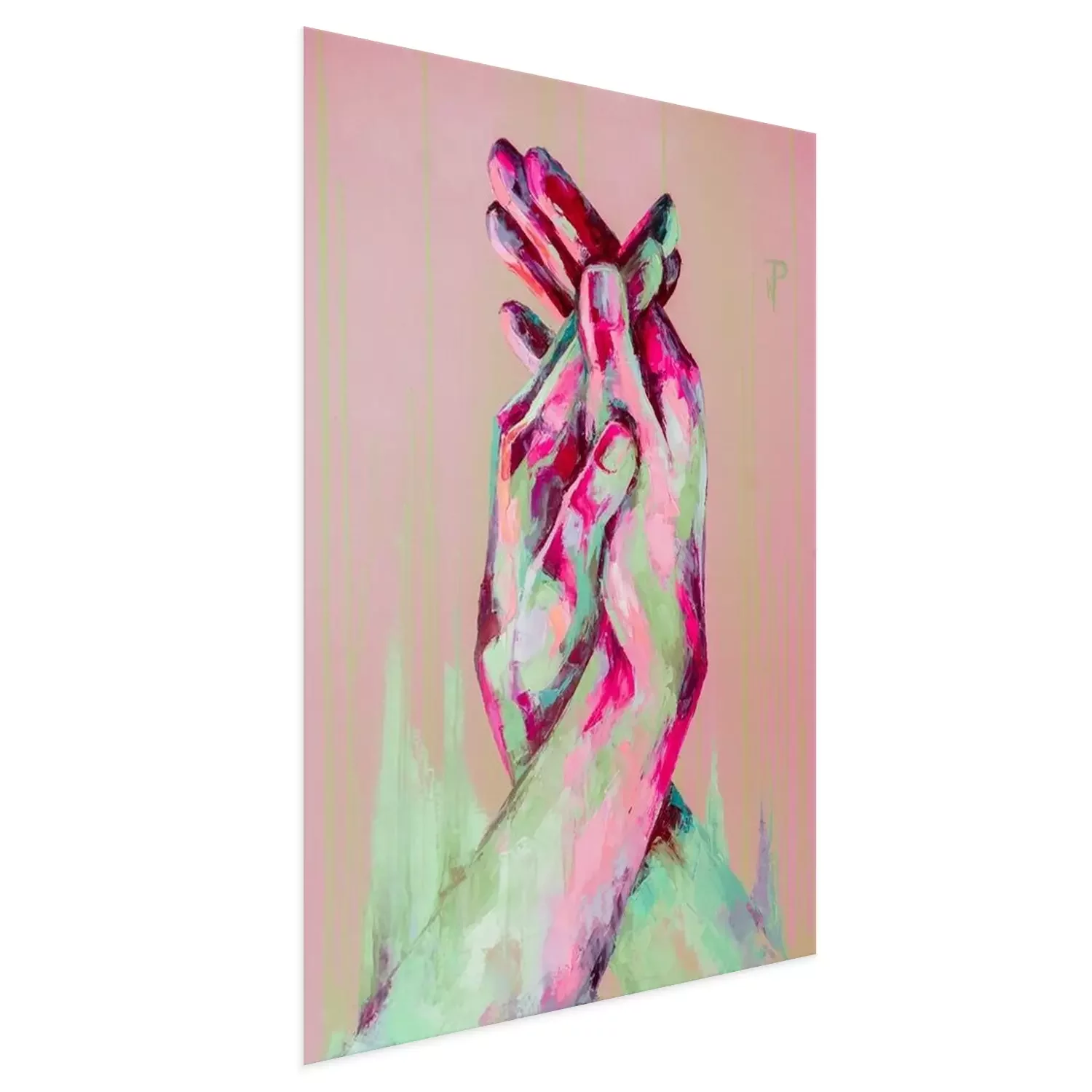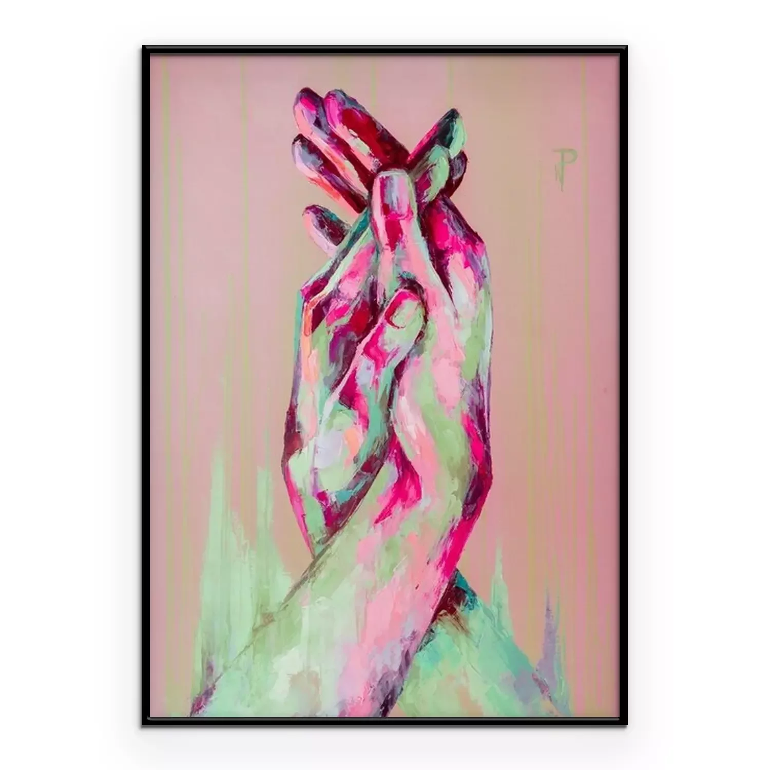 Poster: “Support” - oil painting. Conceptual abstract picture of holding hands. The background is painted with acrylic with smudges. Conceptual abstract closeup of an oil painting and palette knife on canvas.