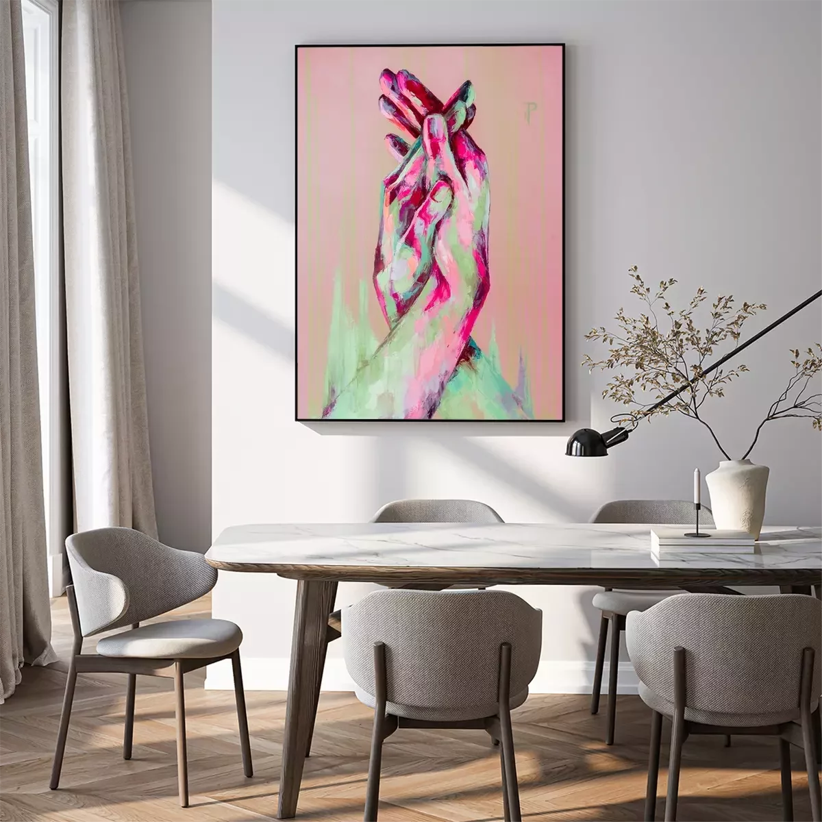 Poster “Support” - oil painting. Conceptual abstract picture of holding hands. The background is painted with acrylic with smudges. Conceptual abstract closeup of an oil painting and palette knife on canvas.