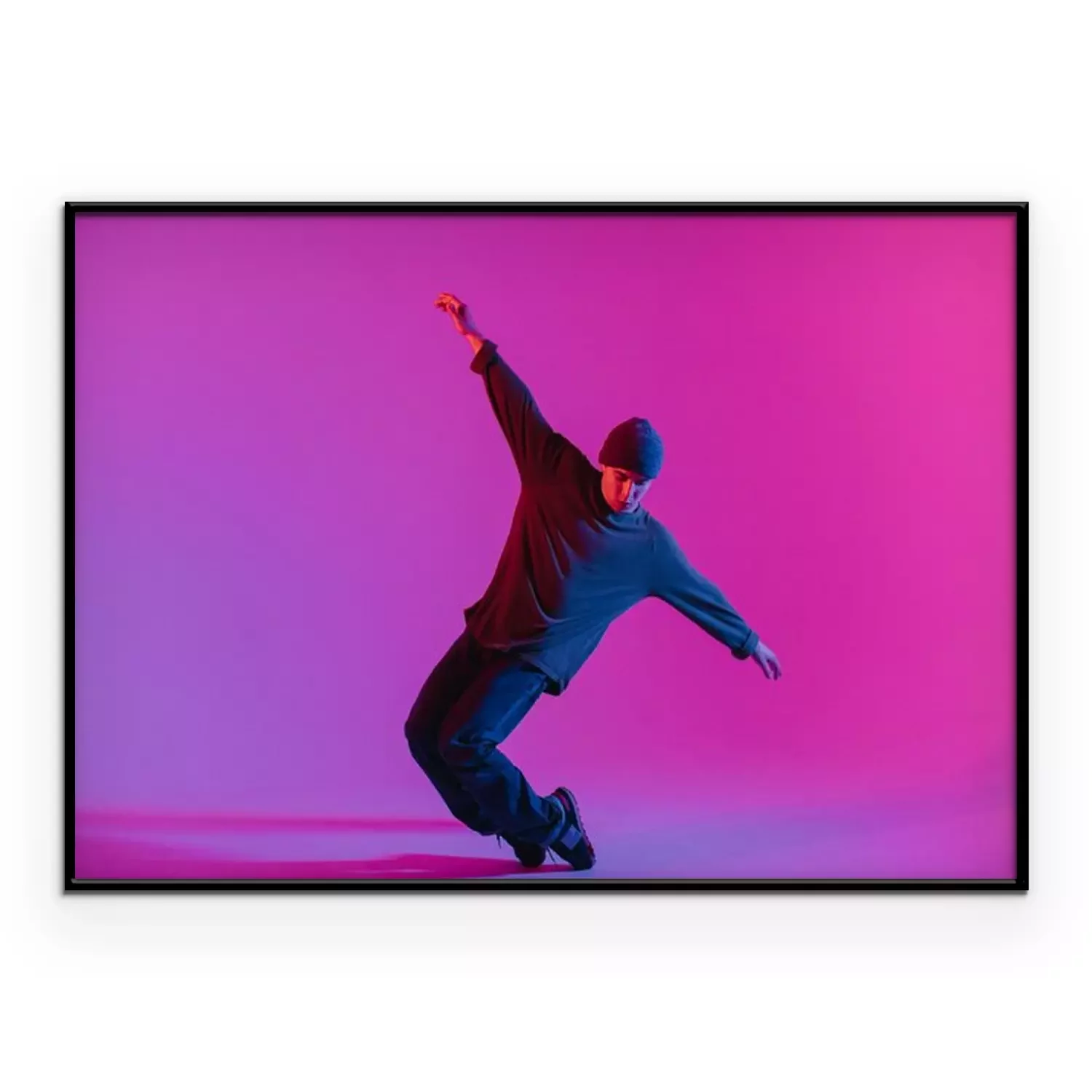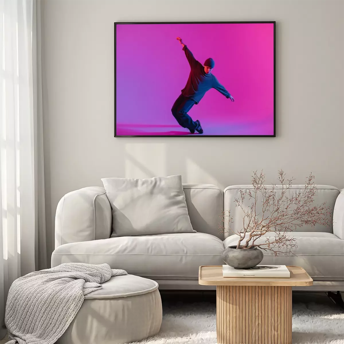 Poster: Young Man in a Jumper Dancing Contemporary Dance in Studio. Breakdancing. Dance School Poster. Copy Space. Battle competition announcement. Pink and Blue Background.