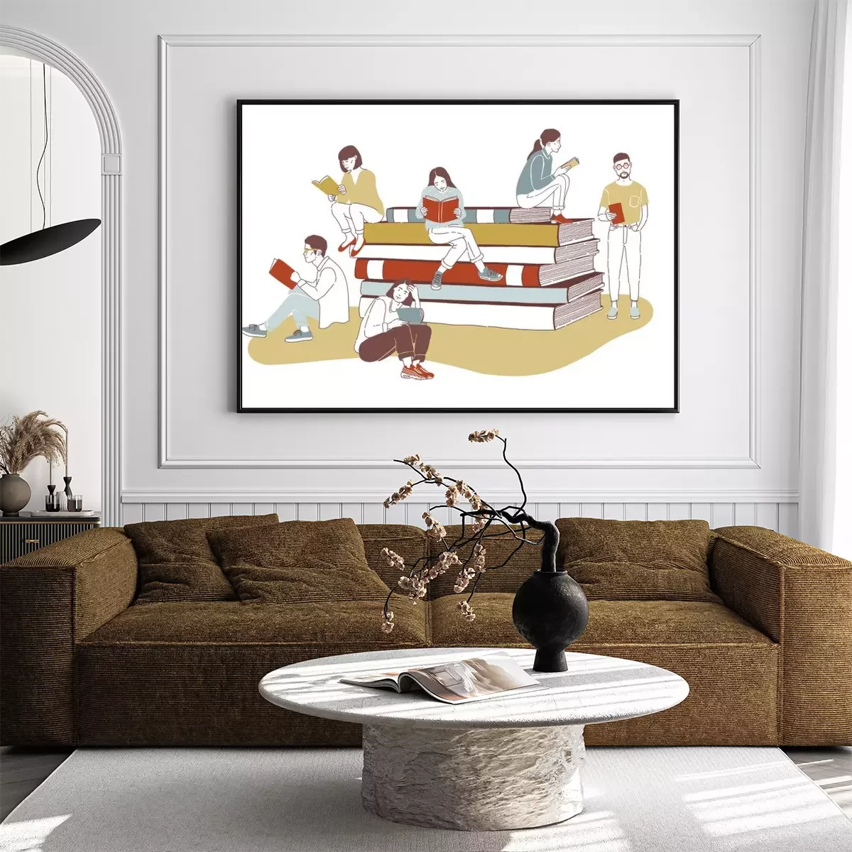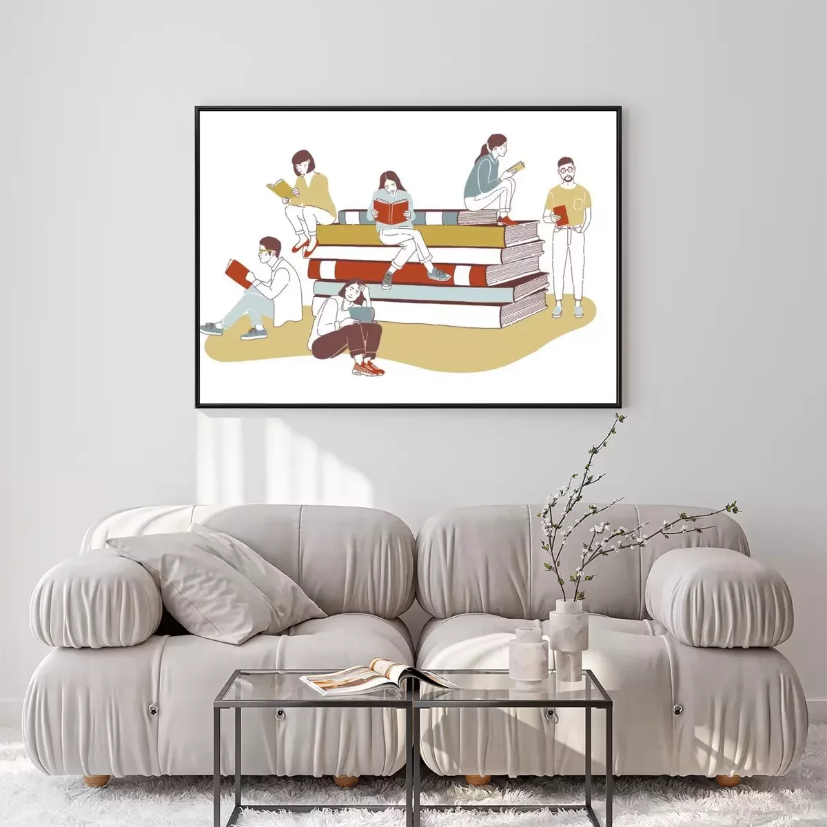 Poster Young stylish male and female readers dressed in trendy apparel sitting on stack of giant books or beside it and reading. Literature fans or lovers. Colored vector illustration in contemporary style.