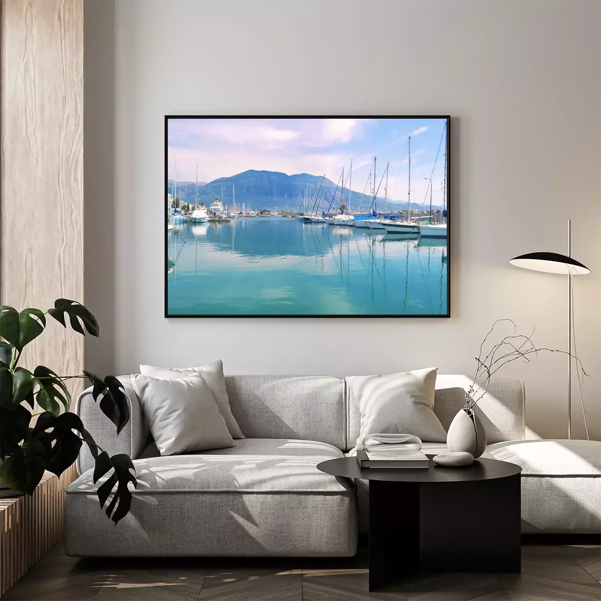 Poster Zeilboten weerspiegeld op zee Kalamata haven Griekenland