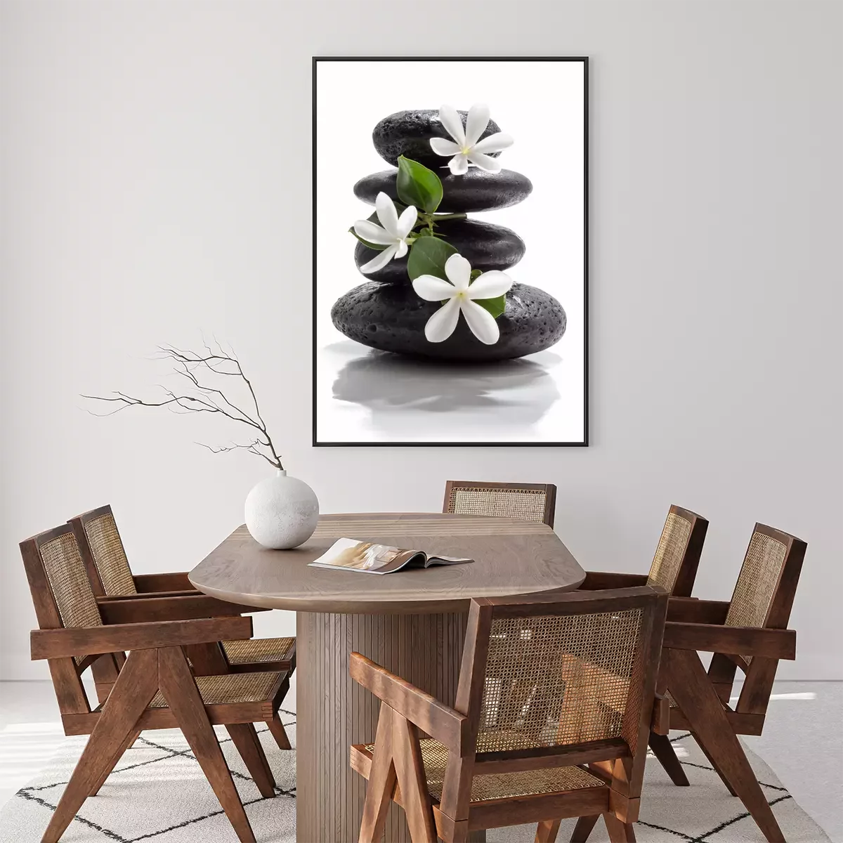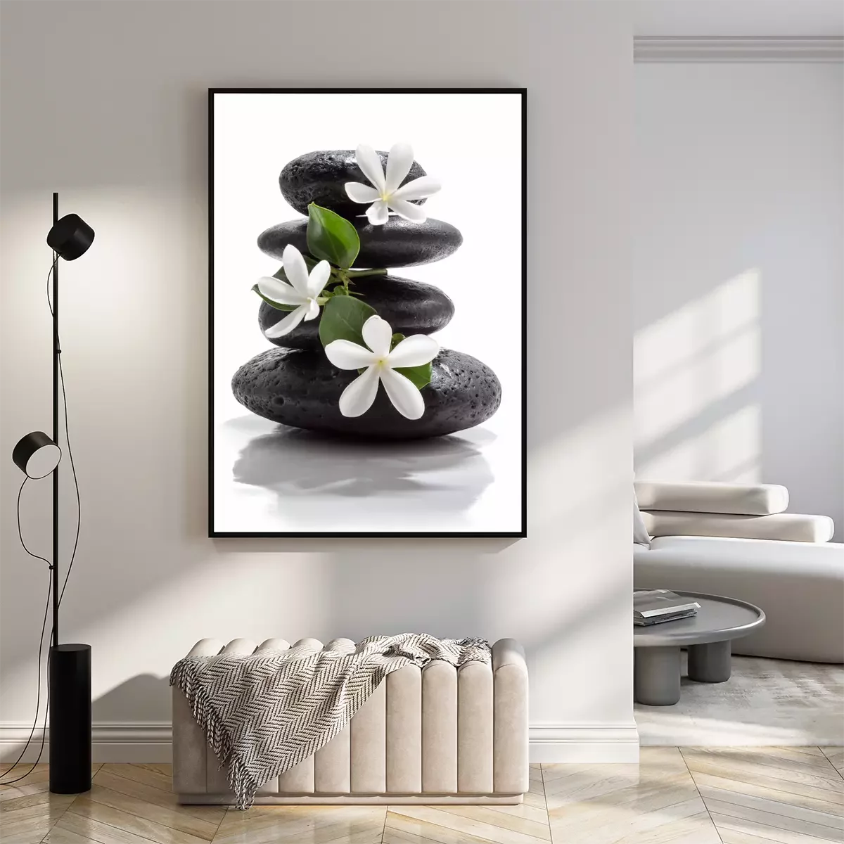 Zwarte stenen met plumeria en bamboe ondergedompeld in water