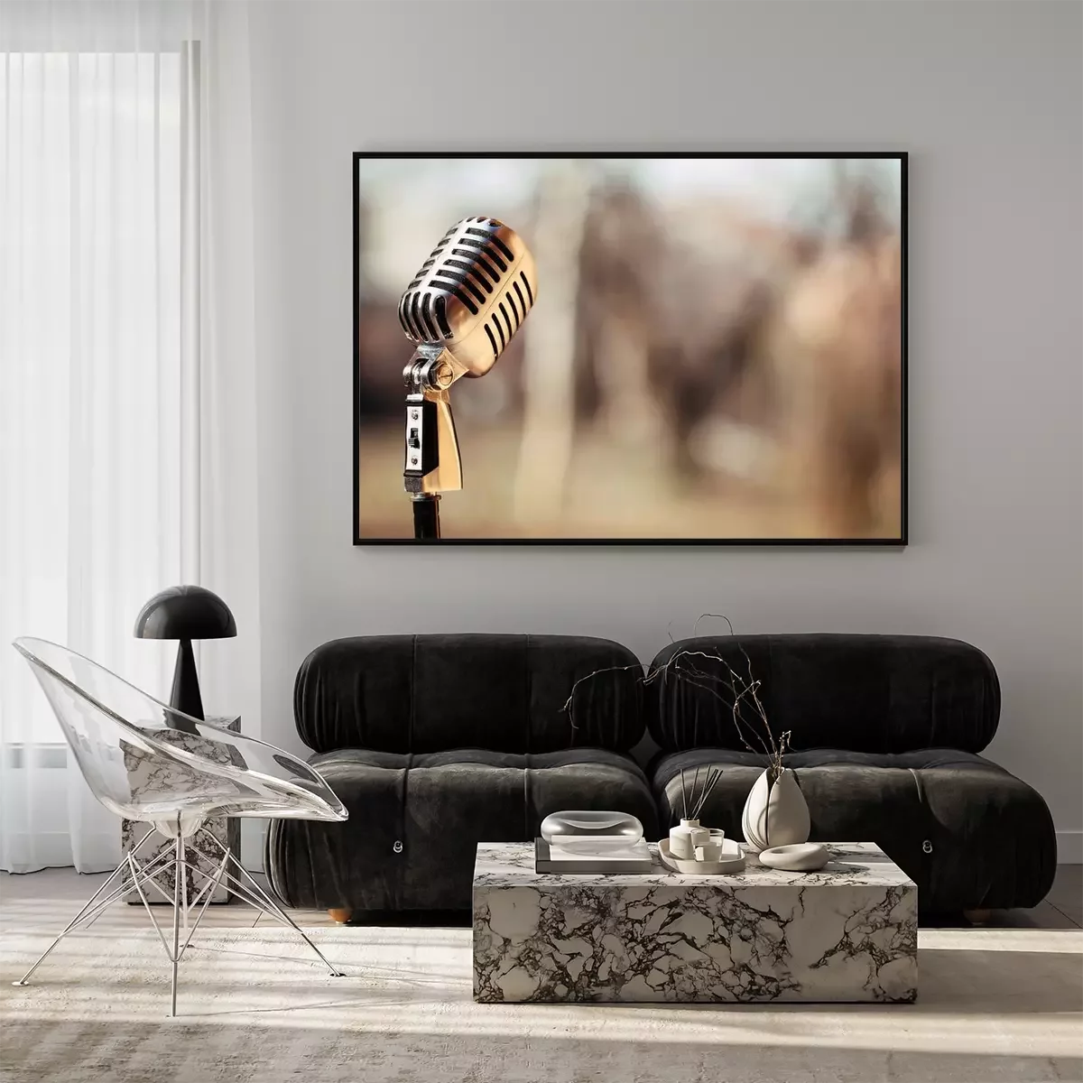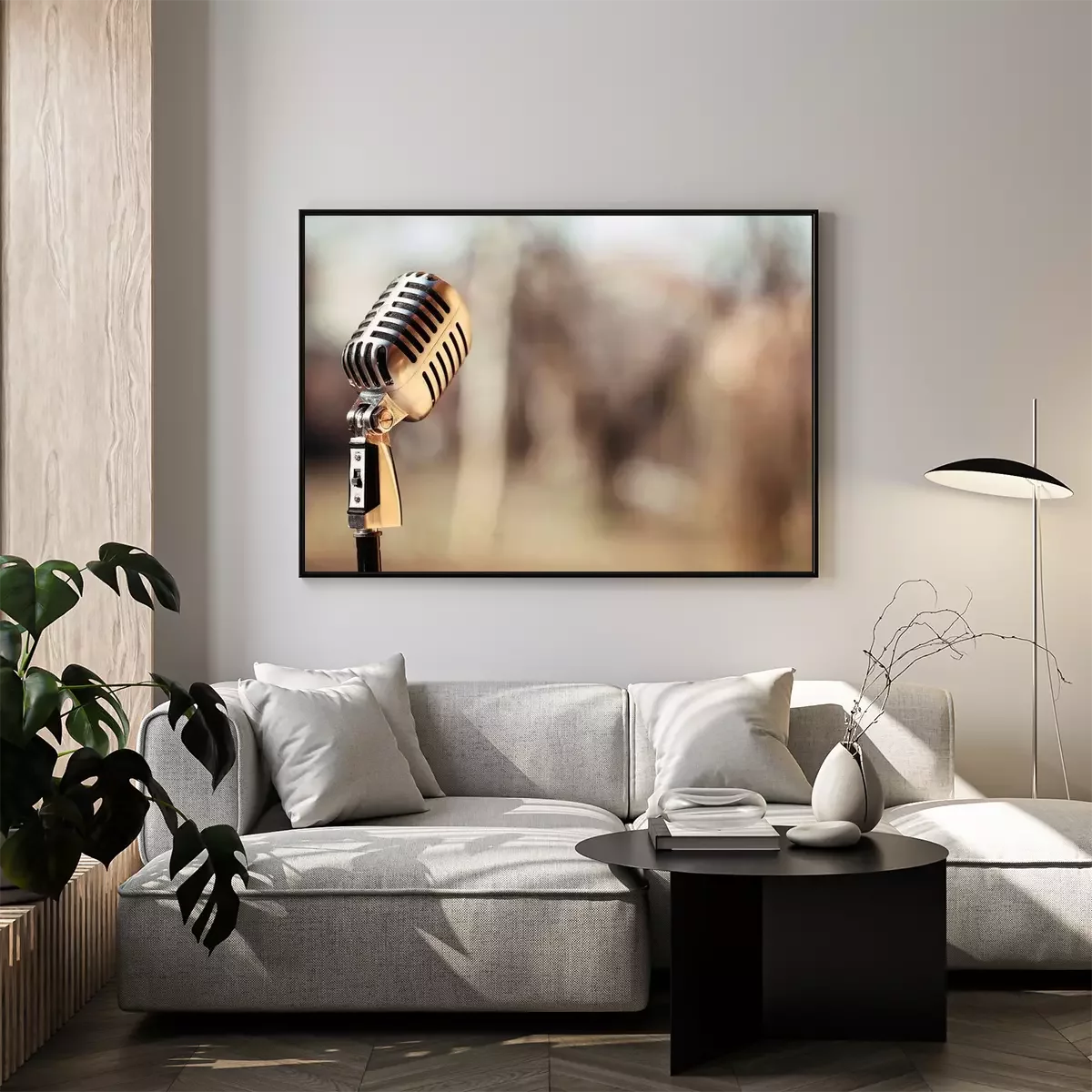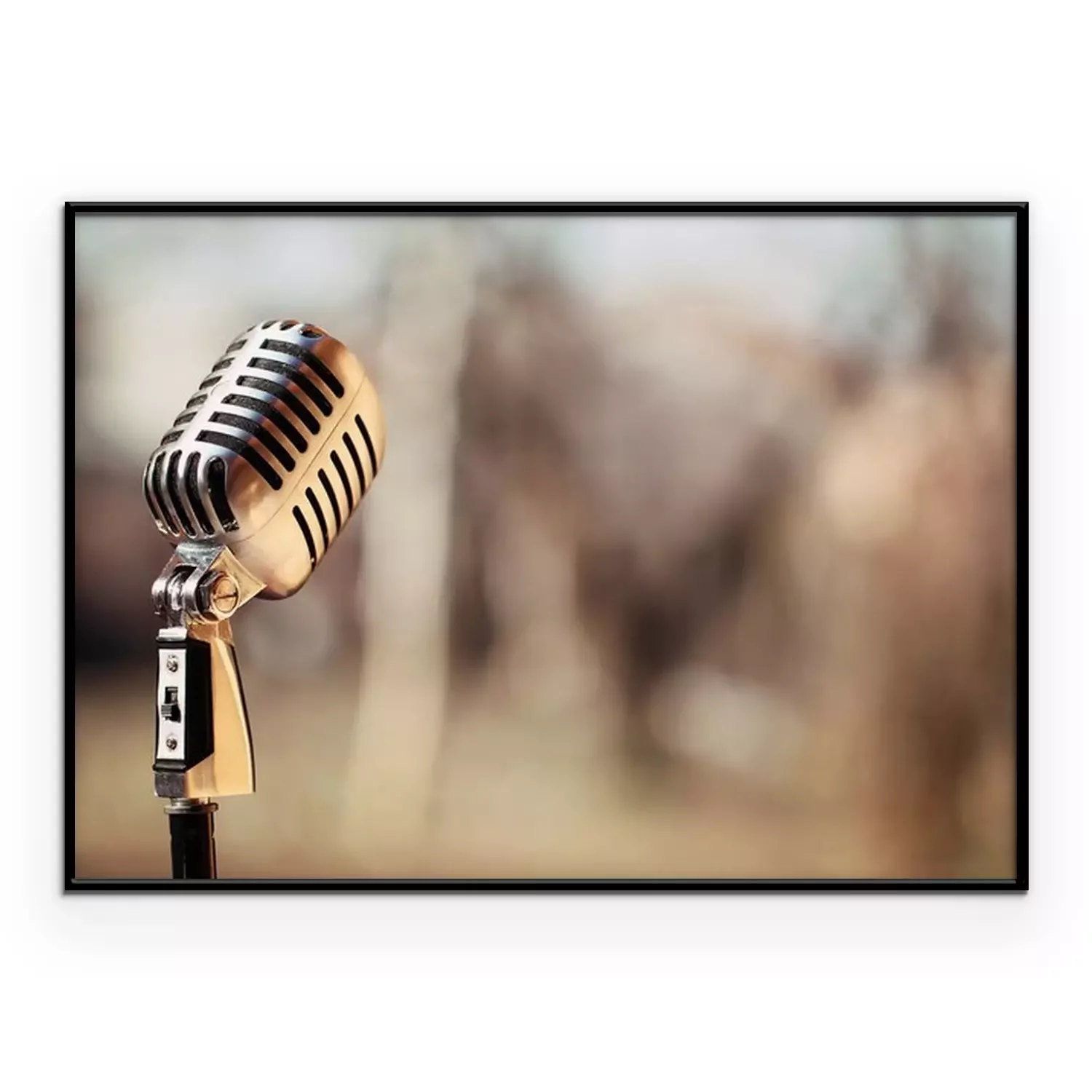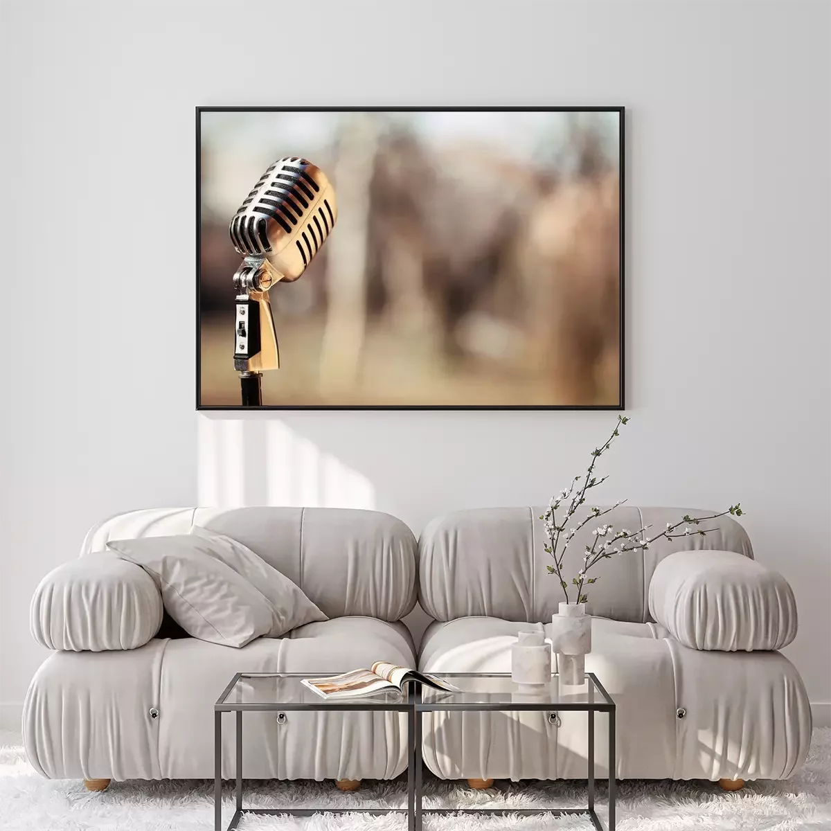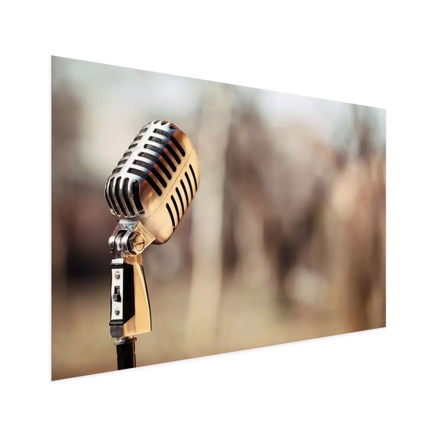 Poster: Zilveren vintage microfoon in de studio op blured achtergrond