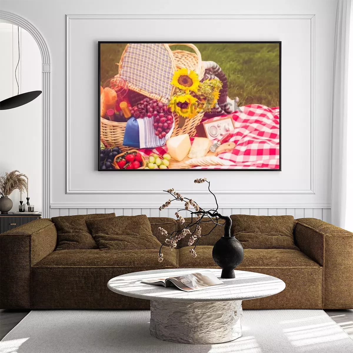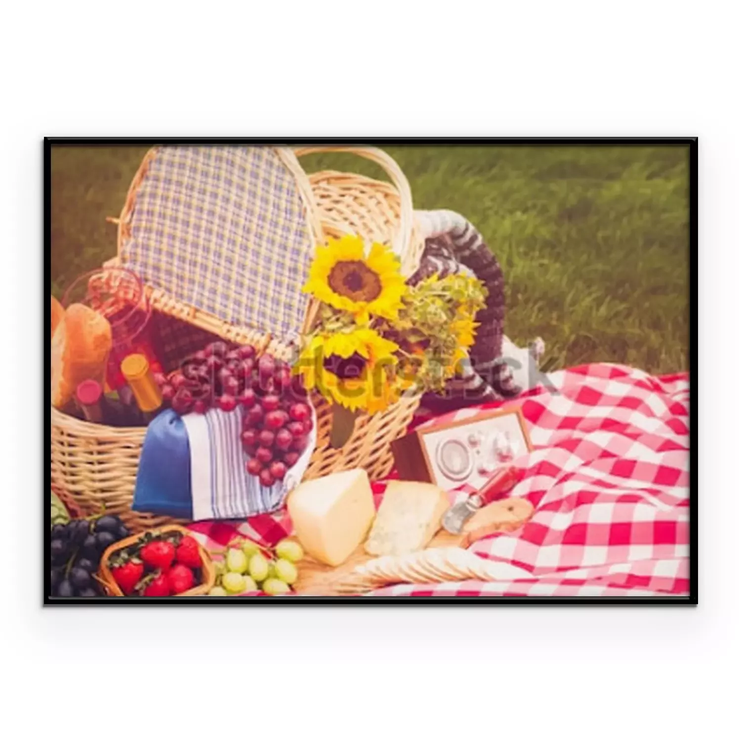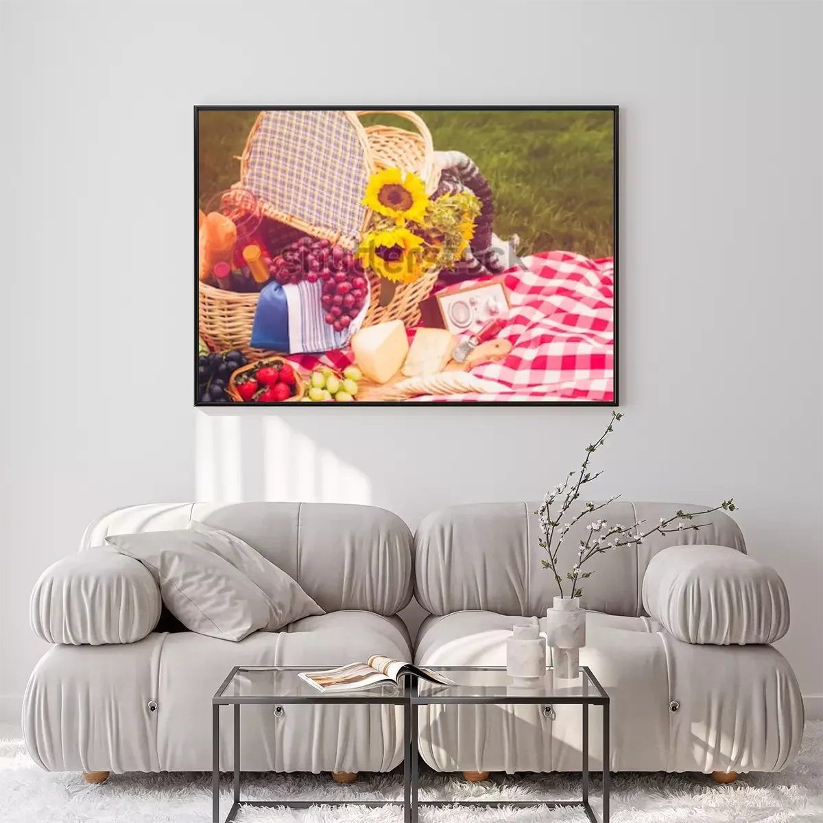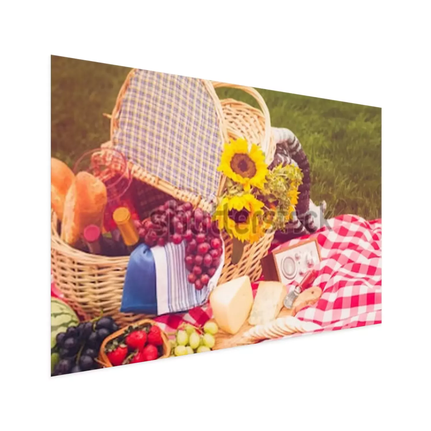 Poster: Zomerpicknick met een mand met voedsel in het park.