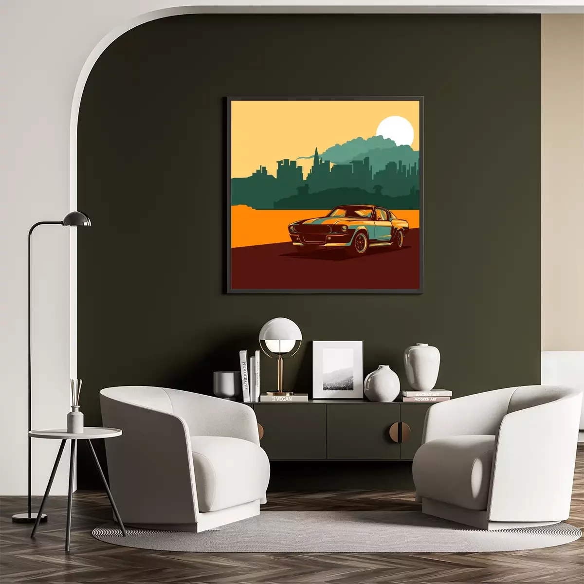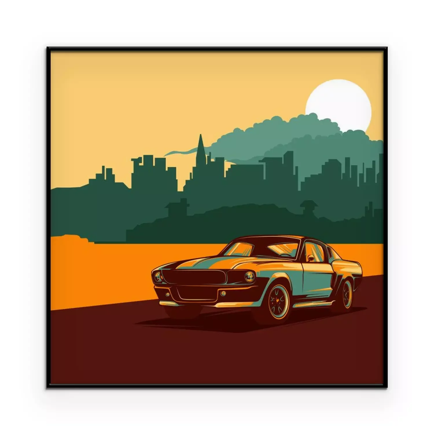 Poster: Zonsondergang en auto voertuig