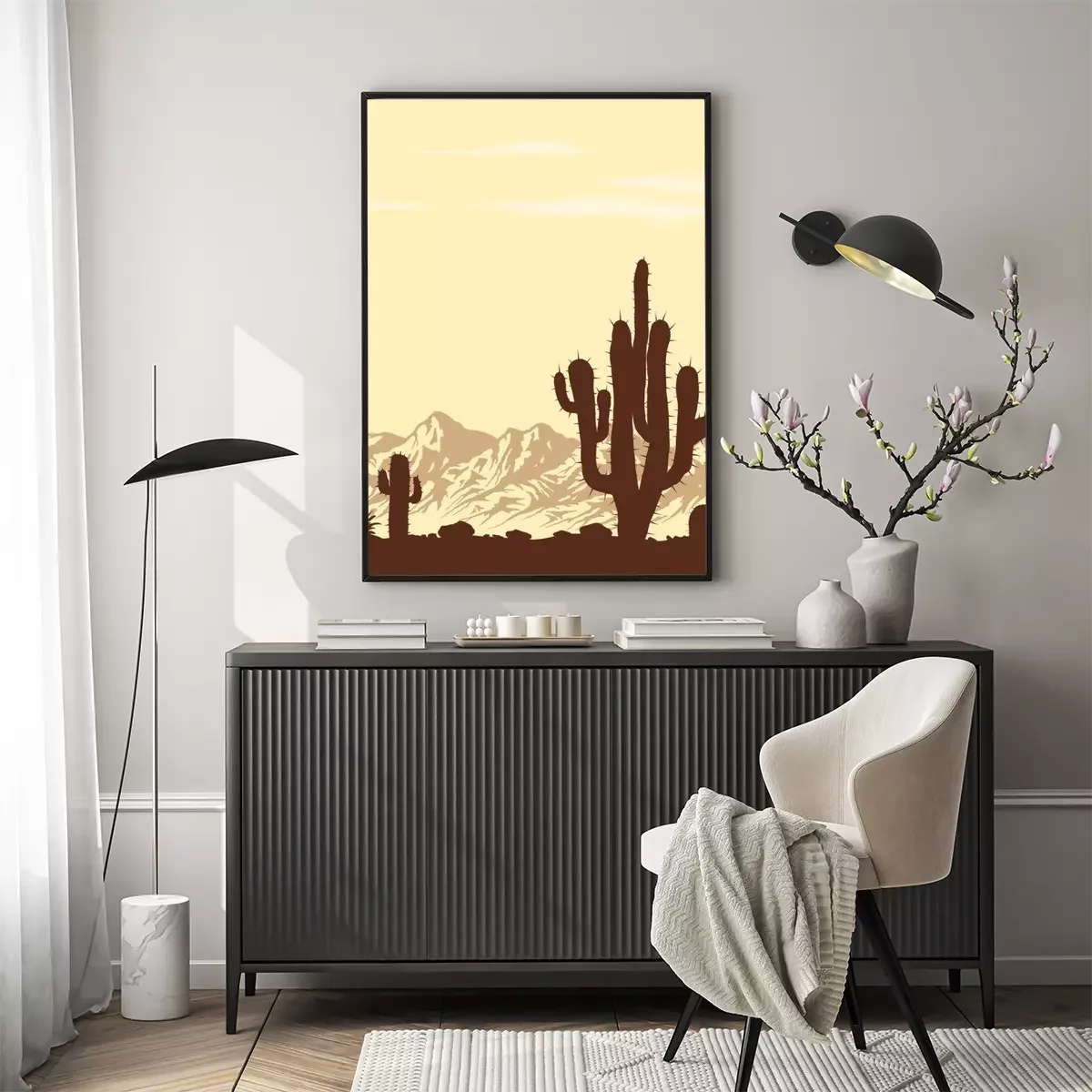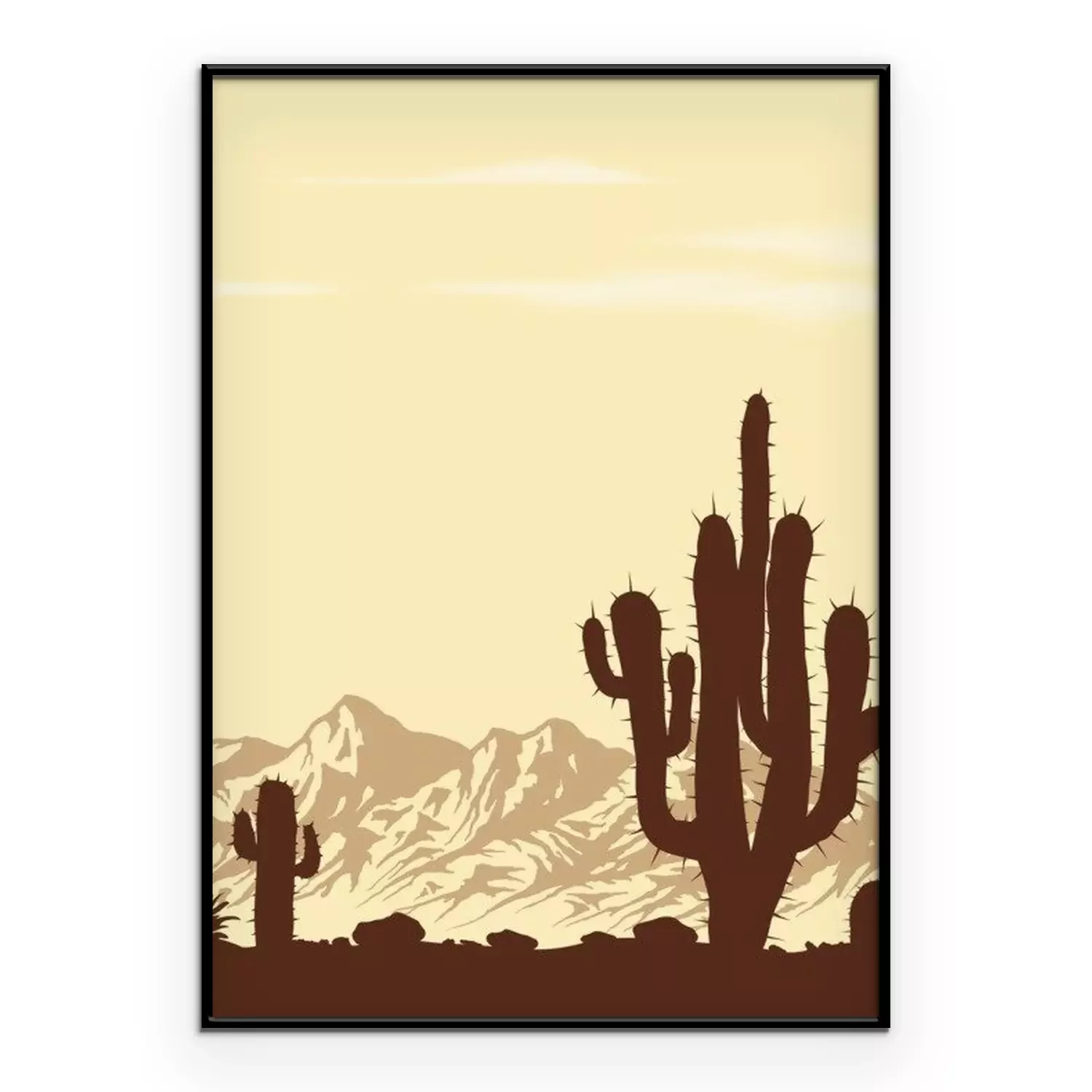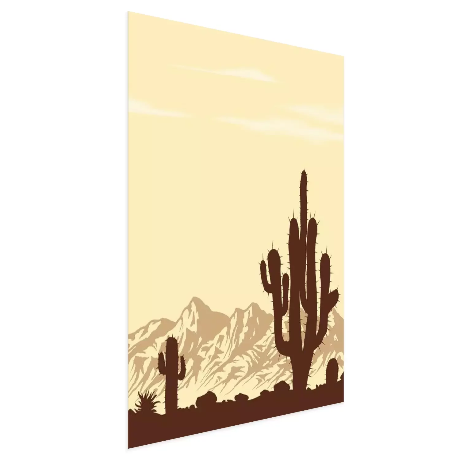 Poster: Zonsondergang in lifless steenwoestijn met cactussen. Vector landschap.