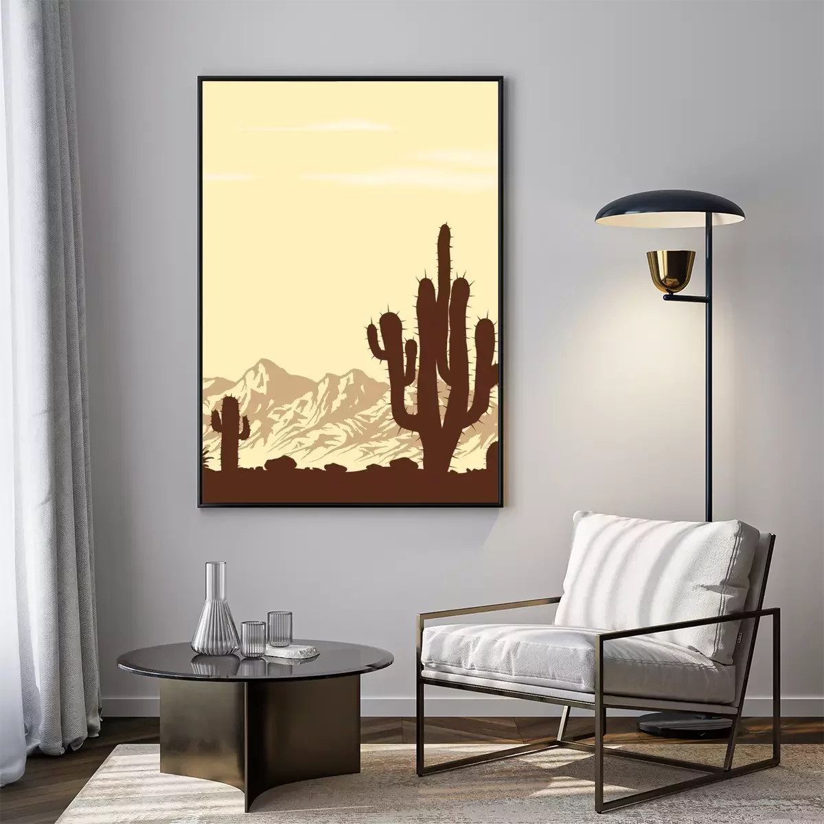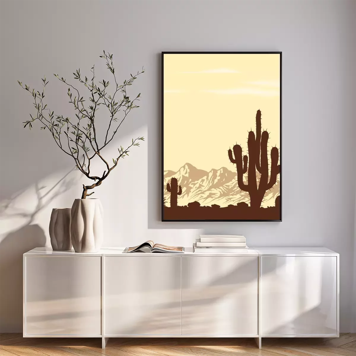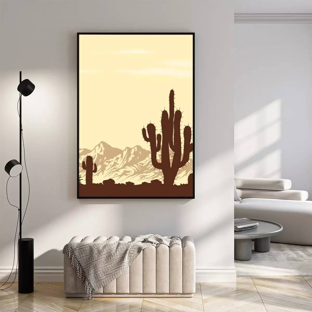 Poster: Zonsondergang in lifless steenwoestijn met cactussen. Vector landschap.