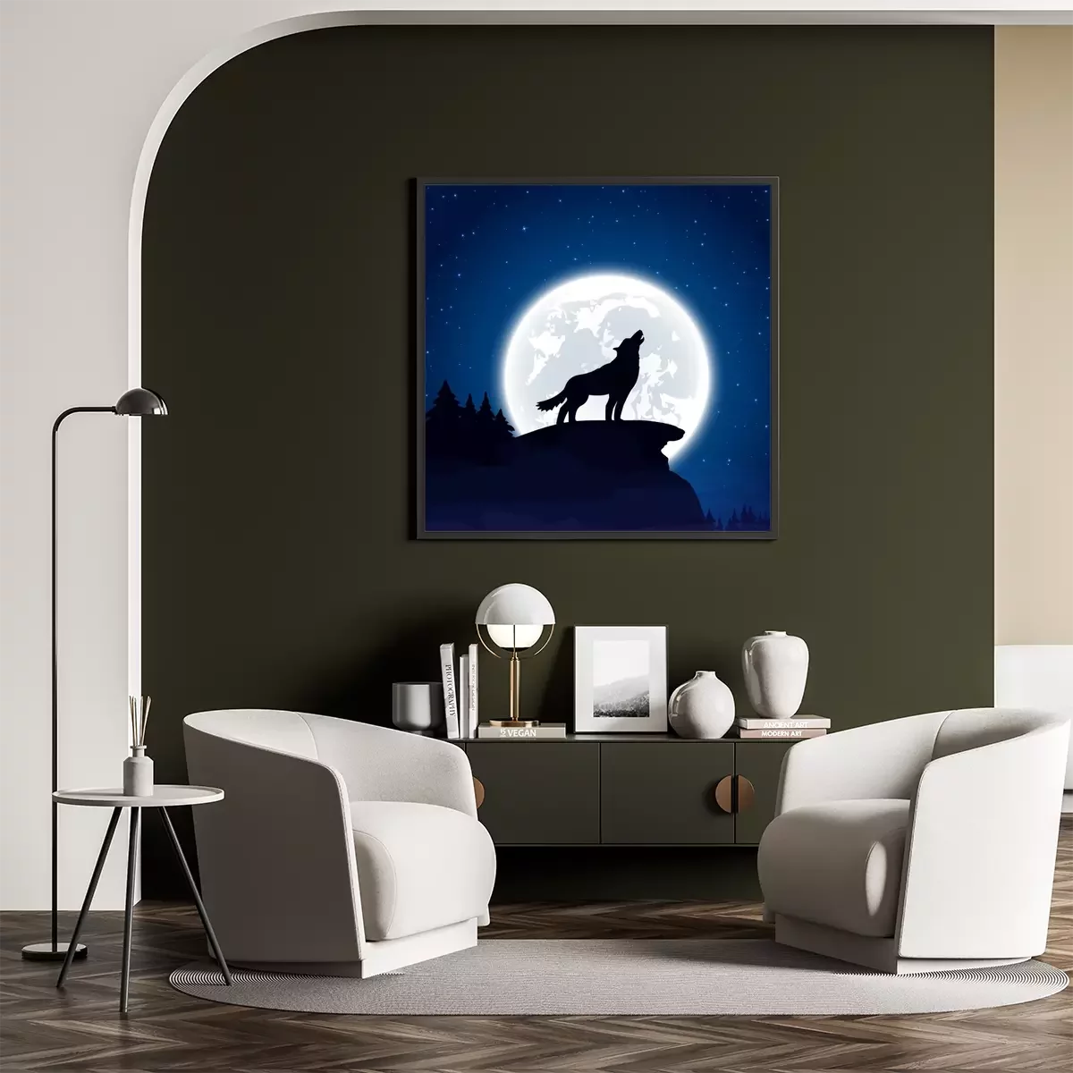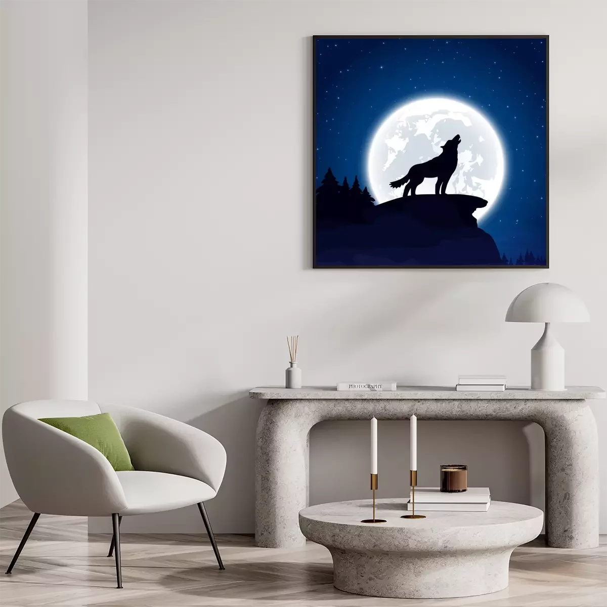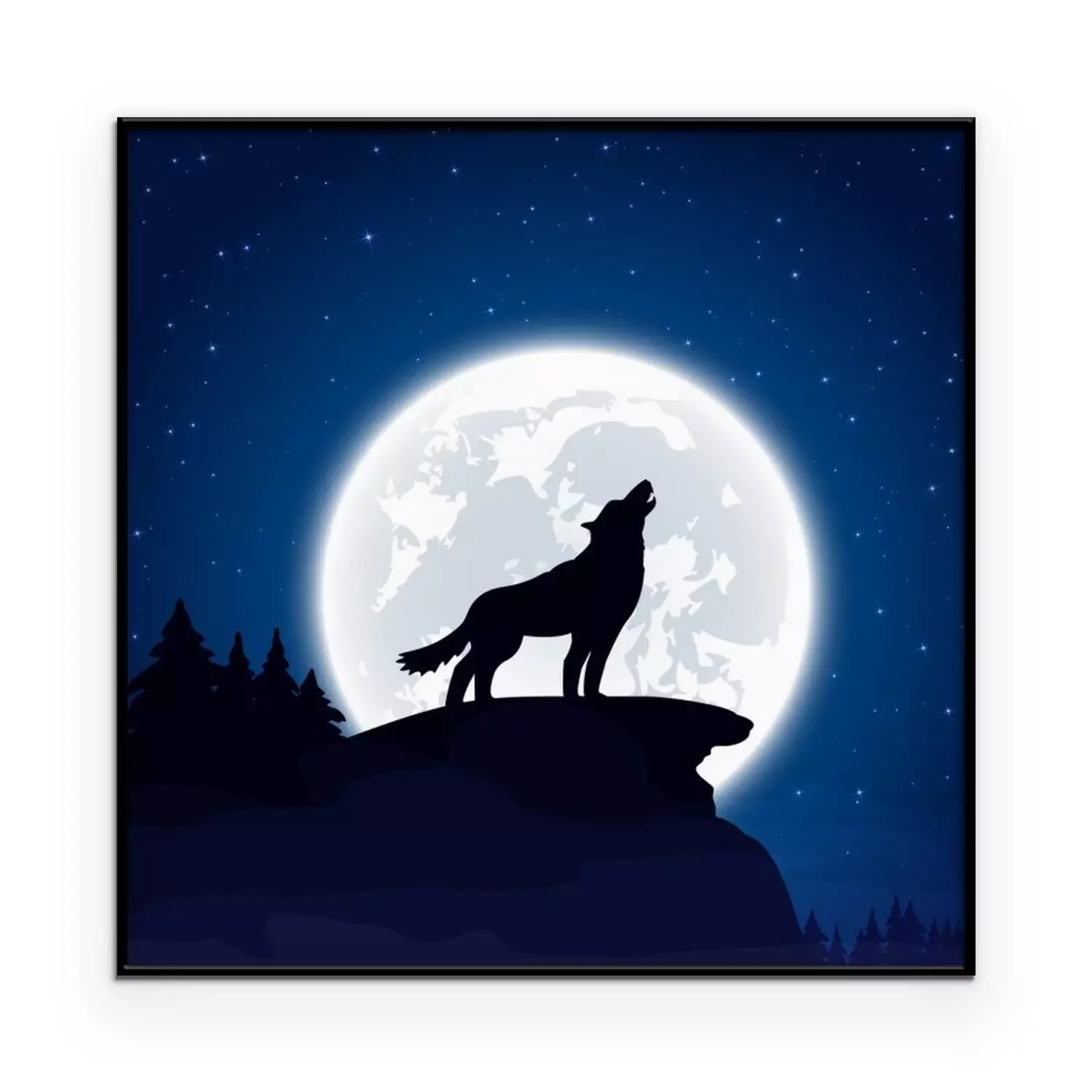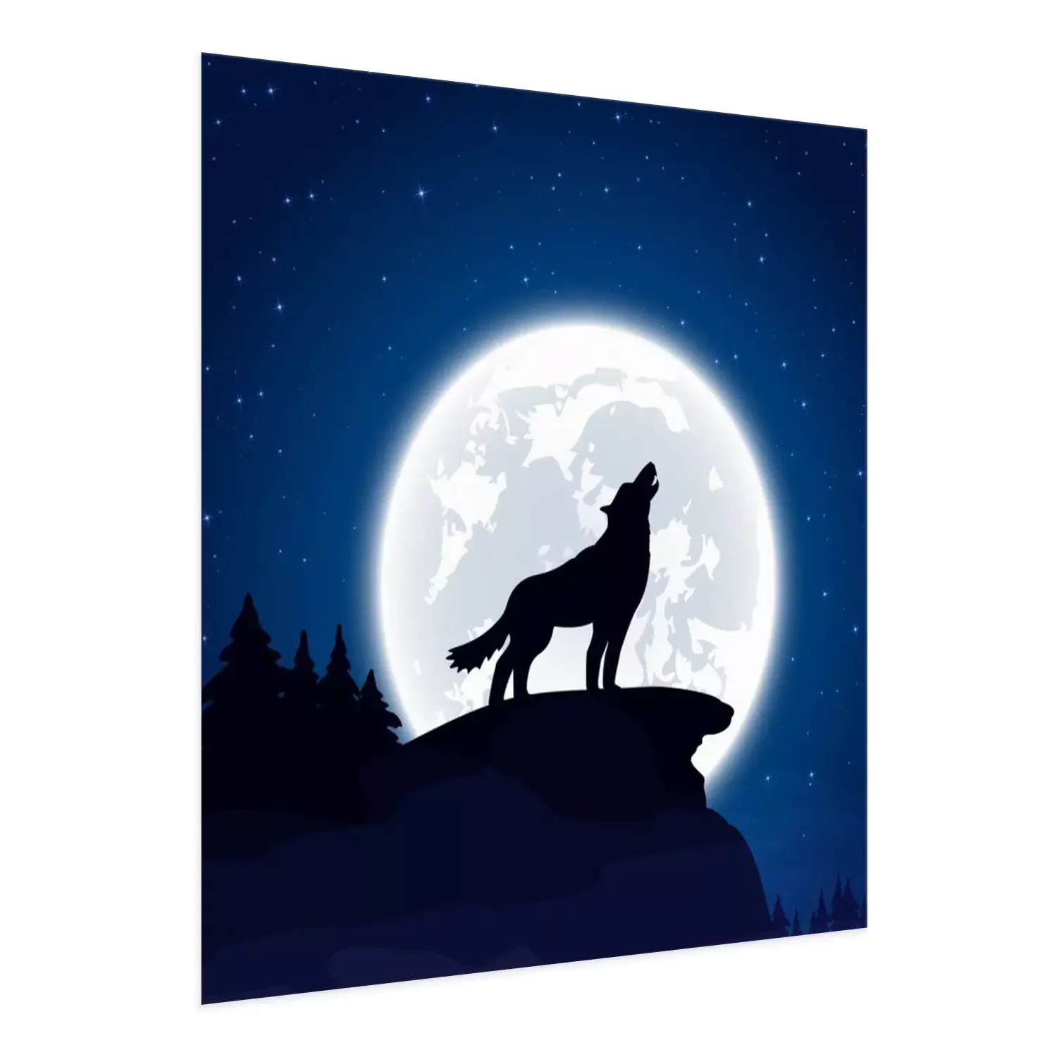 Poster: Zwart silhouet van een wolf op de achtergrond van de maan