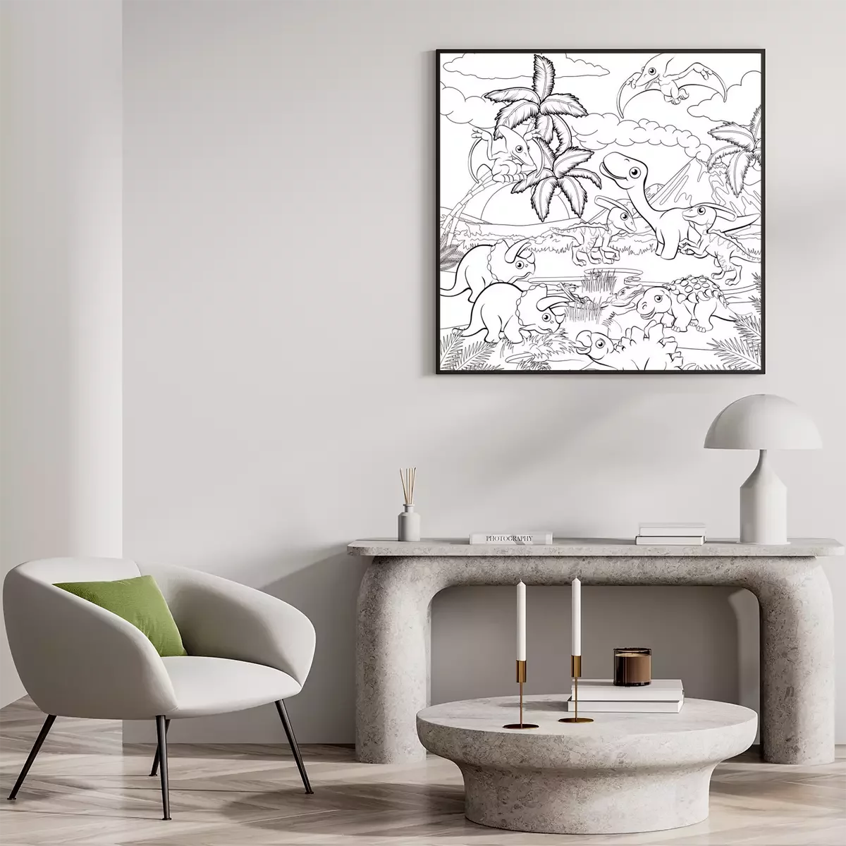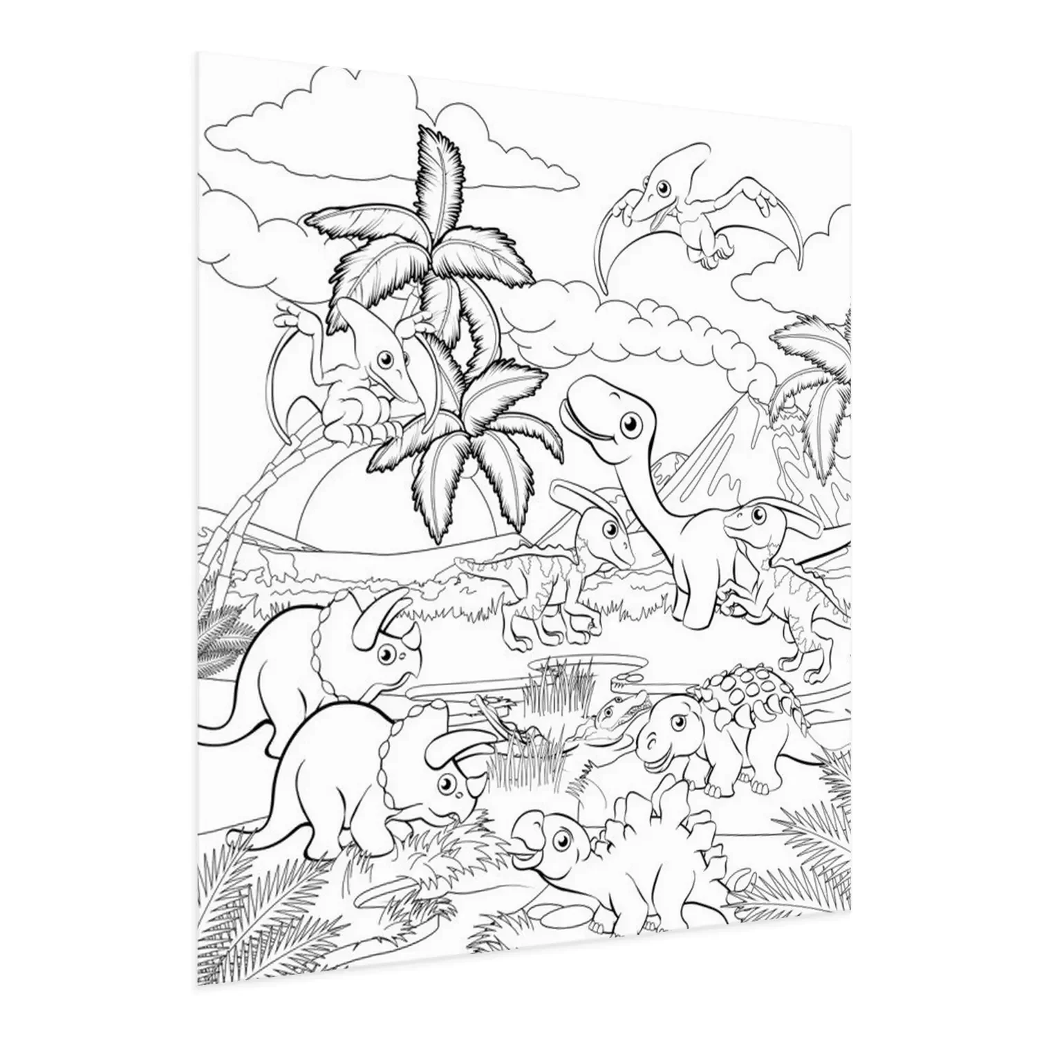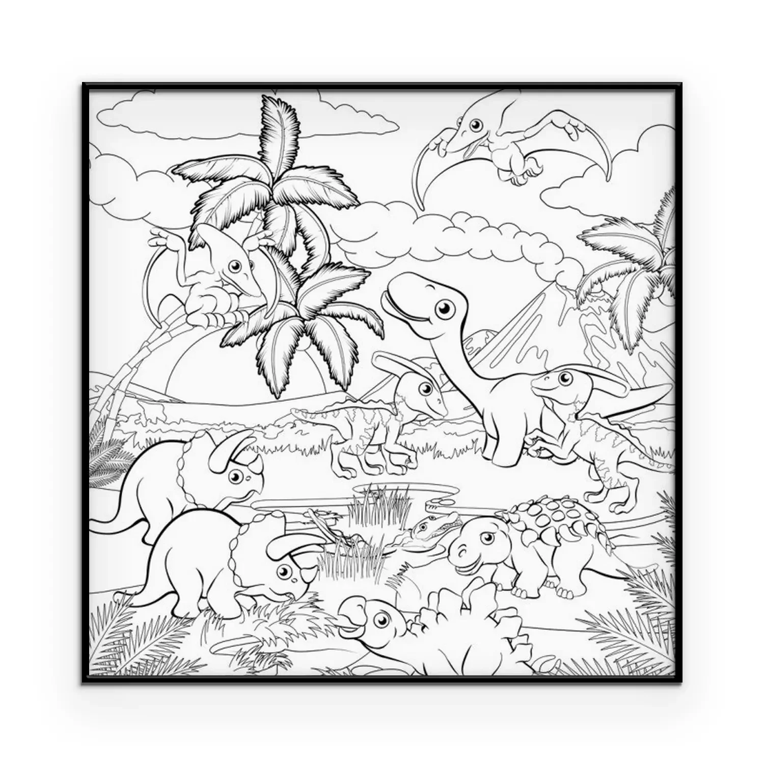 Poster: Zwart-wit afbeelding van een prehistorisch landschap met dinosaurussen