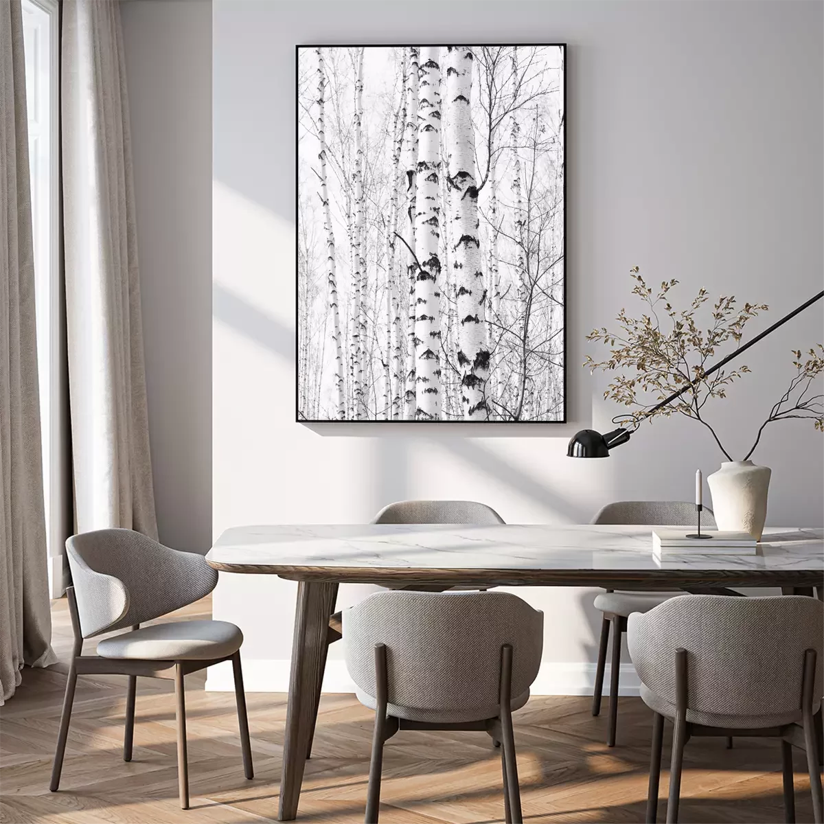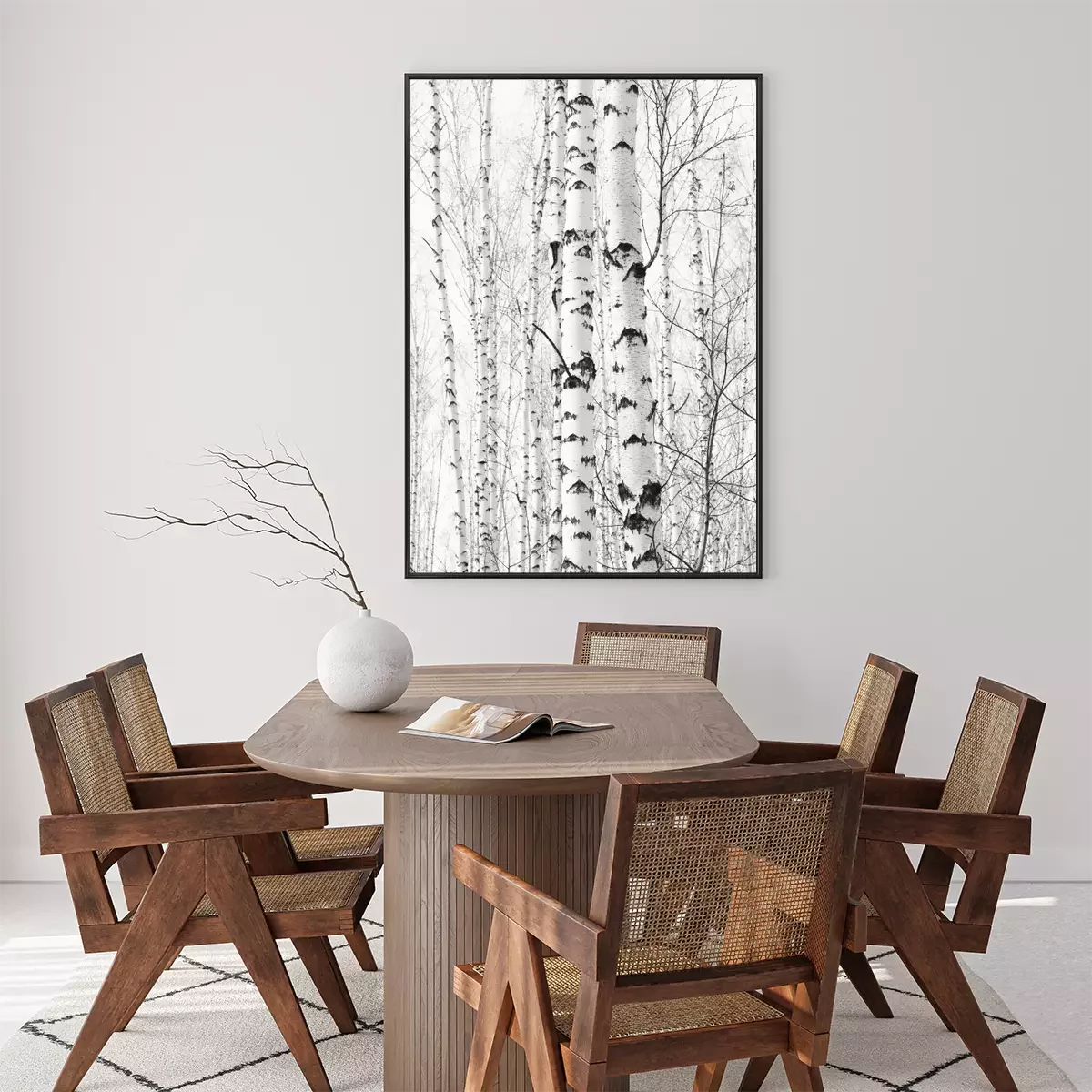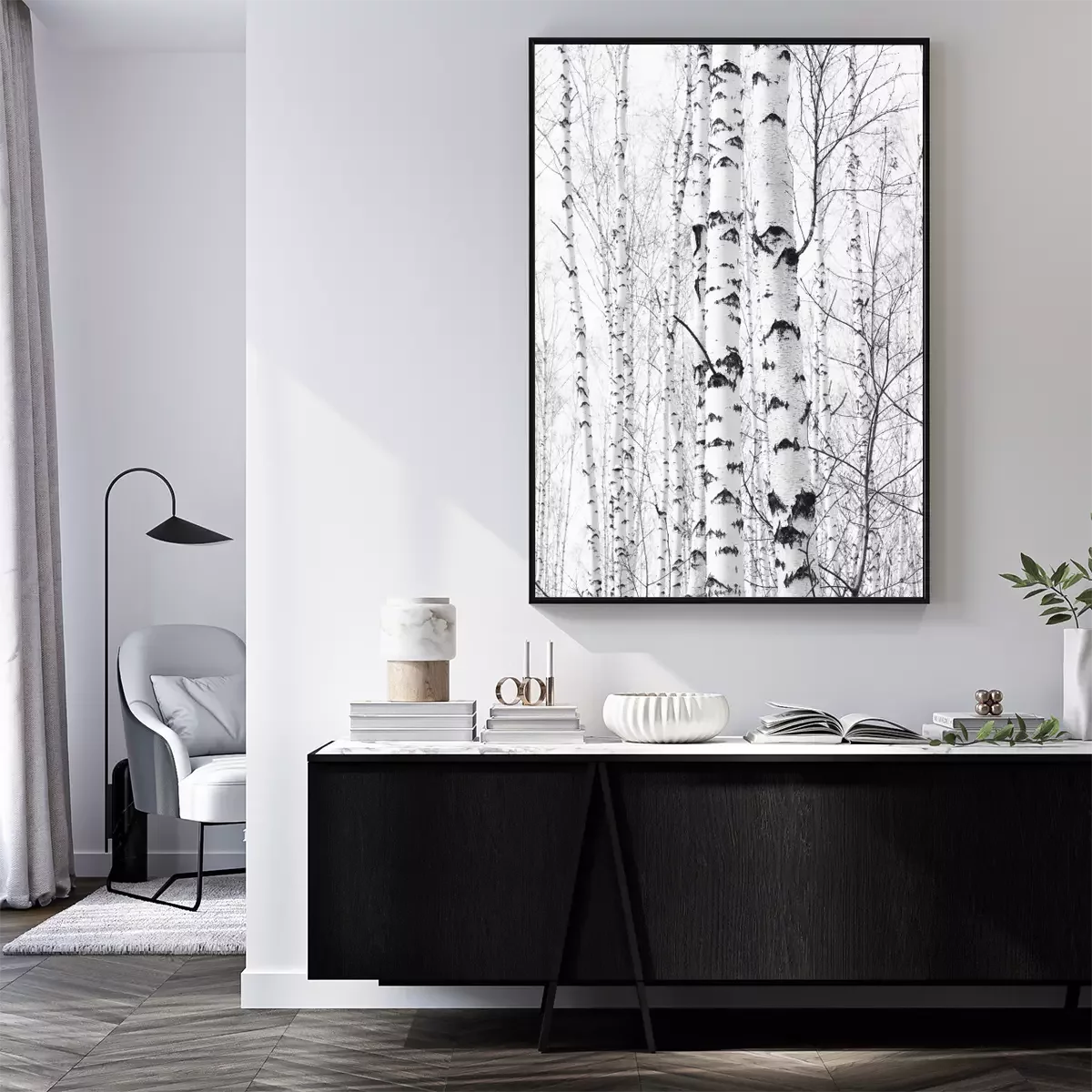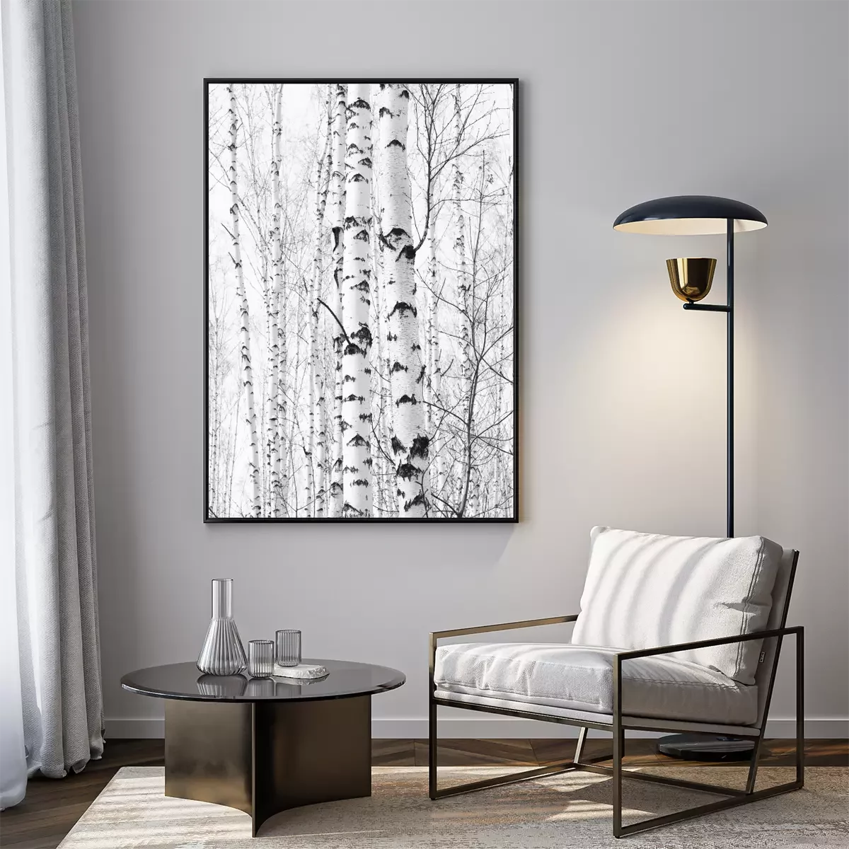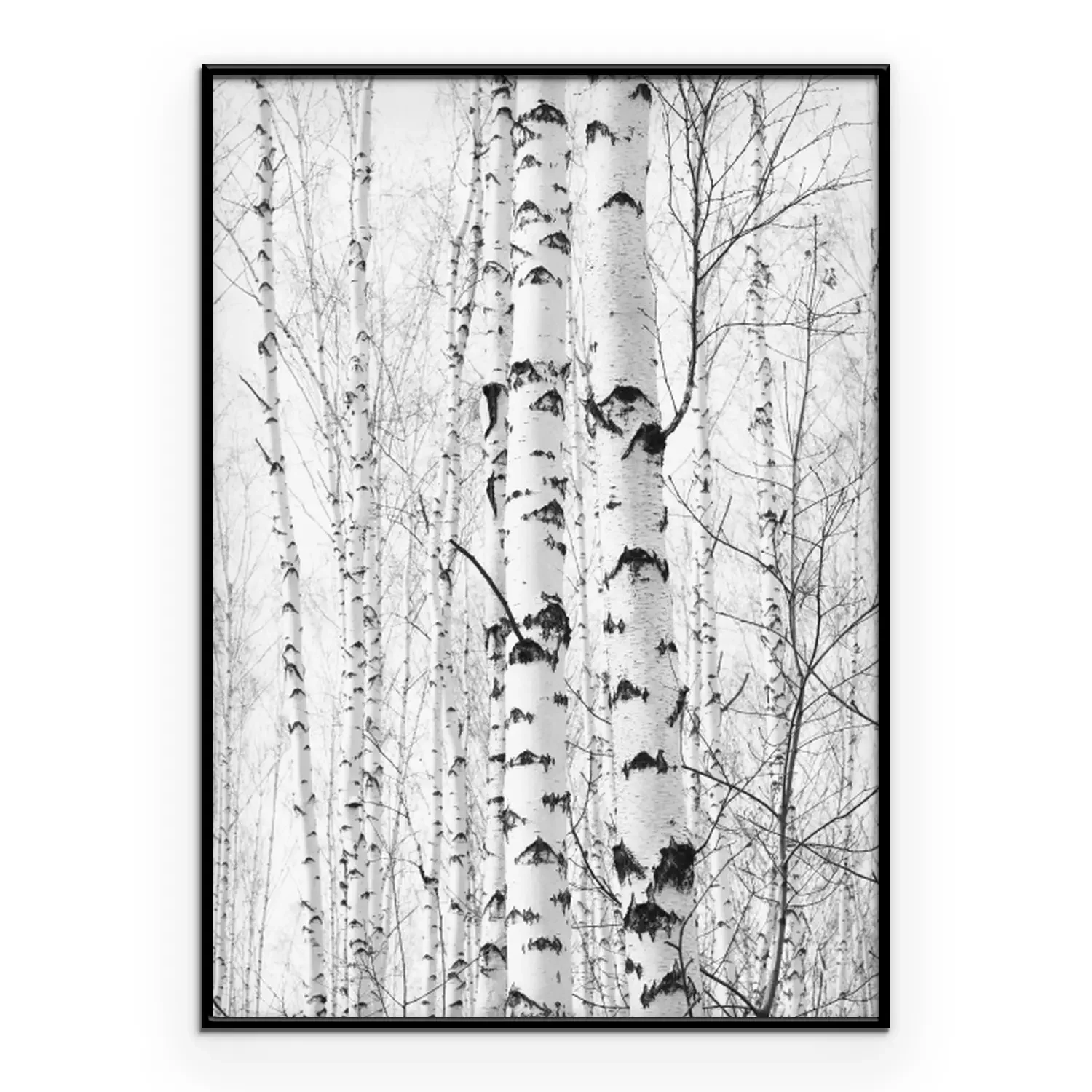 Poster: zwart-wit foto met witte berken met berkenschors in berkenbos