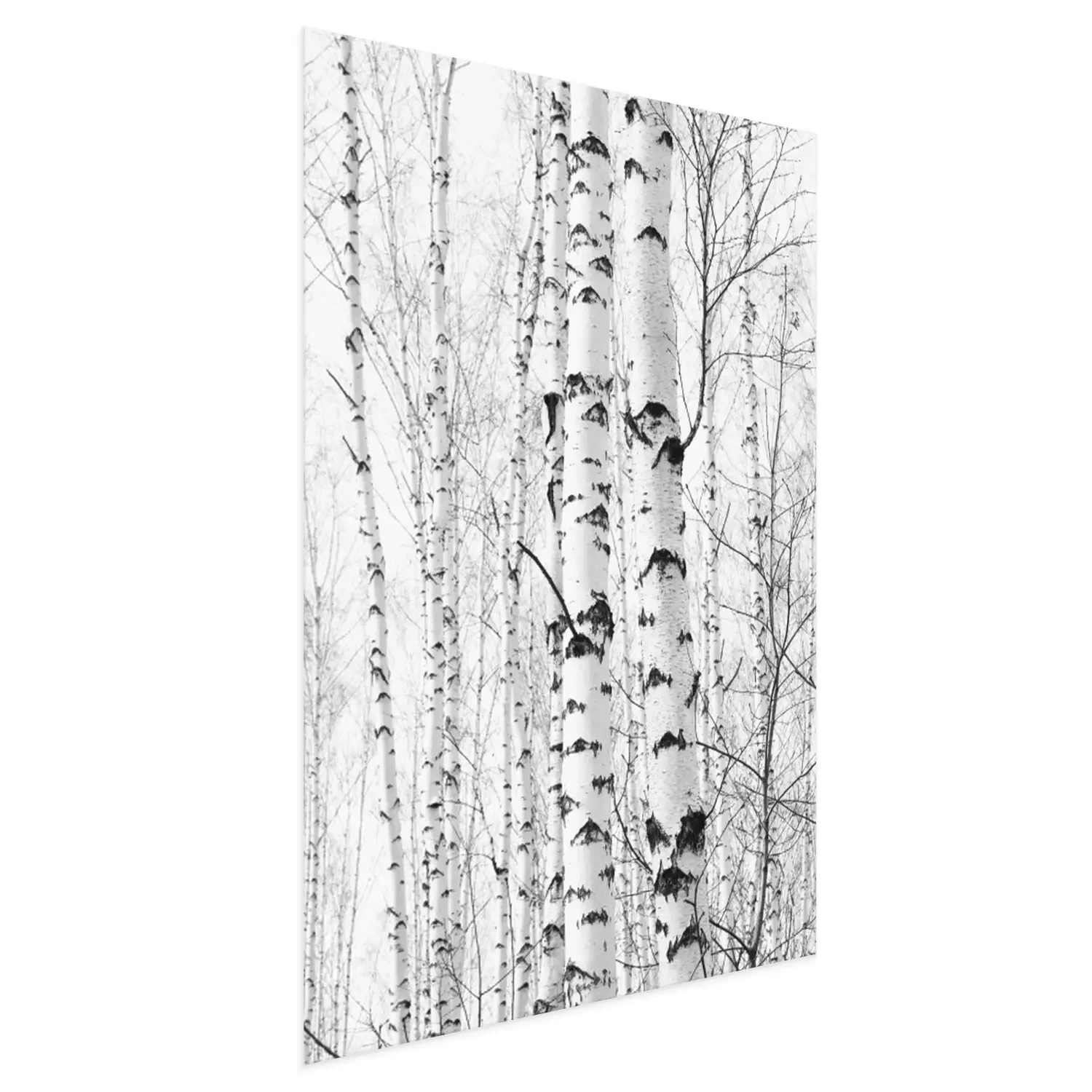 Poster zwart-wit foto met witte berken met berkenschors in berkenbos