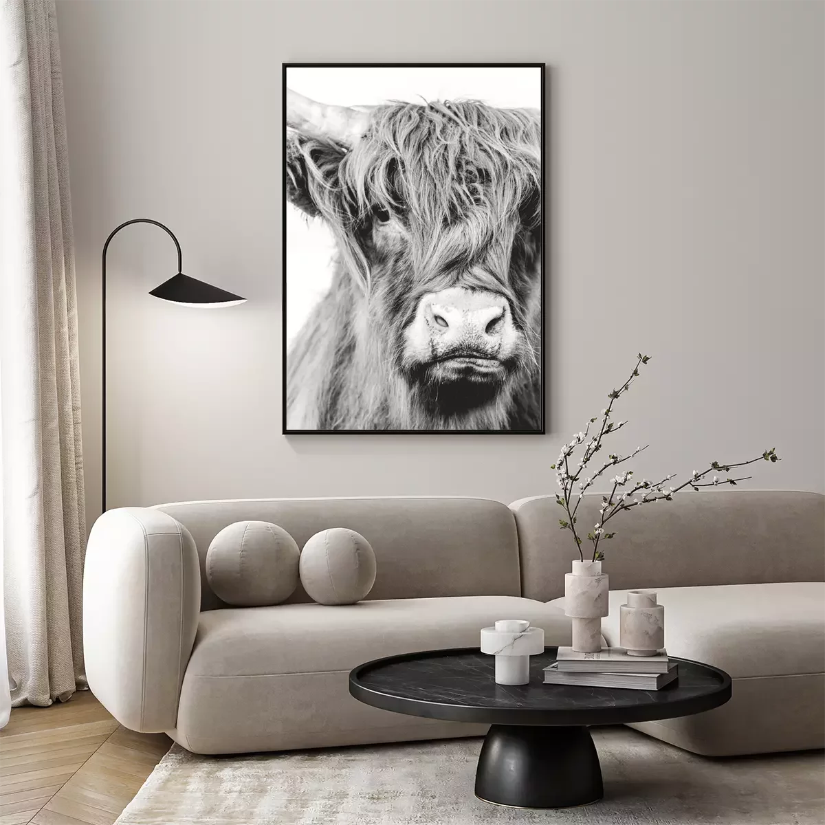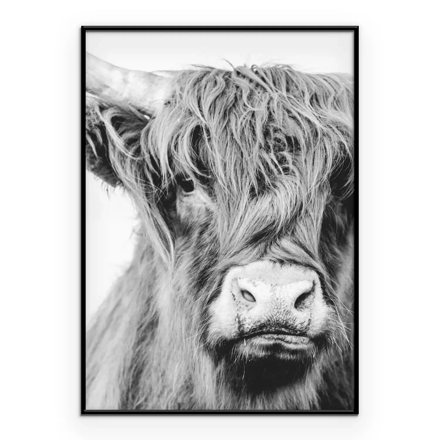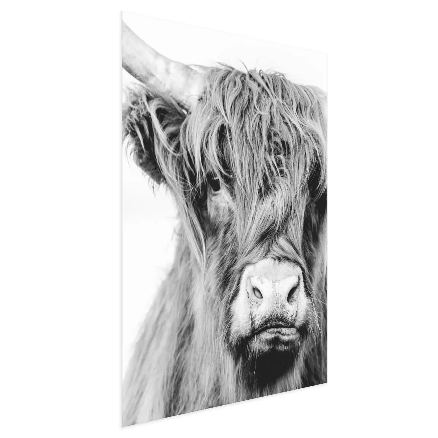 Poster: Zwart-wit portret van een langharige koe