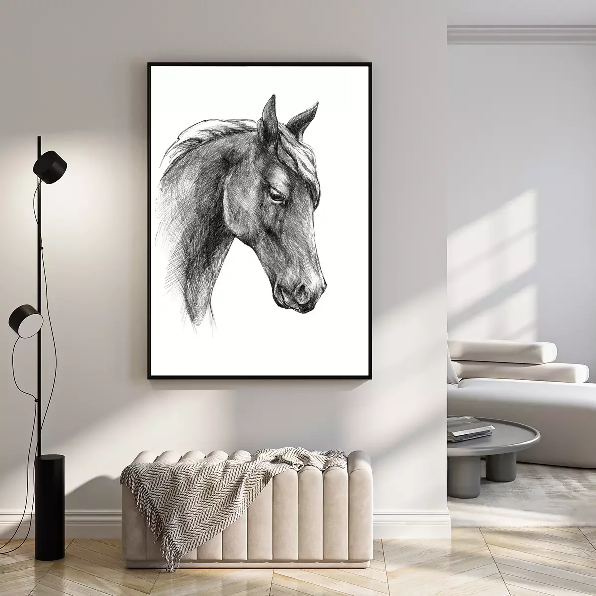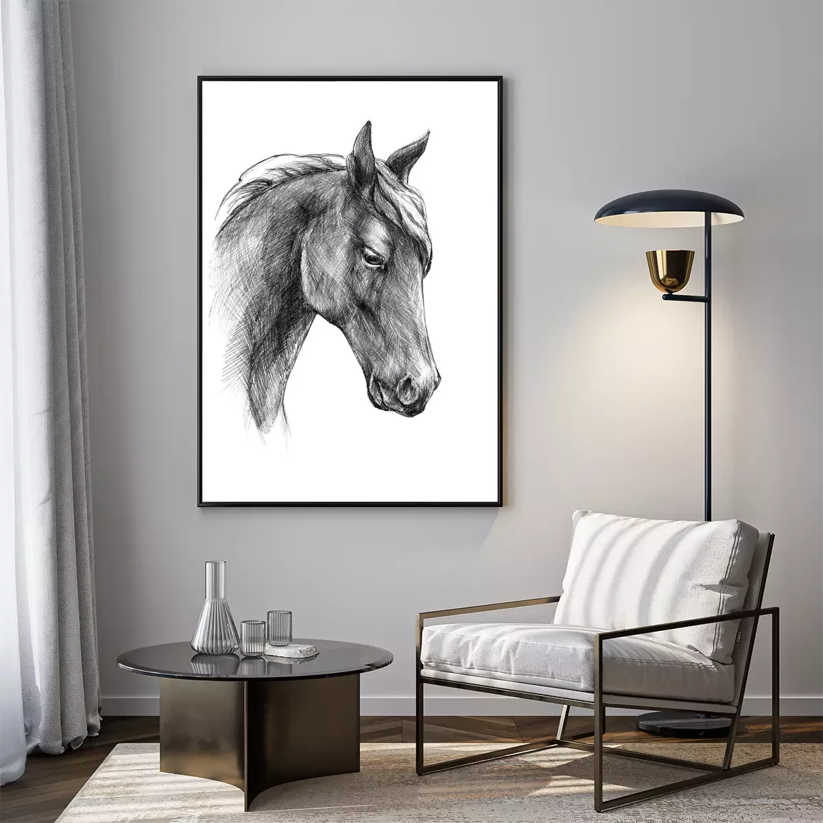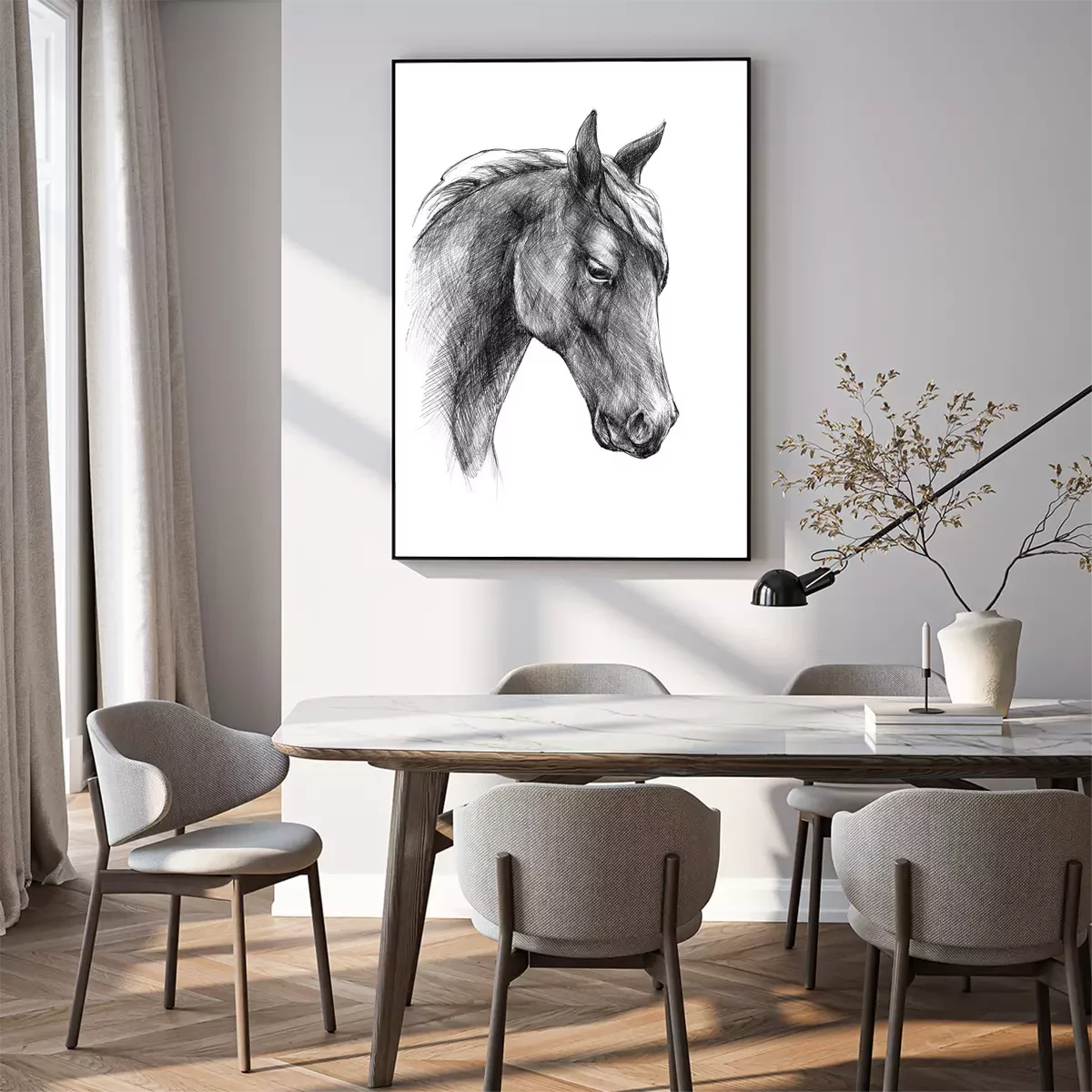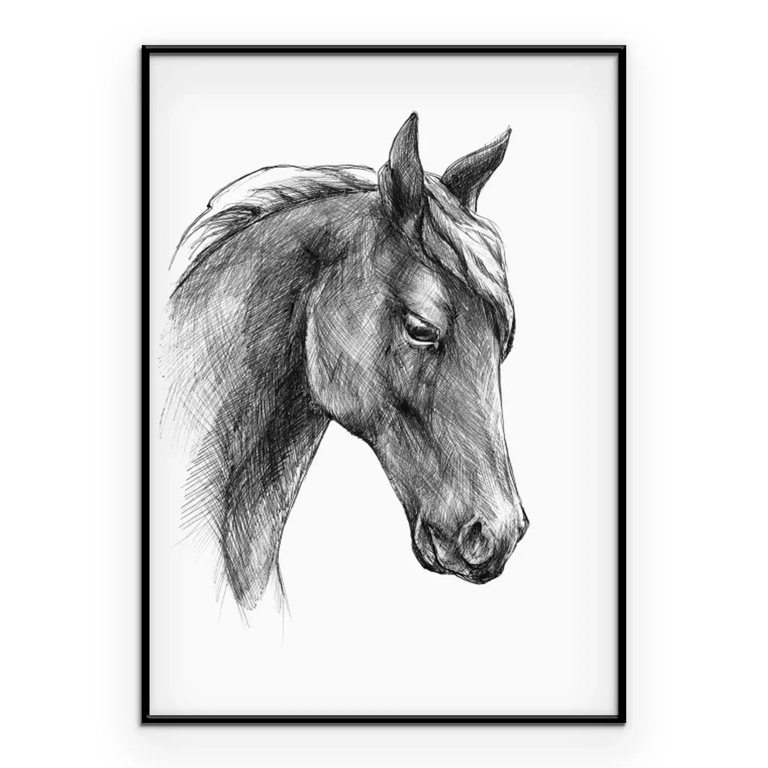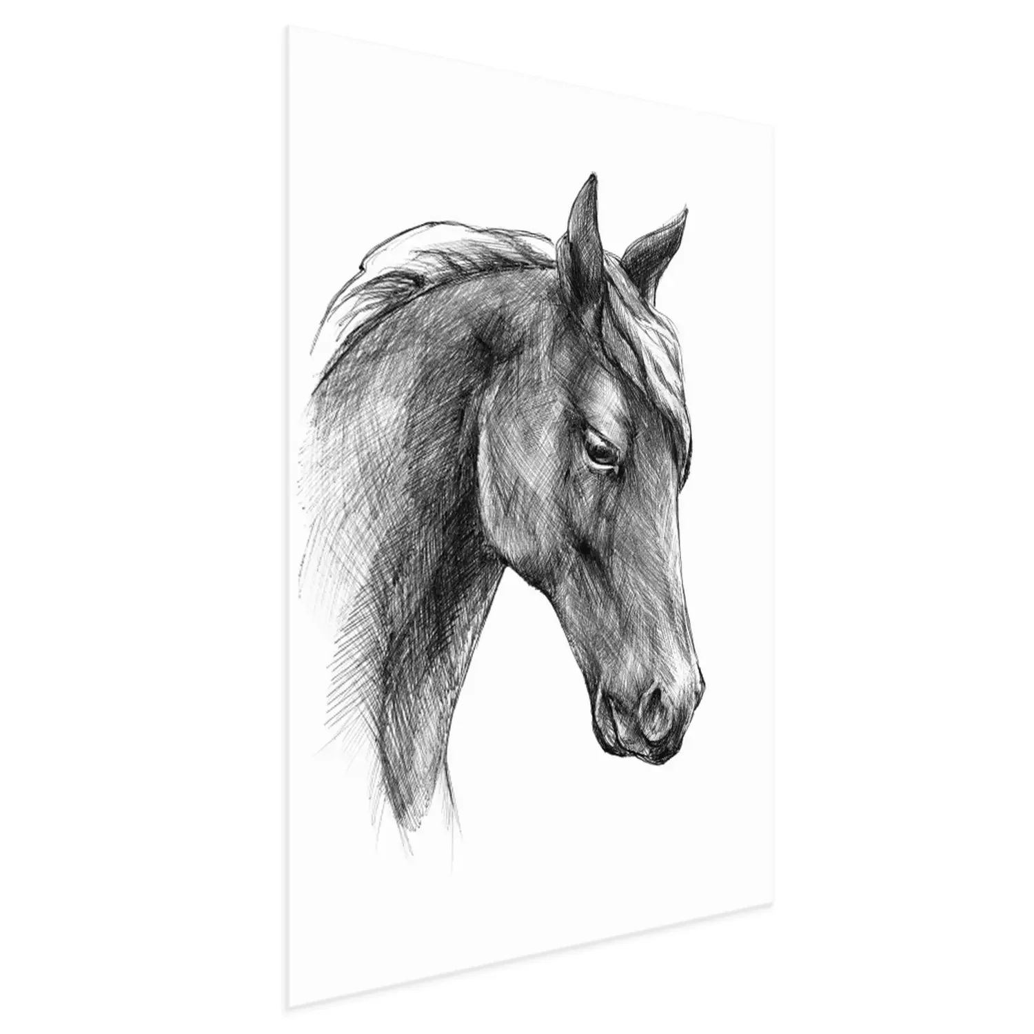 Poster: Zwart-wit portret van een paard in schetsstijl