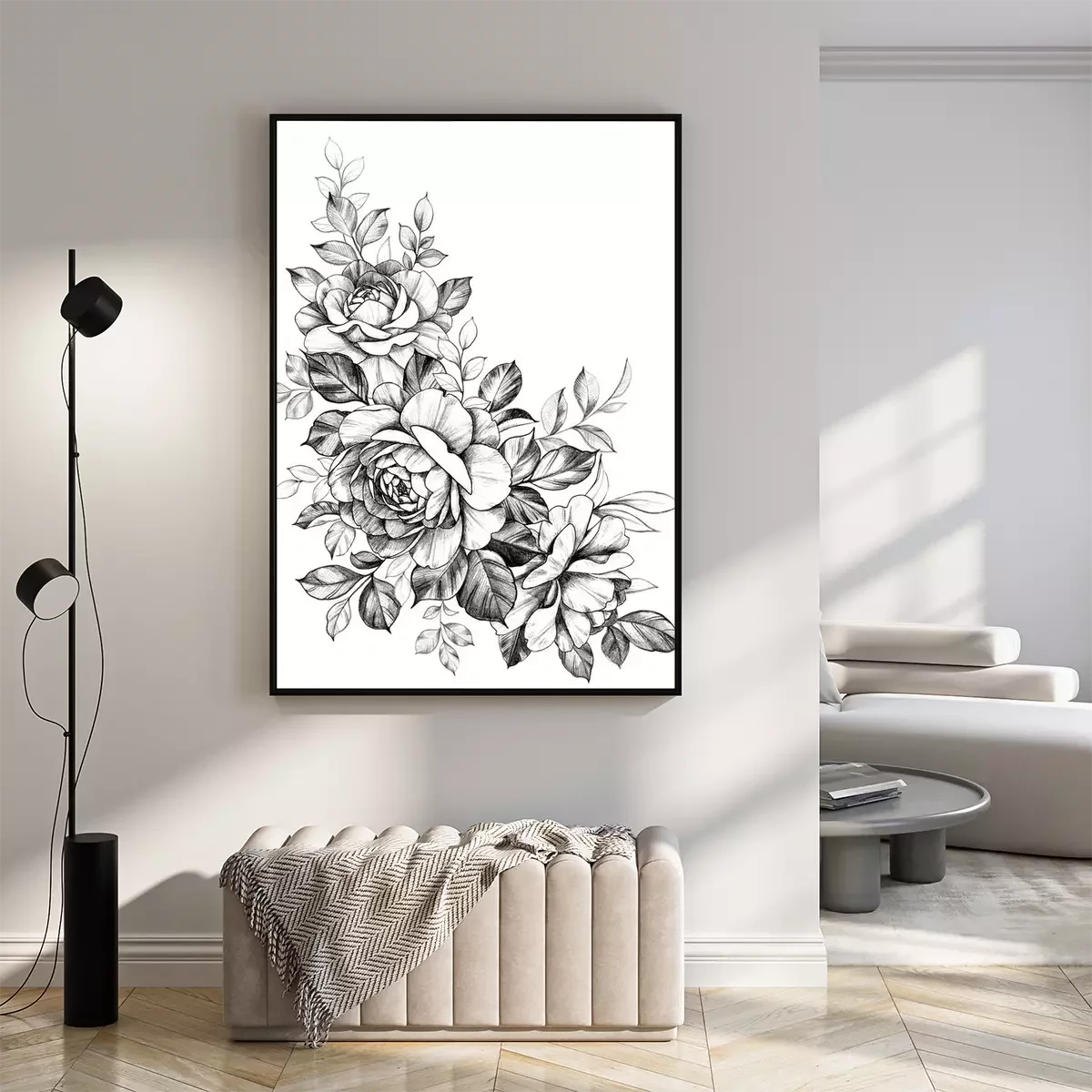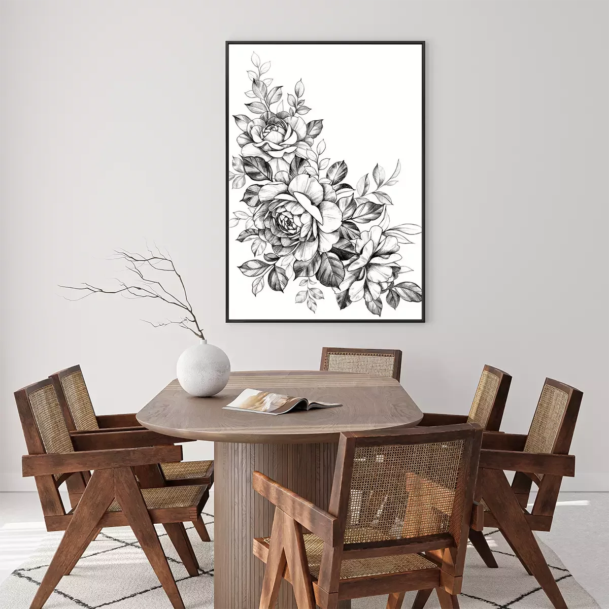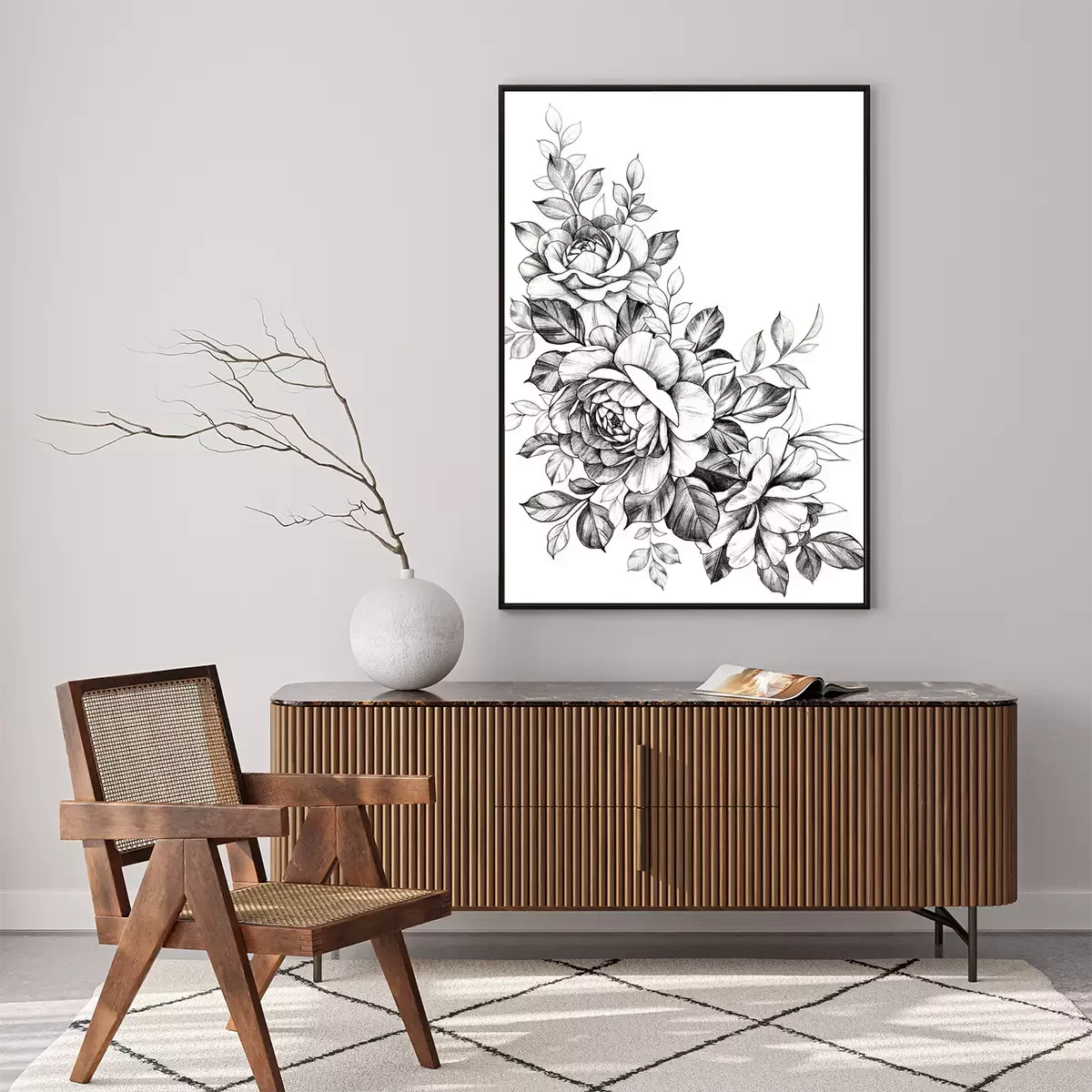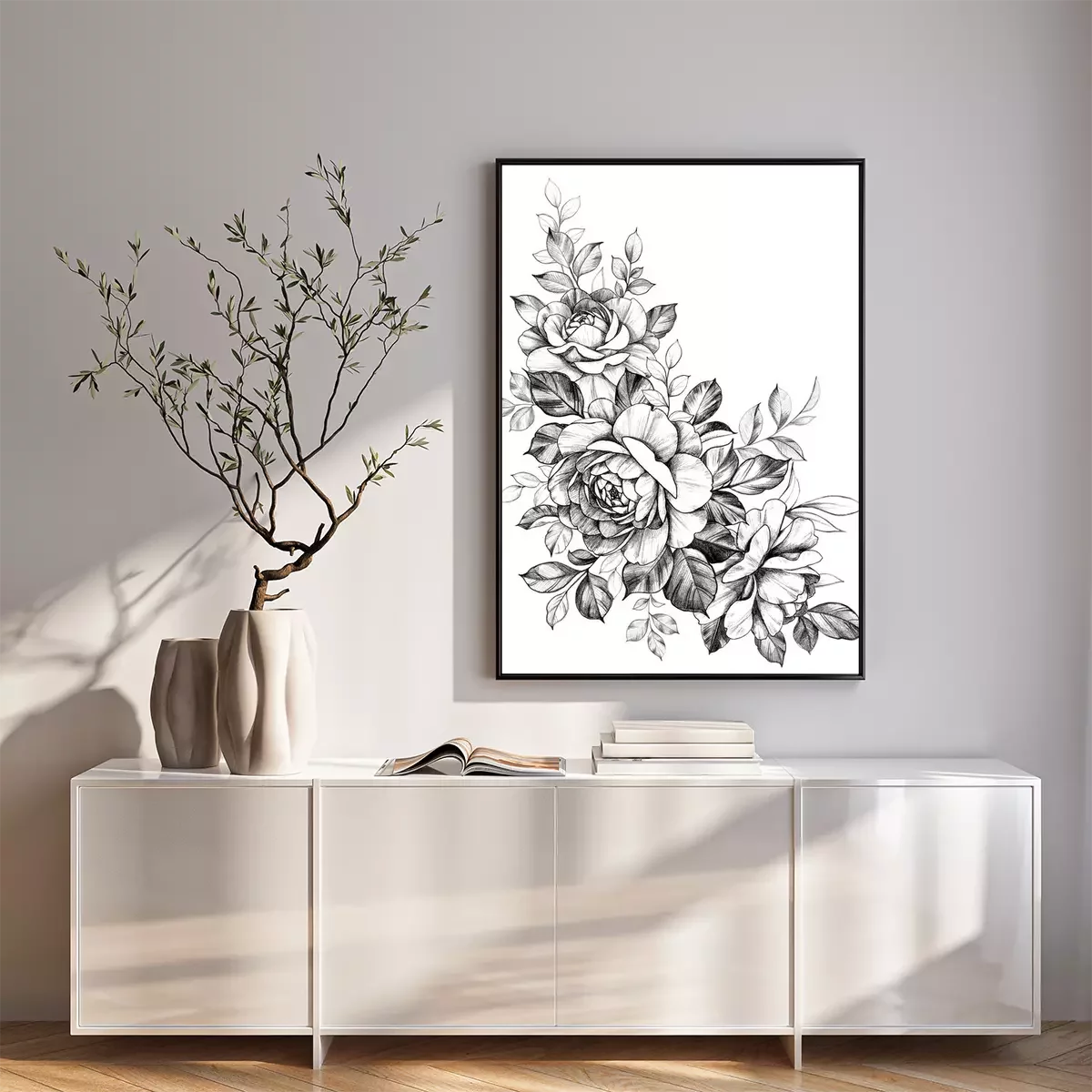 Poster: Zwart-wit takje met roze bloemen