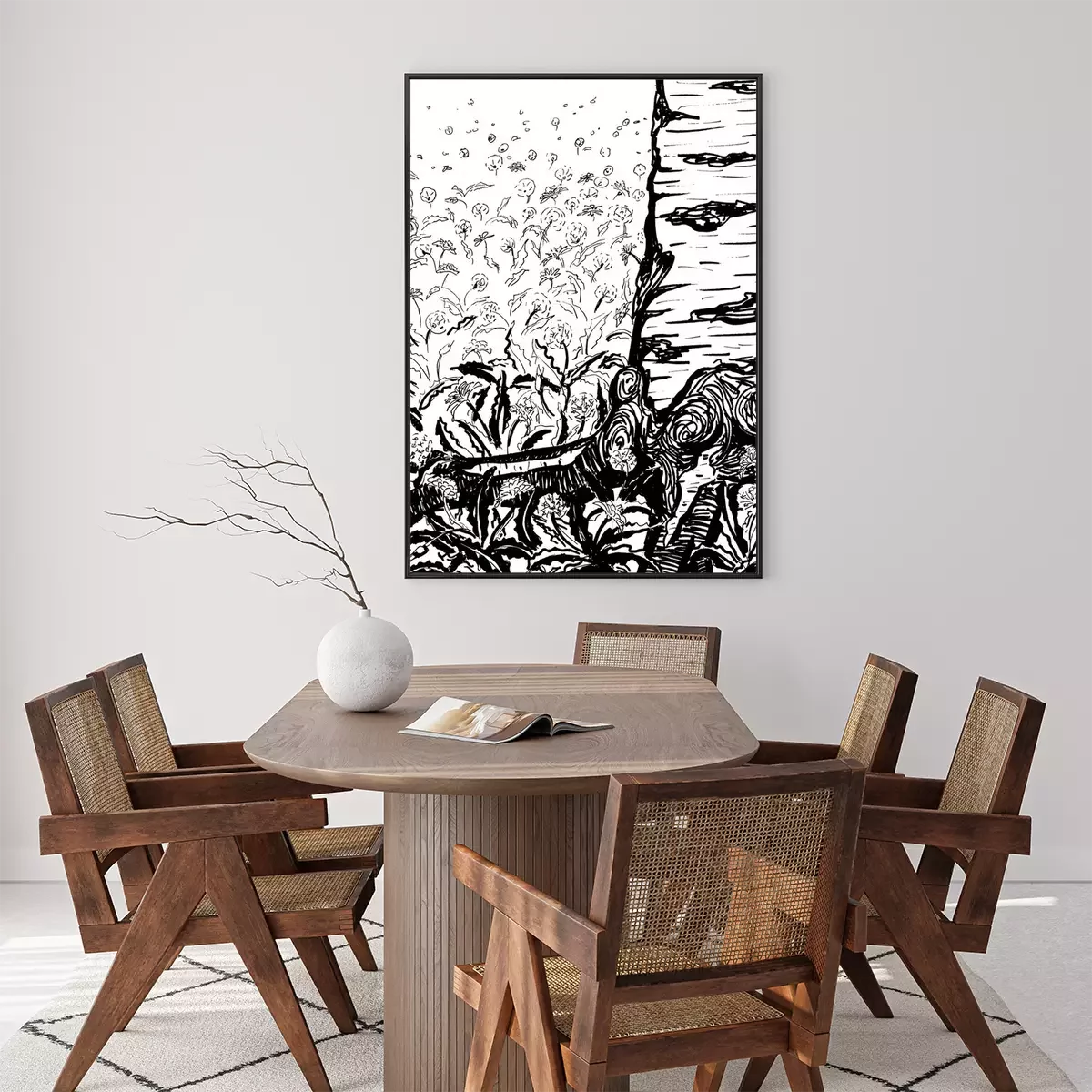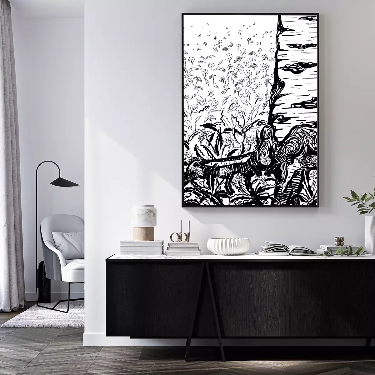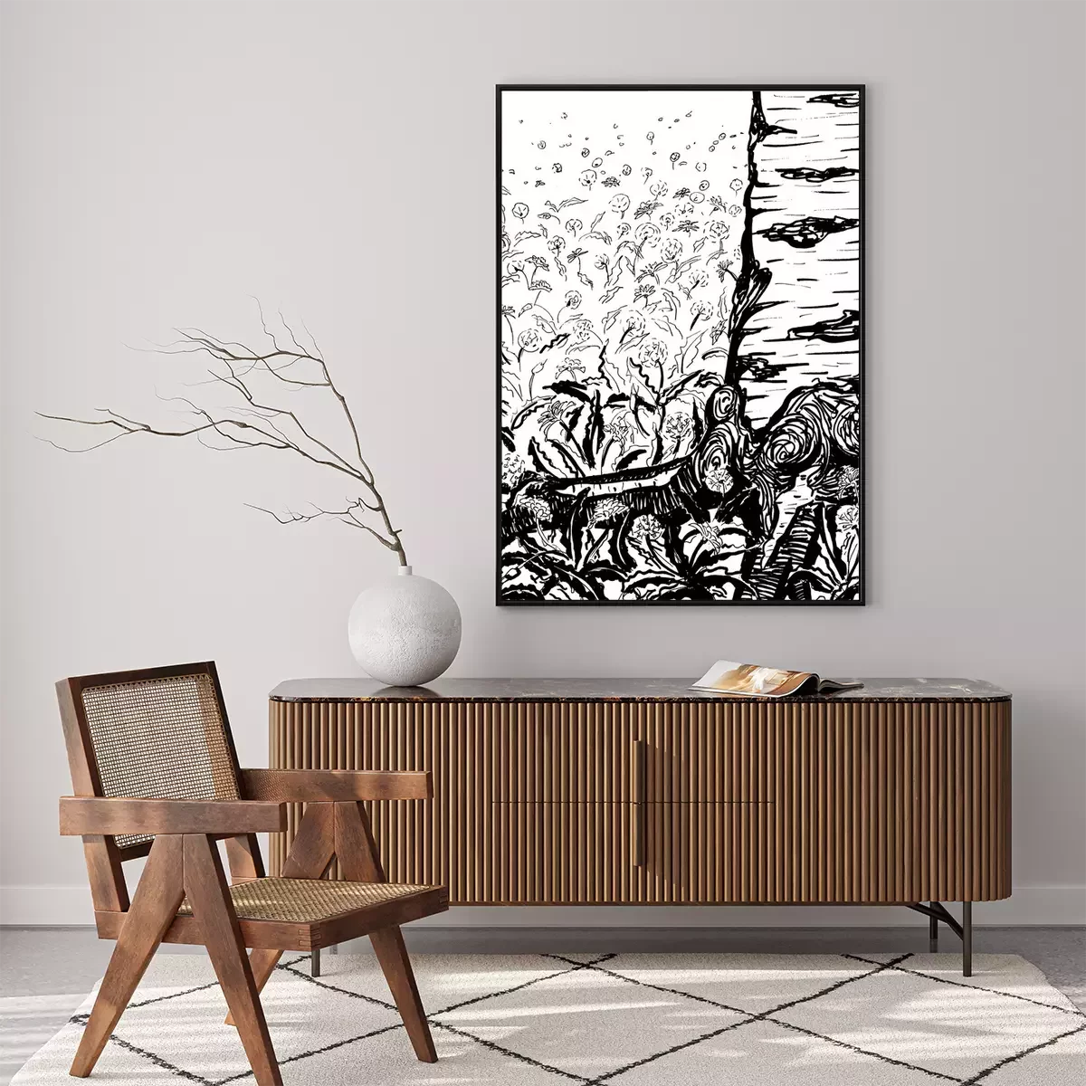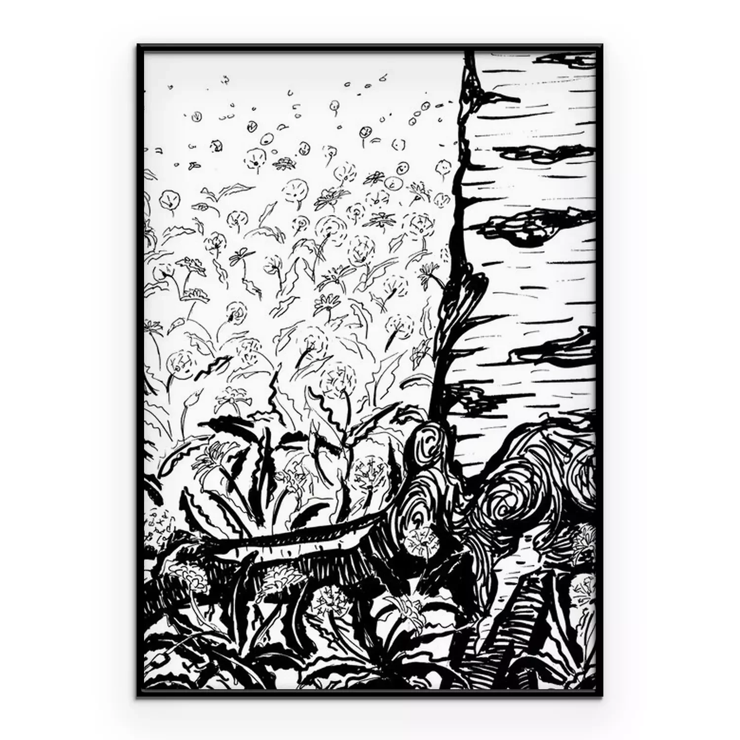 Poster: Zwart-wit tekening van berken