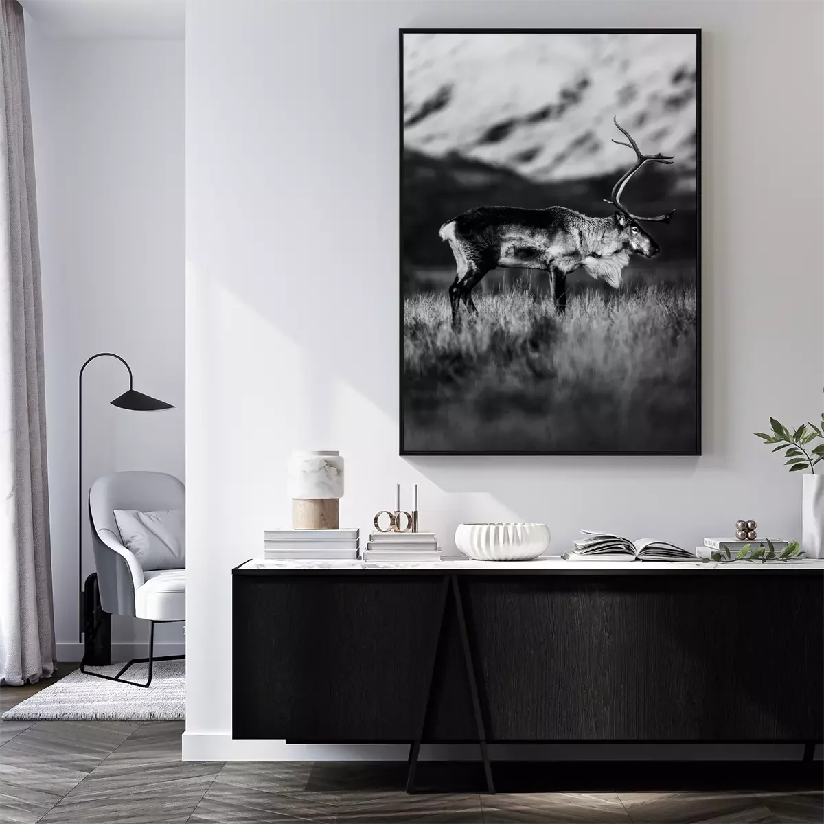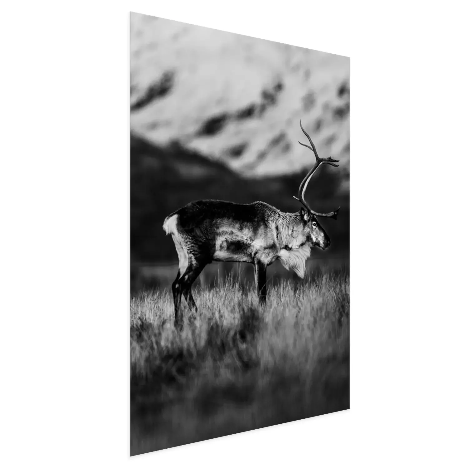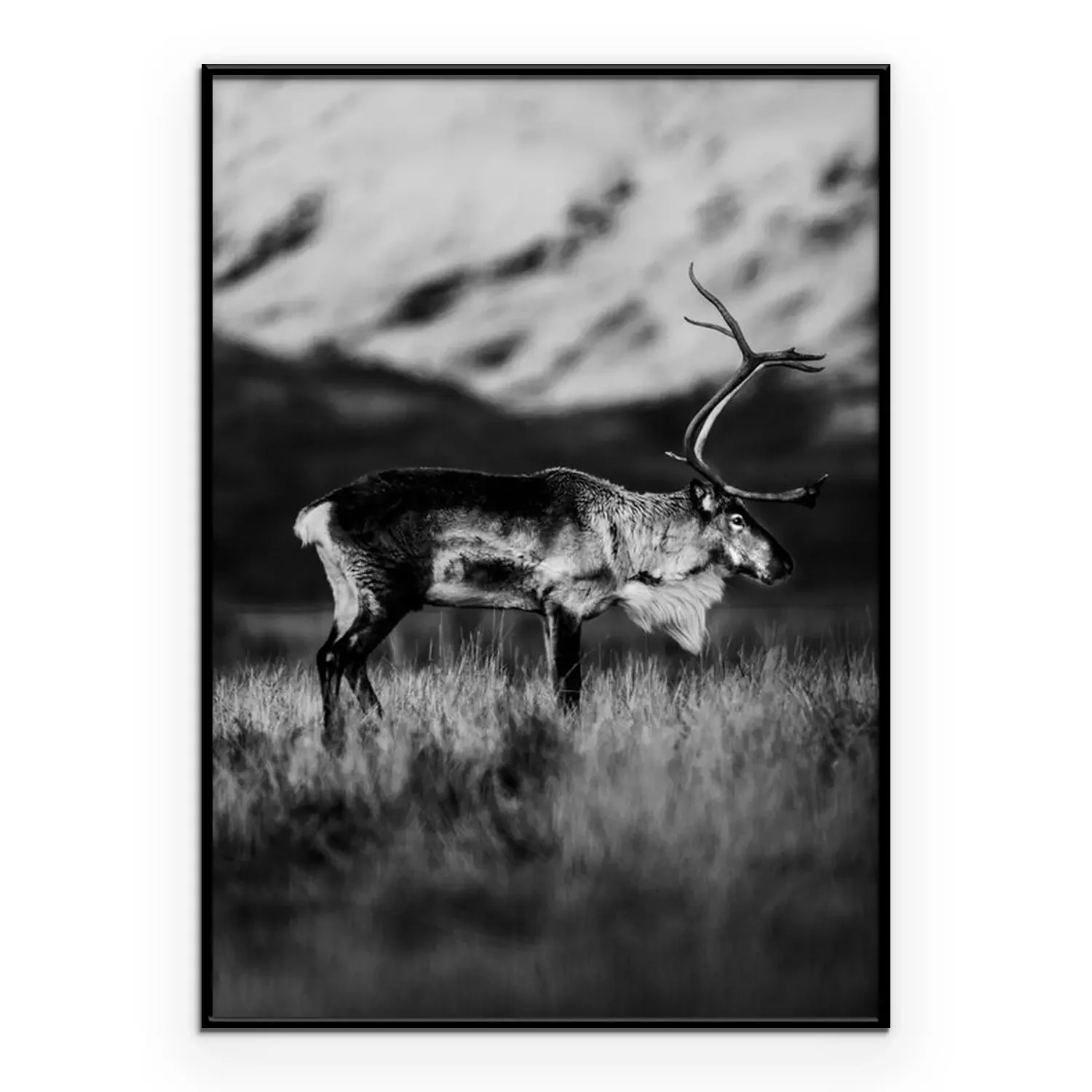 Poster: Zwart-witfoto van rendier op een bergweide