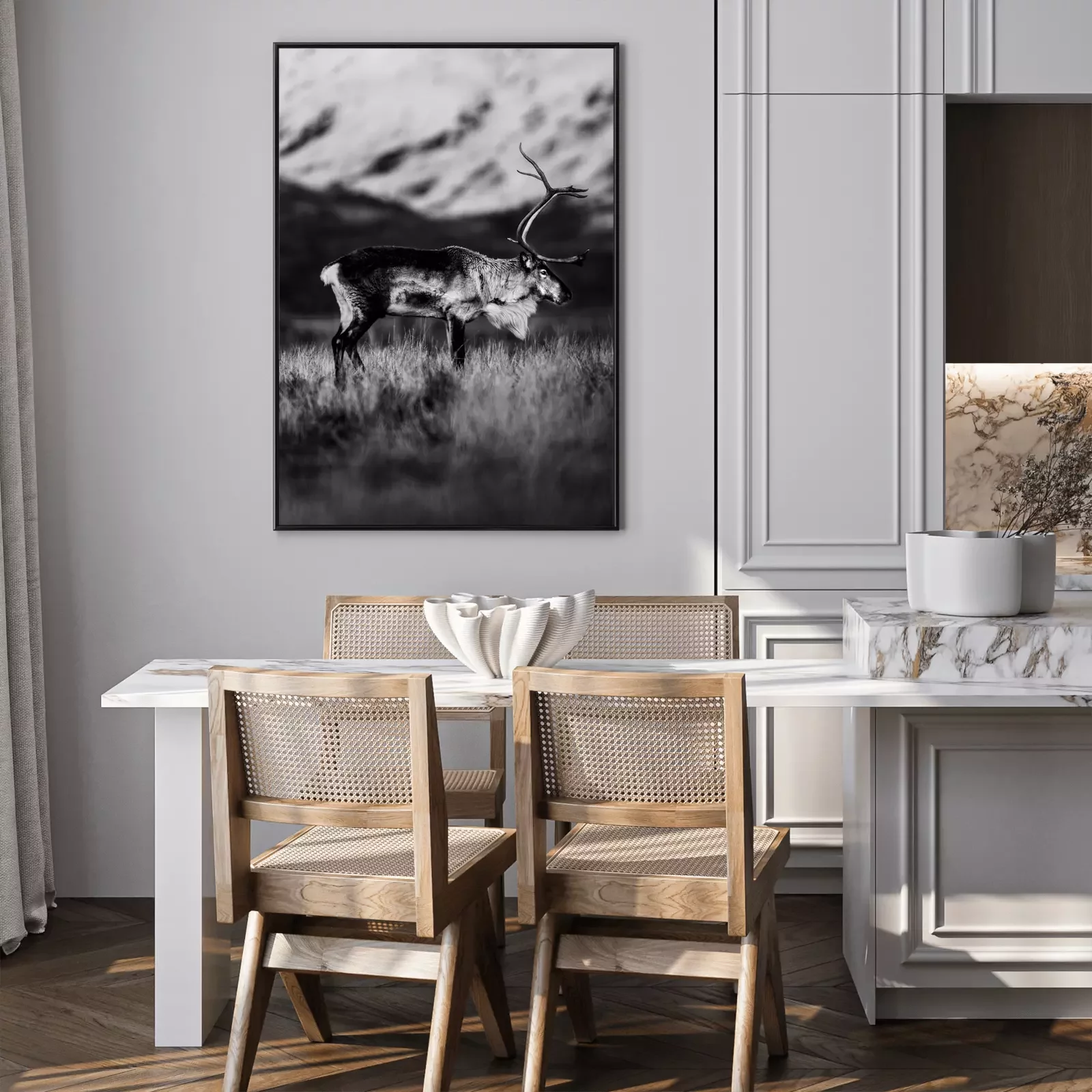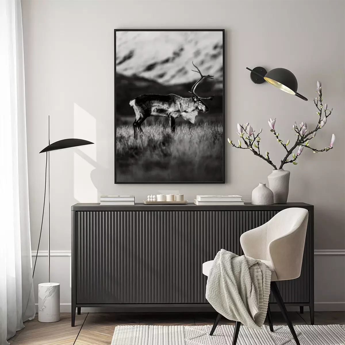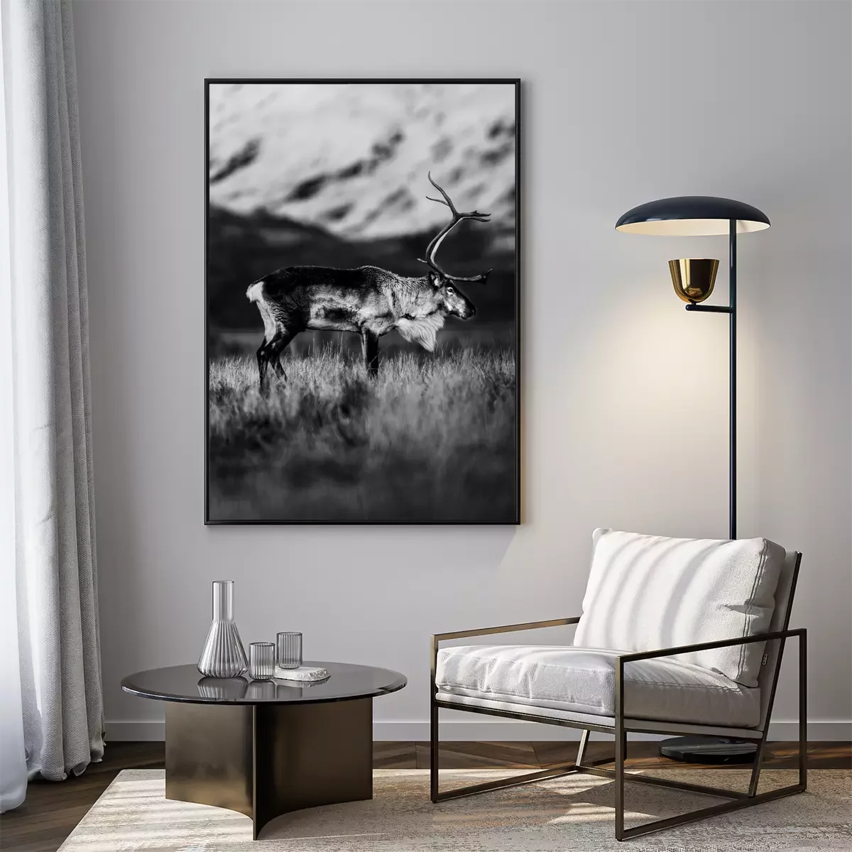Poster: Zwart-witfoto van rendier op een bergweide