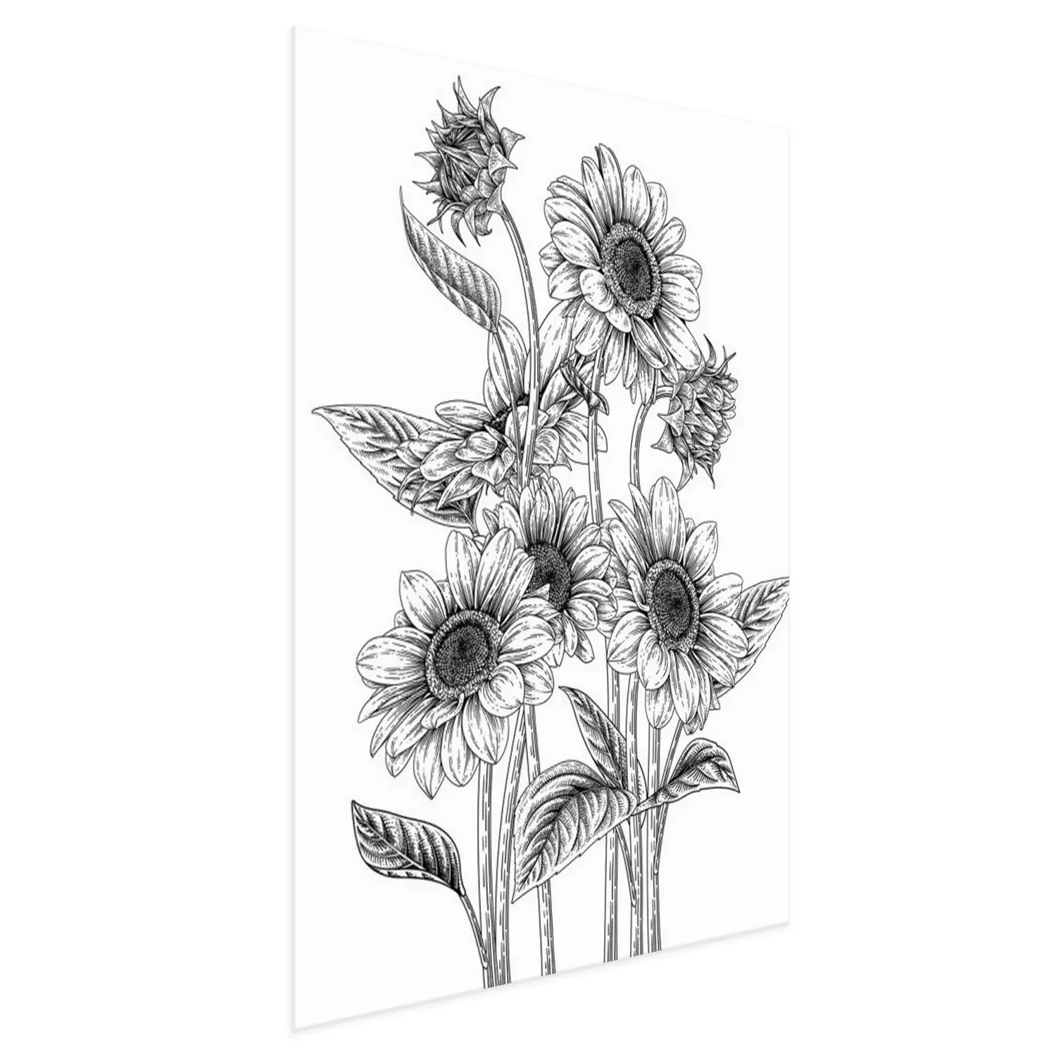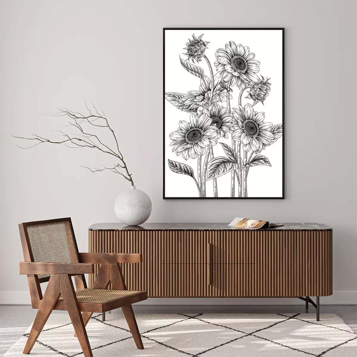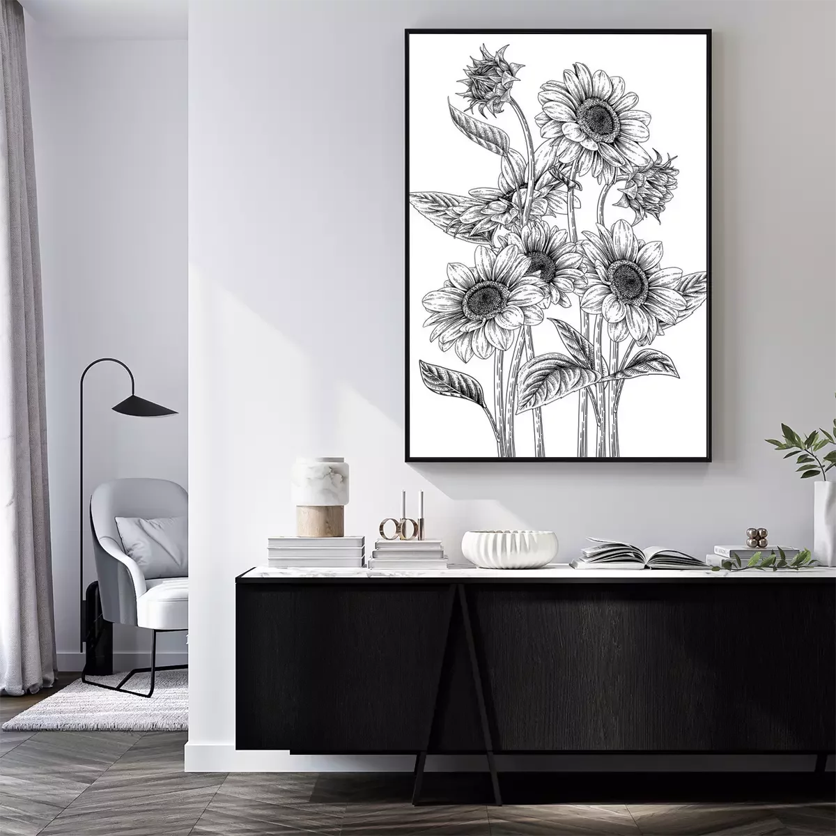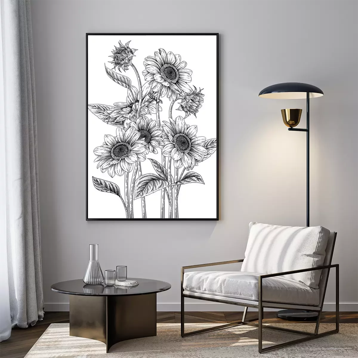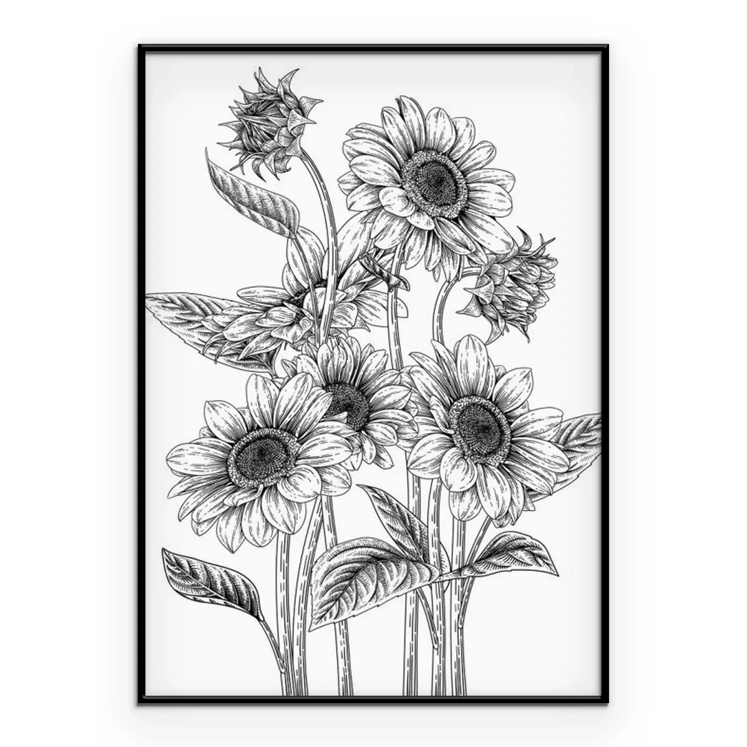 Poster: Zwart-witte zonnebloemgrafiek in schetsstijl