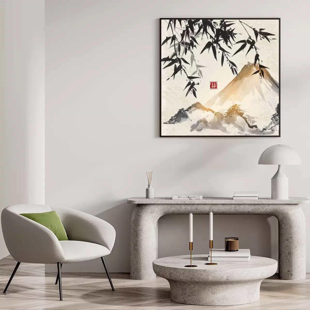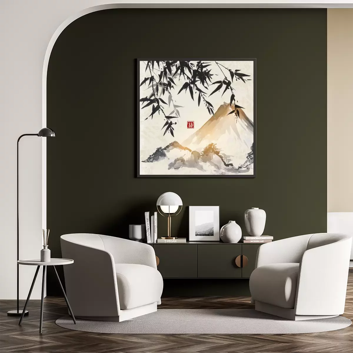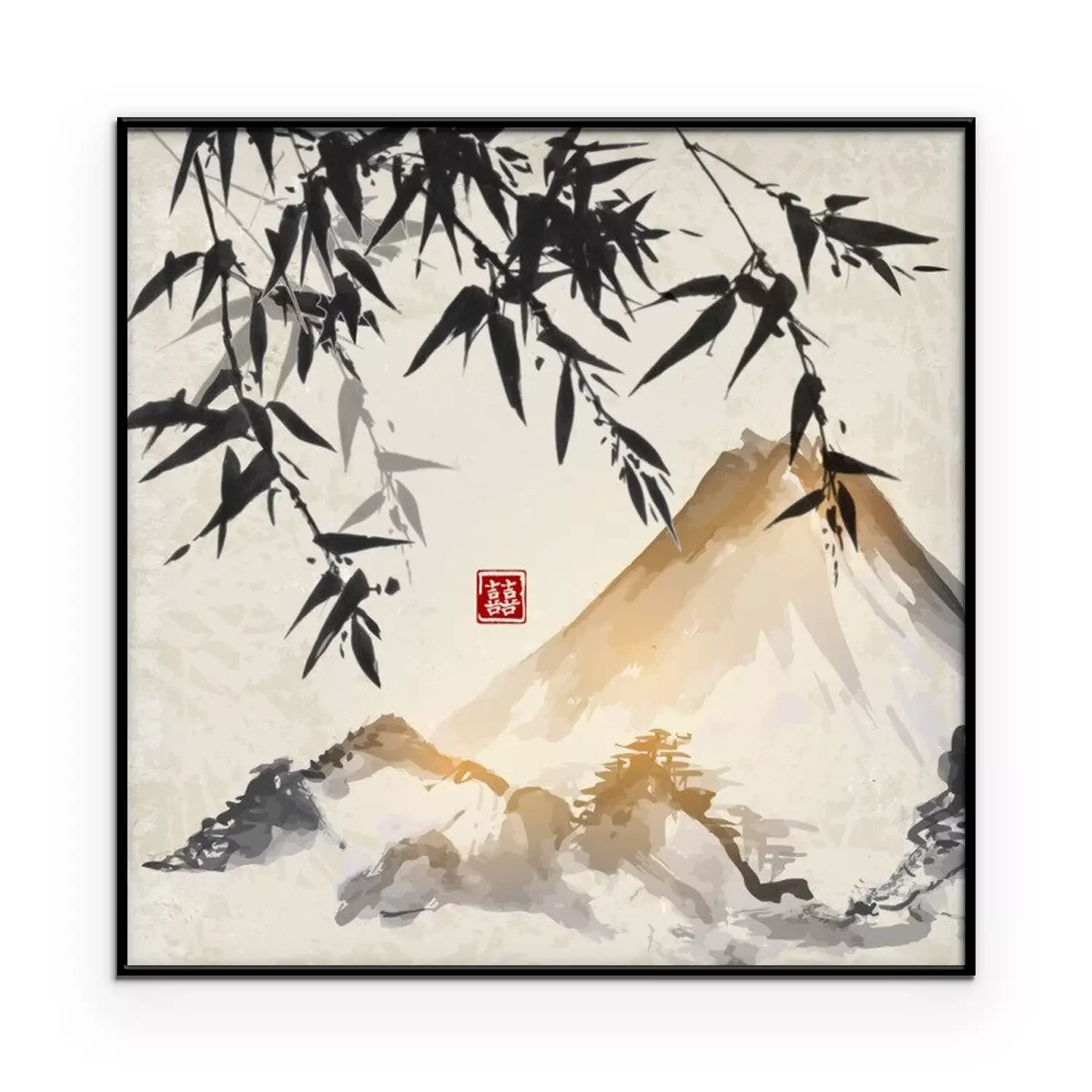 Poster: Zwarte bamboe op achtergrond van aquarel berg